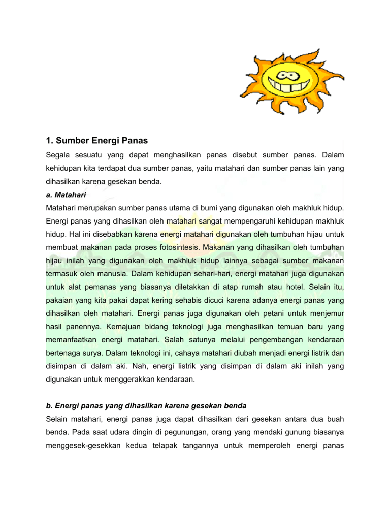 1. Sumber Energi Panas Segala sesuatu yang dapat menghasilkan panas disebut sumber panas. Dalam kehidupan kita terdapat dua sumber panas, yaitu matahari dan sumber panas lain yang dihasilkan karena gesekan benda. a. Matahari Matahari merupakan sumber panas utama di bumi yang digunakan oleh makhluk hidup. Energi panas yang dihasilkan oleh matahari sangat mempengaruhi kehidupan makhluk hidup. Hal ini disebabkan karena energi matahari digunakan oleh tumbuhan hijau untuk membuat makanan pada proses fotosintesis. Makanan yang dihasilkan oleh tumbuhan hijau inilah yang digunakan oleh makhluk hidup lainnya sebagai sumber makanan termasuk oleh manusia. Dalam kehidupan sehari-hari, energi matahari juga digunakan untuk alat pemanas yang biasanya diletakkan di atap rumah atau hotel. Selain itu, pakaian yang kita pakai dapat kering sehabis dicuci karena adanya energi panas yang dihasilkan oleh matahari. Energi panas juga digunakan oleh petani untuk menjemur hasil panennya. Kemajuan bidang teknologi juga menghasilkan temuan baru yang memanfaatkan energi matahari. Salah satunya melalui pengembangan kendaraan bertenaga surya. Dalam teknologi ini, cahaya matahari diubah menjadi energi listrik dan disimpan di dalam aki. Nah, energi listrik yang disimpan di dalam aki inilah yang digunakan untuk menggerakkan kendaraan. b. Energi panas yang dihasilkan karena gesekan benda Selain matahari, energi panas juga dapat dihasilkan dari gesekan antara dua buah benda. Pada saat udara dingin di pegunungan, orang yang mendaki gunung biasanya menggesek-gesekkan kedua telapak tangannya untuk memperoleh energi panas sehingga tubuhnya menjadi hangat. Pada jaman dahulu, nenek moyang kita biasa menggunakan kayu atau batu untuk memperoleh sumber panas berupa api. Caranya adalah dengan menggosok-gosokkan batu atau kayu tersebut. Gesekan yang terjadi dapat menimbulkan panas dan dihasilkan api sebagai sumber panas. Seiring dengan kemajuan teknologi, saat ini api dapat dengan mudah diperoleh. Kamu tentu tahu korek api. Dengan menggesekkan batang korek api pada bidang gesek, maka kamu akan mendapatkan api. Selain itu api dapat pula diperoleh dari gas, misalnya korek gas atau kompor gas. Namun saat menggunakan api, kalian harus hatihati. Agar lebih aman, mintalah bantuan kepada orang dewasa. Perpindahan Energi Panas Kamu akan merasa hangat jika berada di dekat api unggun. Hal ini disebabkan tubuhmu menerima energi panas dari api unggun tersebut. Panas yang berpindah disebut kalor. Api kompor dapat mematangkan makanan karena terdapat energi panas yang berpindah dari api ke makanan. Energi panas dapat berpindah melalui tiga cara, yaitu konduksi, konveksi, dan radiasi. a. Konduksi. Konduksi adalah peristiwa perambatan panas yang memerlukan suatu zat/medium tanpa disertai adanya perpindahan bagian-bagian zat/medium tersebut. Misalnya, sendok terasa panas saat digunakan untuk mengaduk kopi panas. b. Konveksi. Konveksi adalah perpindahan panas dengan disertai aliran zat perantaranya. Misalnya air yang panas akan bergerak naik. c. Radiasi. Radiasi adalah perpindahan panas tanpa medium perantara. Misalnya, panas matahari sampai ke bumi dan panas api dapat kita rasakan. Tahukah kamu Radiasi panas terbesar yang dapat kita rasakan adalah radiasi yang dihasilkan oleh matahari. Oleh karena itu, matahari merupakan sumber energi panas utama dalam kehidupan.