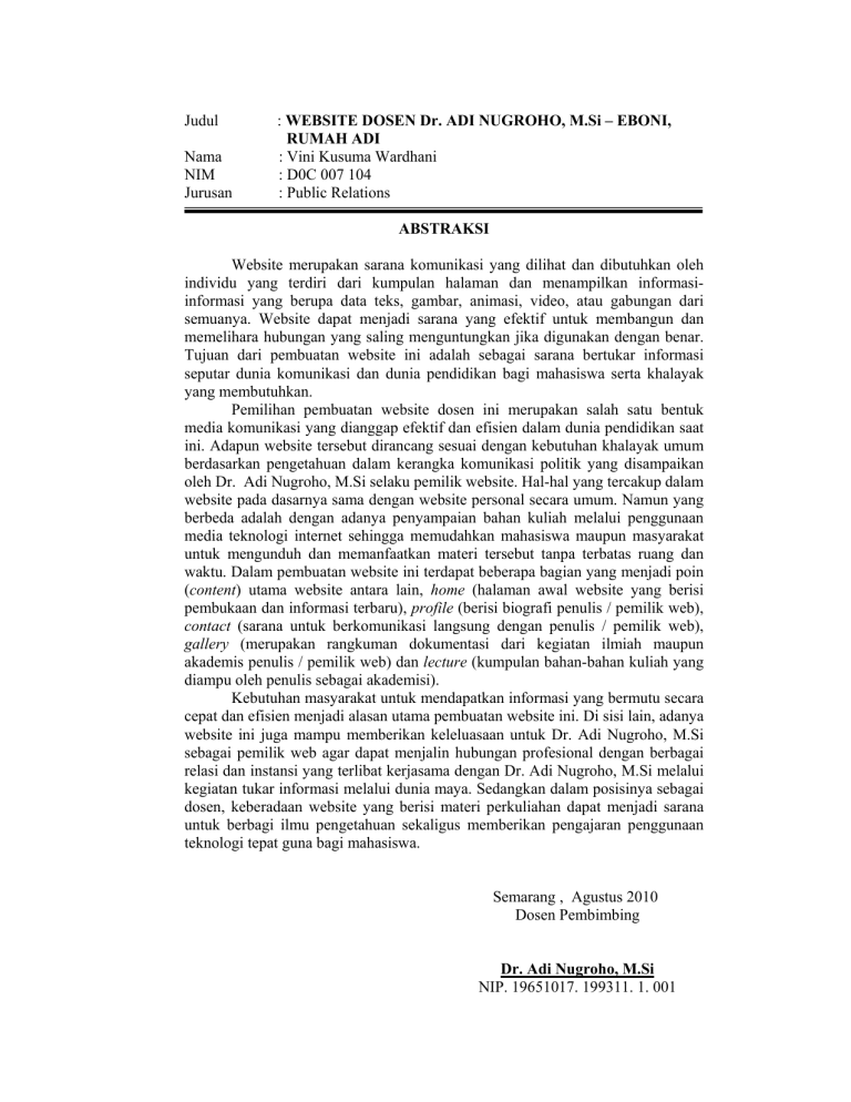 Judul Nama NIM Jurusan : WEBSITE DOSEN Dr. ADI NUGROHO, M.Si – EBONI, RUMAH ADI : Vini Kusuma Wardhani : D0C 007 104 : Public Relations ABSTRAKSI Website merupakan sarana komunikasi yang dilihat dan dibutuhkan oleh individu yang terdiri dari kumpulan halaman dan menampilkan informasiinformasi yang berupa data teks, gambar, animasi, video, atau gabungan dari semuanya. Website dapat menjadi sarana yang efektif untuk membangun dan memelihara hubungan yang saling menguntungkan jika digunakan dengan benar. Tujuan dari pembuatan website ini adalah sebagai sarana bertukar informasi seputar dunia komunikasi dan dunia pendidikan bagi mahasiswa serta khalayak yang membutuhkan. Pemilihan pembuatan website dosen ini merupakan salah satu bentuk media komunikasi yang dianggap efektif dan efisien dalam dunia pendidikan saat ini. Adapun website tersebut dirancang sesuai dengan kebutuhan khalayak umum berdasarkan pengetahuan dalam kerangka komunikasi politik yang disampaikan oleh Dr. Adi Nugroho, M.Si selaku pemilik website. Hal-hal yang tercakup dalam website pada dasarnya sama dengan website personal secara umum. Namun yang berbeda adalah dengan adanya penyampaian bahan kuliah melalui penggunaan media teknologi internet sehingga memudahkan mahasiswa maupun masyarakat untuk mengunduh dan memanfaatkan materi tersebut tanpa terbatas ruang dan waktu. Dalam pembuatan website ini terdapat beberapa bagian yang menjadi poin (content) utama website antara lain, home (halaman awal website yang berisi pembukaan dan informasi terbaru), profile (berisi biografi penulis / pemilik web), contact (sarana untuk berkomunikasi langsung dengan penulis / pemilik web), gallery (merupakan rangkuman dokumentasi dari kegiatan ilmiah maupun akademis penulis / pemilik web) dan lecture (kumpulan bahan-bahan kuliah yang diampu oleh penulis sebagai akademisi). Kebutuhan masyarakat untuk mendapatkan informasi yang bermutu secara cepat dan efisien menjadi alasan utama pembuatan website ini. Di sisi lain, adanya website ini juga mampu memberikan keleluasaan untuk Dr. Adi Nugroho, M.Si sebagai pemilik web agar dapat menjalin hubungan profesional dengan berbagai relasi dan instansi yang terlibat kerjasama dengan Dr. Adi Nugroho, M.Si melalui kegiatan tukar informasi melalui dunia maya. Sedangkan dalam posisinya sebagai dosen, keberadaan website yang berisi materi perkuliahan dapat menjadi sarana untuk berbagi ilmu pengetahuan sekaligus memberikan pengajaran penggunaan teknologi tepat guna bagi mahasiswa. Semarang , Agustus 2010 Dosen Pembimbing Dr. Adi Nugroho, M.Si NIP. 19651017. 199311. 1. 001