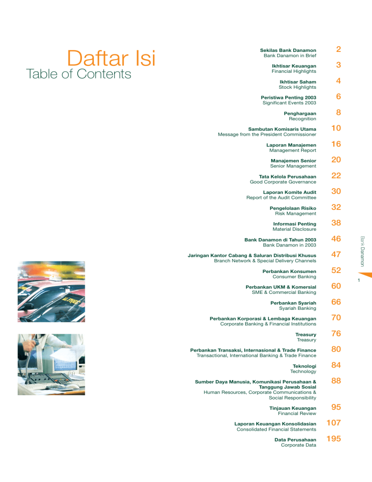 Daftar Isi Table of Contents Sekilas Bank Danamon Bank Danamon in Brief Ikhtisar Keuangan Financial Highlights Ikhtisar Saham Stock Highlights Peristiwa Penting 2003 Significant Events 2003 Penghargaan Recognition Sambutan Komisaris Utama Message from the President Commissioner Laporan Manajemen Management Report Manajemen Senior Senior Management Tata Kelola Perusahaan Good Corporate Governance Laporan Komite Audit Report of the Audit Committee Pengelolaan Risiko Risk Management Informasi Penting Material Disclosure Jaringan Kantor Cabang & Saluran Distribusi Khusus Branch Network & Special Delivery Channels Perbankan Konsumen Consumer Banking Perbankan UKM & Komersial SME & Commercial Banking Perbankan Syariah Syariah Banking Perbankan Korporasi & Lembaga Keuangan Corporate Banking & Financial Institutions Treasury Treasury Perbankan Transaksi, Internasional & Trade Finance Transactional, International Banking & Trade Finance Teknologi Technology Sumber Daya Manusia, Komunikasi Perusahaan & Tanggung Jawab Sosial Human Resources, Corporate Communications & Social Responsibility Tinjauan Keuangan Financial Review Laporan Keuangan Konsolidasian Consolidated Financial Statements Data Perusahaan Corporate Data 3 4 6 8 10 16 20 22 30 32 38 46 47 Bank Danamon Bank Danamon di Tahun 2003 Bank Danamon in 2003 2 52 1 60 66 70 76 80 84 88 95 107 195 Sekilas Bank Danamon Bank Danamon in Brief PT Bank Danamon Indonesia Tbk (Bank Danamon) was tahun 1956 dengan nama PT Bank Kopra Indonesia. Pada tahun established in 1956 under the name of PT Bank Kopra Indonesia. 1976 namanya dirubah menjadi Bank Danamon Indonesia, nama In 1976, the Bank’s name was changed to the present name, yang dipakai hingga kini. Bank Danamon menjadi bank devisa Bank Danamon Indonesia. The Bank became the first Indonesian swasta pertama di Indonesia pada tahun 1988 dan Perseroan private foreign exchange bank in 1988, and a publicly listed bank Terbuka pada tahun 1989. in 1989. Pada tahun 1997, sebagai akibat krisis moneter di Asia, In 1997, as a result of the Asian financial crisis, Bank Danamon Bank Danamon mengalami kesulitan likuiditas dan ditempatkan ran into liquidity insolvency and was placed under the supervision di bawah pengawasan Badan Penyehatan Perbankan Nasional of the Indonesian Bank Restructuring Agency (IBRA) as a BTO (BPPN) sebagai bank yang diambil alih (BTO). Pada tahun 1999, (taken over) bank. In 1999, the Government of Indonesia, through Pemerintah Indonesia melalui BPPN merekapitalisasi IBRA, recapitalised the Bank with Rp 32 trillion of government bonds. Within the same year, another BTO bank was merged into Saat itu juga, sebuah bank BTO lainnya dilebur ke Bank Danamon as part of the banking restructuring programme Bank Danamon sebagai bagian dari program restrukturisasi of IBRA. 2003 Annual Report PT Bank Danamon Indonesia Tbk (Bank Danamon) didirikan pada Bank Danamon dengan obligasi pemerintah senilai Rp 32 triliun. 2 Pada tahun 2000, delapan bank BTO lainnya dilebur ke dalam In 2000, Bank Danamon took under its wings eight other BTO Bank Danamon. Namun sebagai surviving entity, Bank Danamon banks. As the surviving entity, Bank Danamon emerged from the bangkit menjadi salah satu pilar perbankan nasional. merger as one of the pillar banks of Indonesia. Dalam kurun waktu tiga tahun berikutnya, Bank Danamon During the next three years, Bank Danamon underwent extensive melakukan restrukturisasi yang mencakup manajemen, sumber restructuring involving management, people, organisation, daya manusia, organisasi, sistem, nilai perilaku serta identitas systems, core values and corporate identity. The efforts perusahaan. Upaya ini berhasil meletakkan pondasi maupun succeeded in laying down new foundations and infrastructure for prasarana baru bagi Bank Danamon guna meraih pertumbuhan the Bank to pursue growth based on Transparency, berdasarkan Transparansi, Responsif, Integritas dan Responsiveness, Integrity and Professionalism (TRIP). perbankan oleh BPPN. Profesionalisme (TRIP). Pada tahun 2003, Bank Danamon diambil alih oleh Konsorsium In 2003, Bank Danamon was acquired by the Asia Financial Asia Financial Indonesia sebagai pemegang saham pengendali. Indonesia Consortium which took a majority controlling stake in Dengan kendali manajemen baru, serta didukung 180-hari the Bank. With new management at the helm, and a 180-day pemetaan model bisnis dan strategi baru, Bank Danamon terus remapping of its business model and strategy, Bank Danamon menjalani perubahan transformasional yang dirancang untuk continues to undergo a transformational change designed to menjadikannya suatu lembaga keuangan terkemuka. mold it into a leading financial institution. Ikhtisar Keuangan Financial Highlights Angka-angka pada seluruh tabel dan grafik menggunakan notasi Inggris (Miliar Rupiah, kecuali disebutkan lain) 2003 Numerical notations in all tables and graphs are in English 2002 2001 2000 1999 NERACA KONSOLIDASIAN Aktiva Aktiva Produktif Kredit yang Diberikan Kewajiban Berbunga Dana Pihak Ketiga Ekuitas Modal Disetor (Billion Rupiah, except stated otherwise) CONSOLIDATED BALANCE SHEET 52,682 49,855 22,718 42,306 39,800 6,822 3,562 46,911 43,461 18,197 38,315 34,898 4,652 3,562 52,680 47,321 10,477 42,984 39,799 4,171 3,562 62,168 56,553 5,631 48,707 30,501 4,528 3,562 Pendapatan Bunga 5,789 Beban Bunga (3,238) Pendapatan Bunga Bersih 2,551 Pendapatan Imbal Jasa 552 Jumlah Pendapatan Operasional 3,103 Beban Operasional (1,595) Pendapatan Operasional Bersih 1,508 Pendapatan (Beban) Non Recurring Bersih* 1,390 Laba (Rugi) Sebelum Beban Penyisihan Penghapusan 2,898 Beban Penyisihan Penghapusan (1,326) Laba (Rugi) Sebelum Pajak 1,572 Pajak Penghasilan (43) Hak Minoritas Laba Bersih 1,529 6,561 (4,824) 1,737 467 2,204 (1,117) 1,087 180 1,267 (278) 989 (41) 948 6,957 (5,419) 1,538 367 1,905 (960) 945 (188) 757 (3) 754 (32) 723 4,880 (3,802) 1,078 253 1,331 (773) 558 (118) 440 (134) 306 34 (1) 339 3,560 Interest Income (6,427) Interes