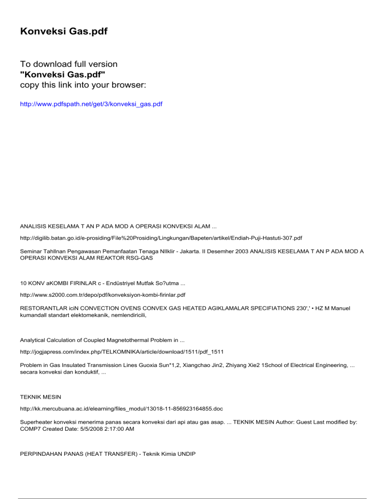 Konveksi Gas.pdf To download full version "Konveksi Gas.pdf" copy this link into your browser: http://www.pdfspath.net/get/3/konveksi_gas.pdf ANALISIS KESELAMA T AN P ADA MOD A OPERASI KONVEKSI ALAM ... http://digilib.batan.go.id/e-prosiding/File%20Prosiding/Lingkungan/Bapeten/artikel/Endiah-Puji-Hastuti-307.pdf Seminar Tahllnan Pengawasan Pemanfaatan Tenaga NlIklir - Jakarta. II Desemher 2003 ANALISIS KESELAMA T AN P ADA MOD A OPERASI KONVEKSI ALAM REAKTOR RSG-GAS 10 KONV aKOMBI FIRINLAR c - Endüstriyel Mutfak So?utma ... http://www.s2000.com.tr/depo/pdf/konveksiyon-kombi-firinlar.pdf RESTORANTLAR iciN CONVECTION OVENS CONVEX GAS HEATED AGIKLAMALAR SPECIFIATIONS 230',' • HZ M Manuel kumandall standart elektomekanik, nemlendiricili, Analytical Calculation of Coupled Magnetothermal Problem in ... http://jogjapress.com/index.php/TELKOMNIKA/article/download/1511/pdf_1511 Problem in Gas Insulated Transmission Lines Guoxia Sun*1,2, Xiangchao Jin2, Zhiyang Xie2 1School of Electrical Engineering, ... secara konveksi dan konduktif, ... TEKNIK MESIN http://kk.mercubuana.ac.id/elearning/files_modul/13018-11-856923164855.doc Superheater konveksi menerima panas secara konveksi dari api atau gas asap. ... TEKNIK MESIN Author: Guest Last modified by: COMP7 Created Date: 5/5/2008 2:17:00 AM PERPINDAHAN PANAS (HEAT TRANSFER) - Teknik Kimia UNDIP http://tekim.undip.ac.id/images/download/PERPINDAHAN_PANAS.pdf Konveksi, Radiasi). 2. Aplikasi perpindahan panas dalam Industri Dasar-dasar mempelajari perpindahan panas: ... berupa fluida (cairan/gas) Dasar : ... PENGGUNAAN SISTEM RESIRKULASI DALAM PENDEDERAN BENIH IKAN ... http://www.tedcbandung.com/tedc2011/pdf/jrnl_gurami.pdf BENIH IKAN GURAMI (Osphronemus gouramy ... gas (konveksi alami) mengalir melalui ... menghilangkan klorin dan gas-gas beracun lainnya dari dalam air. Dalam tahap BAB 5 PEMUAIAN - Staff Site Universitas Negeri Yogyakarta http://staff.uny.ac.id/sites/default/files/Fisika%20Dasar%20Prodi%20IPA%20(Pemuaian%20Zat).doc Konveksi dapat terjadi dalam zat cair dan gas. Radiasi adalah perpindahan kalor tanpa melalui zat perantara. SOAL-SOAL. Pilihan Ganda. Petunjuk: Pilihlah satu jawaban ... kk.mercubuana.ac.id http://kk.mercubuana.ac.id/elearning/files_modul/13015-5-801362763945.doc Proses perpindahan/penyerapan yang terjadi hanyalah proses konveksi dan konduksi dari gas buang turbin gas ke dalam air ... Gas pembakaran yang bertemperatur ... Kalor lebur Kapasitas KALOR http://nevianwijaya.files.wordpress.com/2010/06/microsoft-word-modul-kalor.pdf Konveksi pada gas, seperti udara, terjadi ketika udara panas naik dan udara yang lebih dingin turun. 3. Radiasi Perpindahan kalor tanpa melalui zat perantara ... LEMBAR KERJA SISWA “PERPINDAHANKALOR” http://eprints.uny.ac.id/9529/19/17.%20LKS%20KONTROL%201.pdf 184 C. ALAT 1. Alat konveksi gas. 2. Korek api. 3. Termometer. D. BAHAN 1. Obat nyamuk. 2. Lilin. E. CARA KERJA 1. Siapkan alat konveksi gas yang telah tersedia. Related eBooks: Acrostic Poem For Diversity 31as6bce799 Manual Abraham Bible Lesson Abuse And Substance Use Intake Report Acrp Clinical Research Coordinator Certification Exam Abraham Lincoln Kindergarten Poem Acrostic Poem For Intersection Accounting Information Systems And Internal Control Accp Competition Practice Acrostic About Reformation Powered by TCPDF (www.tcpdf.org)