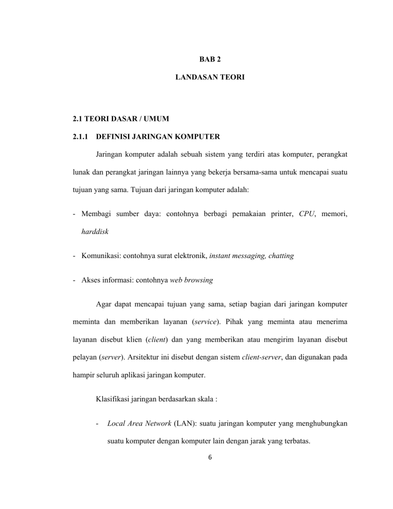 BAB 2 LANDASAN TEORI 2.1 TEORI DASAR / UMUM 2.1.1 DEFINISI JARINGAN KOMPUTER Jaringan komputer adalah sebuah sistem yang terdiri atas komputer, perangkat lunak dan perangkat jaringan lainnya yang bekerja bersama-sama untuk mencapai suatu tujuan yang sama. Tujuan dari jaringan komputer adalah: - Membagi sumber daya: contohnya berbagi pemakaian printer, CPU, memori, harddisk - Komunikasi: contohnya surat elektronik, instant messaging, chatting - Akses informasi: contohnya web browsing Agar dapat mencapai tujuan yang sama, setiap bagian dari jaringan komputer meminta dan memberikan layanan (service). Pihak yang meminta atau menerima layanan disebut klien (client) dan yang memberikan atau mengirim layanan disebut pelayan (server). Arsitektur ini disebut dengan sistem client-server, dan digunakan pada hampir seluruh aplikasi jaringan komputer. Klasifikasi jaringan berdasarkan skala : - Local Area Network (LAN): suatu jaringan komputer yang menghubungkan suatu komputer dengan komputer lain dengan jarak yang terbatas. 6 7 - Metropolitan Area Network (MAN): prinsip sama dengan LAN, hanya saja jaraknya lebih luas, yaitu 10-50 km. - Wide Area Network (WAN): jaraknya antar kota, negara, dan benua. ini sama dengan internet. 2.1.2 AWAL BERDIRINYA CISCO Pada awal 1980-an, ada sepasang suami istri yaitu Len dan Sandy Bosack yang dulu bekerja di dua departemen komputer yang berbeda yang terletak di Stanford University. Pasangan ini sedang menghadapi masalah dalam membuat komputer mereka berkomunikasi satu sama lain. Untuk mengatasi masalah ini, mereka membuat sebuah server gateway di ruang tamu mereka yang menuju cara sederhana membuat dua departemen berkomunikasi satu sama lain dengan bantuan protokol IP. Mereka mendirikan cisco Systems (dengan c kecil) pada tahun 1984, memiliki server gateway komersial kecil yang membawa sebuah revolusi dalam Networking. Nama perusahaan diubah menjadi Cisco Systems, Inc pada tahun 1992. Advanced Gateway Server (AGS) adalah produk pertama yang dipasarkan perusahaan. Setelah ini datang Mid-Range Gateway Server (MGS), Compact Gateway Server (cgs), Integrated Gateway Server (IGS)danAGS+. Akhirnya menciptakan router cisco 4000, 7000, 2000, dan 3000 series. Router ini masih ada dan meningkatkan setiap hari. Cisco adalah pemimpin besar dunia ketika datang ke jaringan untuk Internet. Produk perusahaan ini mengarah pada kemudahan dalam mengakses dan mentransfer informasi terlepas dari perbedaan waktu, tempat atau platform. 7 8 Cisco juga memasok berbagai besar produk-produk perangkat keras yang menciptakan jaringan informasi dengan bantuan dari Cisco Internetwork Operating System (IOS) perangkat lunak. IOS memberikan layanan jaringan dan membuat rute untuk jaringan dan layanan dukungan teknis. Program lain yang dibuat oleh Cisco untuk membantu jumlah besar perangkat keras adalah Cisco Certified Internetwork Expert (CCIE) program. CCIE membantu dalam mengelola jumlah besar terpasang jaringan Cisco. Program yang CCIE membantu dalam membuat orang-orang yang mengurus jaringan rumit. Cisco masih memantau program ini terus-menerus dalam rangka untuk melakukan transisi yang mungkin diperlukan untuk memenuhi kebutuhan sehari-hari tempat-tempat bisnis internetworking. Karena program CCIE sangat sukses, Anda dapat disertifikasi dalam merancang jaringan dan dukungan dengan bantuan dari Cisco Career Certifications. http://www.cisco.com/ 2.1.3 TOPOLOGI JARINGAN KOMPUTER Topologi jaringan adalah, hal yang menjelaskan hubungan geometris antara unsur-unsur dasar penyusun jaringan, yaitu node, link, dan station. Topologi jaringan dapat dibagi menjadi 5 kategori utama seperti di bawah ini : - Topologi bintang - Topologi mesh - Topologi cincin - Topologi pohon - Topologi bus 8 9 1. Topologi Bus Pada topologi bus dua unjung jaringan harus diakhiri dengan sebuah terminator. Barel connector dapat digunakan untuk memperluasnya. Jaringan hanya terdiri dari satu saluran kabel yang menggunakan kabel BNC. Komputer yang ingin terhubung ke jaringan dapat mengkaitkan dirinya dengan mentap Ethernetnya sepanjang kabel. Linear Bus: Layout ini termasuk layout yang umum. Satu kabel utama menghubungkan tiap simpul, ke saluran tunggal komputer yang mengaksesnya ujung dengan ujung. Masing-masing simpul dihubungkan ke dua simpul lainnya, kecuali mesin di salah satu ujung kabel, yang masing-masing hanya terhubung ke satu simpul lainnya. Topologi ini seringkali dijumpai pada sistem client/server, dimana salah satu mesin pada jaringan tersebut difungsikan sebagai File Server, yang berarti bahwa mesin tersebut dikhususkan hanya untuk pendistribusian data dan biasanya tidak digunakan untuk pemrosesan informasi. Gambar 2.1 Topologi Bus http://teknik-informatika.com/images/jaringan-komputer/1010-prinsip-topologi-bus.jpg 10 2. Topologi Ring Topologi Ring adalah topologi jaringan berbentuk rangkaian titik yang masingmasing terhubung ke dua titik lainnya, sedemikian sehingga membentuk jalur melingkar membentuk Ring. Pada topologi Ring, komunikasi data dapat terganggu jika satu titik mengalami gangguan. Jaringan FDDI mengantisipasi kelemahan ini dengan mengirim data searah jarum jam dan berlawanan dengan arah jarum jam secara bersamaan. Gambar 2.2 Topologi Ring http://teknik-informatika.com/images/jaringan-komputer/1013-prinsip-koneksi-topologiring.jpg 11 3. Topologi Star Topologi bintang merupakan bentuk topologi jaringan yang berupa konvergensi dari node tengah ke setiap node atau pengguna. Topologi jaringan bintang termasuk topologi jaringan dengan biaya menengah. Gambar 2.3 Topologi Star http://teknik-informatika.com/images/jaringan-komputer/1014-prinsip-koneksi-topologistar.jpg 4. Topologi Mesh Topologi jala atau Topologi mesh adalah suatu bentuk hubungan antar perangkat dimana setiap perangkat terhubung secara langsung ke perangkat lainnya yang ada di dalam jaringan. Akibatnya, dalam topologi mesh setiap perangkat dapat berkomunikasi langsung dengan perangkat yang dituju (dedicated links). 12 Dengan demikian maksimal ba