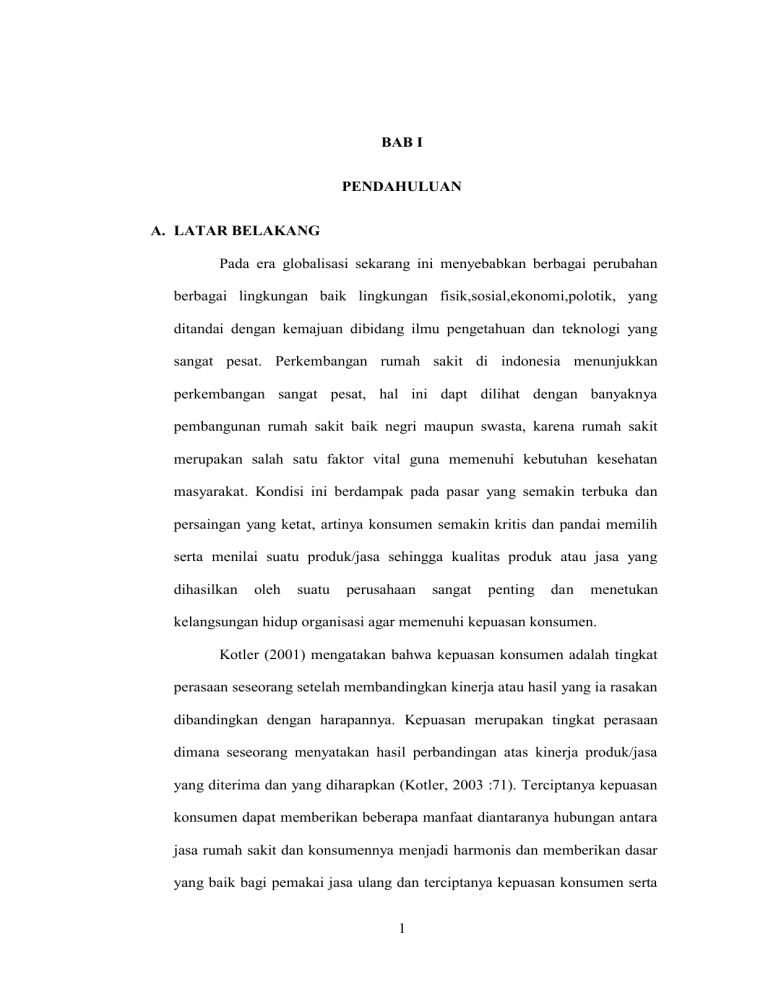 BAB I PENDAHULUAN A. LATAR BELAKANG Pada era globalisasi sekarang ini menyebabkan berbagai perubahan berbagai lingkungan baik lingkungan fisik,sosial,ekonomi,polotik, yang ditandai dengan kemajuan dibidang ilmu pengetahuan dan teknologi yang sangat pesat. Perkembangan rumah sakit di indonesia menunjukkan perkembangan sangat pesat, hal ini dapt dilihat dengan banyaknya pembangunan rumah sakit baik negri maupun swasta, karena rumah sakit merupakan salah satu faktor vital guna memenuhi kebutuhan kesehatan masyarakat. Kondisi ini berdampak pada pasar yang semakin terbuka dan persaingan yang ketat, artinya konsumen semakin kritis dan pandai memilih serta menilai suatu produk/jasa sehingga kualitas produk atau jasa yang dihasilkan oleh suatu perusahaan sangat penting dan menetukan kelangsungan hidup organisasi agar memenuhi kepuasan konsumen. Kotler (2001) mengatakan bahwa kepuasan konsumen adalah tingkat perasaan seseorang setelah membandingkan kinerja atau hasil yang ia rasakan dibandingkan dengan harapannya. Kepuasan merupakan tingkat perasaan dimana seseorang menyatakan hasil perbandingan atas kinerja produk/jasa yang diterima dan yang diharapkan (Kotler, 2003 :71). Terciptanya kepuasan konsumen dapat memberikan beberapa manfaat diantaranya hubungan antara jasa rumah sakit dan konsumennya menjadi harmonis dan memberikan dasar yang baik bagi pemakai jasa ulang dan terciptanya kepuasan konsumen serta 1 2 terbentuknya rekomendasi dari mulut ke mulut (word of mouth) yang dapat menguntungkan bagi perusahaan (Tjiptono, 2003: 34) Fasilitas merupakan segala sesuatu yang memudahkan konsumen dalam menggunakan jasa perusahaan tersebut. Fasilitas adalah sumber daya fisik yang ada dalam sebelum suatu jasa dapat ditawarkan kepada konsumen (Tjiptono,1997). Fasilitas merupakan segala sesuatu yang memudahkan konsumen dalam usaha yang bergerak dibidang jasa, maka segala fasilitas yang ada yaitu kondisi fasilitas, kelengkapan, desain interior dan eksterior serta kebersihan fasilitas harus diperhatikan terutama yang berkaitan erat dengan apa yang dirasakan atau didapat konsumen secara langsung. Kotler & Keller (2006) mendefinisikan fasilitas yaitu segala sesuatu yang bersifat peralatan fisik dan disediakan oleh pihak penjual jasa untuk mendukung kenyamanan konsumen. Zeithaml (2000) harga adalah apa yang kita dapat dari sesuatu yang telah dikorbankan untuk memperoleh produk atau jasa. Sedangkan Kotler dan Amstrong (2006) berpendapat bahwa harga adalah sejumlah uang yang dibebankan suatu produk atau jasa tersebut. Produk dengan mutu jelek, harga yang mahal, penyerahan produk yang lambat dapat membuat pelanggan tidak puas. Hal itu menunjukkan bahwa harga merupakan salah satu penyebab ketidakpuasan para pelanggan. Tjiptono (2007) mendefinisikan harga dari dua sudut pandang, yaitu dari sudut pandang pemasaran, harga merupakan satuan moneter atau ukuran lainnya (termasuk barang dan jasa lainnya) yang ditukarkan agar memperoleh hak kepemilikan atau penggunaan suatu barang 3 atau jasa. Sementar itu, dari sudut pandang konsumen, harga seringkali digunakan sebagai indicator nilai bilamana harga tersebut dihubungkan dengan manfaat yang dirasakan atas suatu barang atau jasa. Nilai dapat didefinisikan sebagai rasio antara manfaat yang dirasakan terhadap harga. Harga sering kali menjadikan sebagai indikator kualitas jasa bagi konsumen. Misalnya dengan biaya yang tinggi konsumen akan mendapat pelayanan yang berkualitas. Sebaliknya konsumen dengan biaya rendah sering mendapat pelayanan yang tidak memuaskan. Harga dapat mempengaruhi market sharenya dan jasa juga dapat mempengaruhi posisi persaingan perusahaan. Selain harga perusahaan juga harus memperhatikan peningkatan fasilitas. Fasilitas yang baik dan lengkap merupakan daya tarik tersendiri bagi konsumen dalam menentukan pilihannya. Fasilitas biasanya dipengaruhi oleh tingkat harga, artinya kenaikan atau penambahan fasilitas dalam perusahaan akan menyebabkan meningkatnya harga. Sebaliknya fasilitas yang tidak memadai yang tidak di sesuaikan dengan harga mendorong kearah kegagalan perusahaan karena konsumen dapat mengurungkan niatnya untuk datang ke perusahaan tersebut. Kualitas pelayanan dapat diartikan sebagai upaya pemenuhan kebutuhan dan keinginan konsumen serta ketepatan penyampaiannya dalam mengimbangi harapan konsumen (Tjiptono, 2007).Kotler (1995) mengatakan bahwa banyak faktor yang dipertimbangkan untuk memilih, akan tetapi salah satu cara untuk menarik pelanggan dan memenangkan persaingan adalah dengan cara memberikan jasa pelayanan yang sesuai dengan keinginan 4 pelanggan yang dapat memberikan kepuasan. Organisasi yang tidak berkualitas dalam memberikan pelayanan akan ketinggalan dan terlindas dalam persaingan bisnis. Maka dari itu, perusahaan harus selalu berusaha meningkatkan mutu pelayanan yang berorientasi kepada kepuasan pelanggan agar dapat bersaing secara sehat dengan perusahaan perusahaan yang lainnya dengan cara selalu berusaha memberikan produk dengan mutu yang lebih baik, harga bersaing, penyerahan produk lebih cepat dan pelayanan yang lebih baik dari pada pesaingnya. Produk dengan kualitas yang jelek, harga yang mahal, penyerahan produk yang lambat dan cara pemberian pelayanan yang kurang baik dapat menimbulkan rasa tidak puas kepada pelanggannya yang pada akhirnya tidak akan menggunakan produk tersebut di kemudian hari (Suprapto, 2001 dalam Martianawati, 2009). Hal tersebut bisa menunjukkan bahwa harga merupakan salah satu penyebab ketidakpuasan para pelanggan. Adanya kesesuaian antara harga dan produk atau jasa dapat membuat kepuasan bagi pelanggan. Jika pelanggan tidak puas, maka akan meninggalkan perusahaan yang akan menyebabkan penurunan penjualan dan selanjutnya akan menurunkan laba bahkan kerugian bagi perusahaan . Dari keseluruhan kegiatan yang dilakukan oleh sebuah perusahaan pada akhirnya akan bermuara pada nilai yang akan diberikan oleh pelanggan mengenai kepuasan yang dirasakan. Kepuasan yang sesungguhnya dirasakan pelanggan sebenarnya ada