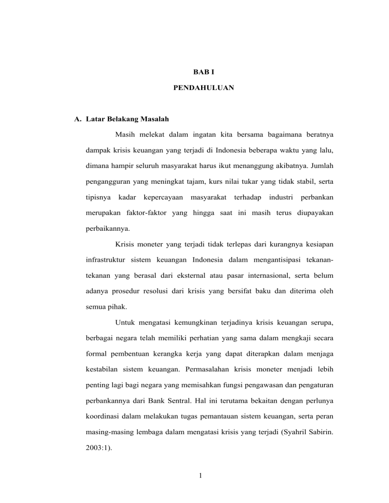 BAB I PENDAHULUAN A. Latar Belakang Masalah Masih melekat dalam ingatan kita bersama bagaimana beratnya dampak krisis keuangan yang terjadi di Indonesia beberapa waktu yang lalu, dimana hampir seluruh masyarakat harus ikut menanggung akibatnya. Jumlah pengangguran yang meningkat tajam, kurs nilai tukar yang tidak stabil, serta tipisnya kadar kepercayaan masyarakat terhadap industri perbankan merupakan faktor-faktor yang hingga saat ini masih terus diupayakan perbaikannya. Krisis moneter yang terjadi tidak terlepas dari kurangnya kesiapan infrastruktur sistem keuangan Indonesia dalam mengantisipasi tekanantekanan yang berasal dari eksternal atau pasar internasional, serta belum adanya prosedur resolusi dari krisis yang bersifat baku dan diterima oleh semua pihak. Untuk mengatasi kemungkinan terjadinya krisis keuangan serupa, berbagai negara telah memiliki perhatian yang sama dalam mengkaji secara formal pembentuan kerangka kerja yang dapat diterapkan dalam menjaga kestabilan sistem keuangan. Permasalahan krisis moneter menjadi lebih penting lagi bagi negara yang memisahkan fungsi pengawasan dan pengaturan perbankannya dari Bank Sentral. Hal ini terutama bekaitan dengan perlunya koordinasi dalam melakukan tugas pemantauan sistem keuangan, serta peran masing-masing lembaga dalam mengatasi krisis yang terjadi (Syahril Sabirin. 2003:1). 1 2 Sesuai dengan UU BI No 23/1999 pasal 7, fokus utama kebijakan moneter BI adalah mencapai dan memelihara kestabilan nilai rupiah. Dalam tujuan ini, secara implisit terkandung pengertian kestabilan harga (laju inflasi) dan nilai tukar rupiah sebagai sasaran akhir yang hendak dicapai. Untuk mencapai tujuan diatas, BI hingga saat ini masih menerapkan kerangka kebijakan moneter yang didasarkan kepada pengendalian jumlah uang yang beredar. Didalam kerangka tersebut BI berupaya mengendalikan uang primer (base money) sebagai sasaran operasional kebijakan moneter, Dengan jumlah uang primer yang terkendali maka perkembangan jumlah uang yang beredar, yaitu M1 dan M2, diharapkan juga ikut terkendali. Selanjutnya, dengan jumlah uang yang beredar yang terkendali diharapkan permintaan agregat terhadap barang dan jasa akan selalu bergerak dalam jumlah yang seimbang dengan kemampuan produksi nasional sehingga harga-harga dan nilai tukar dapat bergerak stabil (Joko Tirto R & Berly M, 2000:1). Namun demikian, sejumlah penelitian menunjukkan bahwa pengendalian moneter melalui pengendalian jumlah uang yang beredar telah kehilangan keefektifitasnya. Salah satu penyebabnya adalah perilaku permintaan uang yang tidak stabil. Dengan demikian ketepatan formulasi kebijakan tersebut untuk mencapai sasaran akhir menjadi meragukan. Untuk mengetahui dan memberikan gambaran lebih jauh mengenai perilaku permintaan uang di Indonesia, maka dalam penelitian ini mengambil judul : “ANALISIS STABILITAS PERMINTAAN UANG DI INDONESIA TAHUN 1984-2000.” 3 B. Perumusan Masalah Berdasarkan uraian diatas maka perumusan masalah ini adalah: 1. Bagaimanakah pengaruh SBI (Sertifikat Bank Indonesia) terhadap permintaan uang di Indonesia tahun 1984 – 2000. 2. Bagaimanakah pengaruh tingkat suku bunga deposito terhadap permintaan uang di Indonesia tahun 1984 – 2000. 3. Bagaimanakah pengaruh nilai tukar rupiah terhadap dollar AS terhadap permintaan uang di Indonesia tahun 1984 – 2000. 4. Bagaimanakah pengaruh inflasi terhadap permintaan uang di Indonesia tahun 1984 – 2000. 5. Bagaimanakah pengaruh kebijakan deregulasi perbankan 1988 terhadap permintaan uang di Indonesia tahun 1984 – 2000. 6. Faktor manakah yang paling dominan pengaruhnya terhadap permintaan uang di Indonesia tahun 1984 – 2000. C. Tujuan Penelitian ini bertujuan untuk mengatahui stabilitas permintaan uang di Indonesia periode 1984-2000 serta faktor-faktor yang mempengaruhinya. 4 D. Manfaat Penelitian Adapun manfaat yang dapat diambil dari penelitian ini adalah: 1. Hasil dari penelitian ini diharapkan dapat bermanfaat sebagai dasar mengkaji lebih lanjut fungsi kestabilan permintaan uang di Indonesia 2. Hasil penelitian ini dapat digunakan sebagai acuan serta masukan bagi pihak lain yang akan melakukan penelitian di bidang yang sama dengan ruang lingkup yang lebih luas dan analisis yang lebih mendalam 3. Hasil analisis ini dapat untuk menambah pengetahuan dan pengalaman penulis mengenai fungsi kestabilan uang di Indonesia serta merupakan penerapan ilmu pengetahuan yang telah diterima penulis selama di bangku kuliah. E. Kerangka Penelitian Untuk memudahkan kegiatan penelitian sejak dari perencanaan pelaksanaannya sampai dengan penyelesaiannya sehingga dapat diperoleh suatu kesimpulan yang pasti, maka penulis membuat kerangka pemikiran sebagai berikut: Gross Domestic Bruto Tingkat Suku Bunga Deposito Permintaan Uang (JUB) SBI Nilai Tukar Rupiah Terhadap Dollar Tingkat Inflasi Paket Deregulasi 1988 Gambar 1.1 Skema Kerangka Pemikiran 5 Dari skema kerangka pemikiran diatas, dapat kita jabarkan variabel yang mempengaruhi Permintaan uang diantaranya adalah GDP, SBI, suku bunga Deposito, Nilai tukar rupiah terhadap dollar, tingkat inflasi dan Pakdes 1988. F. Metode Penelitian 1. Ruang Lingkup Penelitian Penelitian ini dilakukan dengan metode studi pustaka yaitu dengan memanfaatkan literatur–literatur dan kepustakaan yang ada dalam memperoleh data-data yang berkaitan dengan masalah. 2. Jenis dan Sumber Data Sebagian besar data yang digunakan adalah data tahunan yang dibuat menjadi triwulanan dari tahun 1984-2000. Sumber data antara lain: a) Nota Keuangan b) APBN dari Bank Indonesia c) Dan Statistik Indonesia (BPS), berbagai terbitan 3. Definisi dan Pengukuran (a) Permintaan Uang (Jumlah Uang Beredar) Menurut Baumul-Tobin Permintaan Uang adalah kebutuhan akan uang dari seseorang (baik Rumah tangga atau perusahaan untuk tujuan transaksi (Nopirin, Phd, 1992:125). 6 (b) GDP Jumlah balas jasa atau jumlah pendapatan domestik suatu negara baik warga negara asing / warga negara indonesia yang berada disuatu negara, dengan memakai harga yang berla