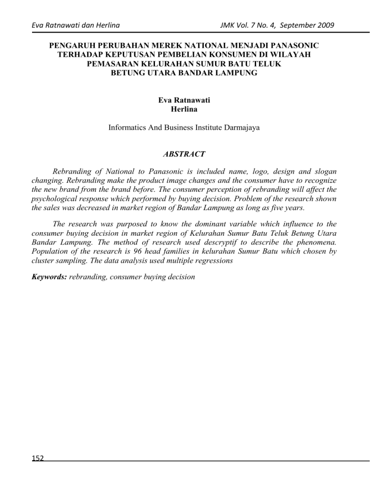 Eva Ratnawati dan Herlina JMK Vol. 7 No. 4, September 2009 PENGARUH PERUBAHAN MEREK NATIONAL MENJADI PANASONIC TERHADAP KEPUTUSAN PEMBELIAN KONSUMEN DI WILAYAH PEMASARAN KELURAHAN SUMUR BATU TELUK BETUNG UTARA BANDAR LAMPUNG Eva Ratnawati Herlina Informatics And Business Institute Darmajaya ABSTRACT Rebranding of National to Panasonic is included name, logo, design and slogan changing. Rebranding make the product image changes and the consumer have to recognize the new brand from the brand before. The consumer perception of rebranding will affect the psychological response which performed by buying decision. Problem of the research shown the sales was decreased in market region of Bandar Lampung as long as five years. The research was purposed to know the dominant variable which influence to the consumer buying decision in market region of Kelurahan Sumur Batu Teluk Betung Utara Bandar Lampung. The method of research used descryptif to describe the phenomena. Population of the research is 96 head families in kelurahan Sumur Batu which chosen by cluster sampling. The data analysis used multiple regressions Keywords: rebranding, consumer buying decision 152 Eva Ratnawati dan Herlina JMK Vol. 7 No. 4, September 2009 I. PENDAHULUAN Era globalisasi saat ini telah membentuk iklim persaingan yang semakin ketat, pada industri elektronik juga mengalami hal yang sama. Perkembangan pasar elektronik secara nasional terus mengalami peningkatan yang berfluktuasi karena kondisi ekonomi global yang turut berpengaruh. Kondisi pasar elektronik di Lampung berdasarkan data EMC memperkirakan pasar dan penjualan televisi (TV) akan naik dari 400.000 unit tahun 2008 menjadi 450.000 unit tahun 2009. Penjualan lemari es (kulkas) naik dari 128.000 unit tahun 2008 menjadi 191.000 unit tahun 2009. Penjualan pendingin ruangan (AC) dan mesin cuci sama-sama naik dari 78.000 unit tahun 2008 menjadi 85.000 unit tahun 2009 (www.lampostonline, 2009). Panasonic sebagai salah satu merek produk elektronik mengalami iklim kompetisi yang semakin ketat diantara merek elektronik pesaing. Merek Panasonic berada di bawah naungan perusahaan PT National Gobel Indonesia. Pangsa pasar elektronik merek Panasonic berada di urutan ke dua setelah Sony untuk kategori produk televisi dan tape recorder, akan tetapi untuk beberapa produk seperti kulkas dan mesin cuci merek Panasonic menguasai pasar sebesar 12%. Keberhasilan tersebut tidak terlepas dari keberadaan merek National yang telah beredar sejak tahun 1970. Merek merupakan kombinasi dari nama, logo, desain dan slogan yang memberi identitas produk (Rangkuti, 2002:13). Oleh karenanya, merek dapat mengandung semua unsur nama, simbol atau logo, desain dan slogan. Nama adalah identitas produk agar mudah dikenal masyarakat. Simbol atau logo adalah konsep yang menjadi icon produk, desain berarti bentuk tulisan, tata letak dan warna yang dipilih sedangkan slogan adalah keterangan yang menjelaskan tentang unsur merek. Untuk memenuhi tuntutan bisnis dengan iklim kompetisi yang semakin ketat maka PT National Gobel Indonesia menetapkan strategi merek dengan melakukan perubahan merek National menjadi Panasonic pada tahun 2003 yang ditargetkan akan lebih memudahkan strategi promosi sebagai upaya meningkatkan penjualan. Tabel 1.1 Penjualan Produk Elektronik Merek National dan Penjualan Pasca Perubahan Merek Menjadi Panasonic Selama Lima Tahun Wilayah pemasaran Kota Bandar Lampung National Tahun Panasonic Penjualan (unit) Tahun Penjualan (unit) 1999 12.312 2004 11.256 2000 11.019 2005 13.972 2001 10.891 2006 15.531 2002 8.084 2007 18.042 153 Eva Ratnawati dan Herlina JMK Vol. 7 No. 4, September 2009 Sumber: www.panasonic.com, 2008 Menurut Amalia E Maulana (2008:1) perubahan merek (rebranding) adalah proses pemberian nama merek baru atau identitas baru pada produk yang sudah ada tanpa perubahan berarti dari benefit yang ditawarkan oleh produk. Perubahan merek dimaksudkan untuk meningkatkan nilai perusahaan atau produk yang dilakukan dengan mengganti nama, warna, simbol atau logo, dan slogan (Maulana:2008) Perubahan merek yang terjadi adalah perubahan nama dari National menjadi Panasonic, perubahan logo dari logo dunia dalam box yang bertuliskan National, menjadi penggabungan tulisan Panasonic yang sekaligus dijadikan sebagai logo. Perubahan desain dapat dilihat dari penggunaan huruf tebal (bold) pada tulisan National menjadi huruf yang lebih tipis (slim) pada tulisan Panasonic, selain itu perubahan merek dilakukan dengan menambah slogan Ideas for life pada merek Panasonic yang sebelumnya pada merek National tidak diberikan. Perubahan merek membuat citra produk berubah karena merek Panasonic belum banyak dikenal oleh masyarakat yang sebelumnya lebih mengenal merek National baik dari perubahan nama, desain, logo dan slogan. Kesan atau persepsi konsumen terhadap perubahan merek akan menimbulkan respons psikologis pada konsumen tertarik untuk membeli produk tersebut berdasarkan karakteristik produk yang telah diketahuinya dari merek sebelumnya. Perubahan merek dapat menjadi indikasi adanya perilaku dalam bentuk keputusan pembelian (Soeprapto, 2007:1). Keputusan pembelian menurut Suhandang (2005:87) adalah kelanjutan dari perhatian yang merupakan titik tolak bagi timbulnya perhatian. Keputusan pembelian juga dapat dikatakan sebagai orientasi berprilaku terhadap objek atau pengalaman tertentu yang sama, kecenderungan itu beragam intensitasnya. Keputusan pembelian yang dimaksud dalam penelitian ini adalah proses pembelian berdasarkan pertimbangan terjadinya perubahan merek sehingga menimbulkan kesadaran, minat dan keinginan yang terindikasi dari adanya kesadaran tentang perubahan merek, timbulnya minat untuk membandingkan kualitas produk dengan produk sebelumnya, timbulnya minat untuk melihat produk dengan merek baru secara langsung, timbulnya keinginan mencoba produk, dan keinginan untuk membeli produk. Pada perubahan merek National menjadi Panasonic, keputusan pembelian konsumen juga mengalami perubahan kare