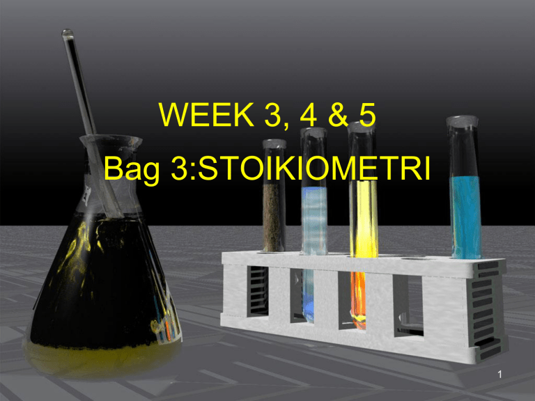 WEEK 3, 4 & 5 Bag 3:STOIKIOMETRI 1 Diskripsi • Stoikiometri adalah cabang ilmu kimia yang mempelajari hubungan kuantitatif/jumlah zat yang terlibat dalam reaksi kimia. • Kata ini berasal dari bahasa Yunani stoikheion (elemen) dan metron (ukuran) • Lingkup dari Stoikiometri adalah – Perbandingan jumlah unsur pembentuk senyawa – Perbandingan jumlah zat yang terlibat dalam suatu reaksi dalam jumlah yang kompleks • Jeremias Benjamin Richter (1762-1807) adalah orang yang pertama kali meletakkan prinsip-prinsip dasar stoikiometri 2 Stoikiometri Pembentukan Senyawa Hukum Perbandingan Tetap dalam Suatu senyawa • Dasar dari stoikiometri adalah teori atom dalton yaitu: – hukum perbandingan tetap dan – hukum kekekalan massa dalam reaksi kimia. • Rumus kimia suatu senyawa yang ditunjukkan dengan angka yang bulat, menunjukkan jumlah atom-atom yang menyusun senyawa tersebut (hukum perbandingan tetap). Sebagai contoh, karbonmonoksida (CO) mempunyai perbandingan antara atom C dan atom O sama dengan 1 : 1, yang berarti perbandingan atom untuk membuat 1 molekul CO 1 atom C dan 1 atom O. 1 atom C + 1 atom O → 1 molekul CO 3 Massa Atom • Massa atom terkait dengan jumlah sub atom yang dimiliki oleh atom. Pada persoalan reaksi kimia di laboratorium massa atom sangat diperlukan sebagai satuan jumlah dari zat yang terlibat dalam reaksi. • Atom adalah partikel yang sangat kecil sehingga massa satu atom tidak bisa ditimbang. Massa atom ditentukan dengan tetapan. • Berdasarkan perjanjian internasional tetapan yang digunakan adalah massa dari atom karbon isotop 12 (jumlah proton 6 dan neutron 6), dimana satu atom dari karbon-12 memiliki massa yang tepat 12 satuan massa atom. Atau dengan kata lain 1 Satuan Massa Atom dapat didefinisikan sebagai suatu massa yang besarnya tepat sama dengan seperduabelas massa dari satu atom karbon-12 4 Massa satu atom karbon-12 = 12 sma atau 1 sma = massa satu atom karbon-12/12 Massa dari atom lainnya dicari dengan membandingkan dengan massa karbon-12. Massa Atom rata-rata Massa atom dari masing-masing unsur dalam tabel sistem periodik tertera dalam bagian bawah. Massa ini menunjukkan massa atom rata-rata yaitu massa yang memperhitungkan semua isotop yang ditemukan di alam. 6 C 12,01 Massa atom C dialam ditemukan dengan bentuk Karbon-12 dengan massa 12 sma seJumlah 98,90 % dan karbon-13 dengan Massa 13,00335 sma sejumlah 1,10 %. 5 Contoh Lain Tembaga di alam ditemukan di alam memiliki 2 macam isotop yang stabil yaitu 63 sejumlah 69,09 % dengan massa 62,93 sma 29 Cu 65 sejumlah 30,91 % dengan massa 64,9278 sma 29 Cu Hitung massa atom rata-rata dari tembaga? (62,92 sma x 0,6909) + (64,9278 sma x 0.3091) = 63,5475 sma 6 Konsep Mol • Konsep atom dalton menyatakan jumlah atom pada senyawa adalah tetap, sedangkan atom pada kenyataannya berukuran kecil. Pada kenyataan di lapangan proses analisis kimia berlangsung pada sampel yang besar. Karena itu diperlukan suatu satuan khusus yang menyatakan jumlah atom yang sangat besar. • Pada sistem SI mol (mole) adalah banyaknya suatu zat yang mengandung entitas dasar (atom, molekul atau partikel lain) sebanyak jumlah atom yang terdapat dalam tepat 12 gram karbon-12. Jumlah sebenarnya 12 gram atom karbon-12 melalui percobaan ditemukan sejumlah 6,0221367 X 1023 buah. • Angka ini disebut bilangan avogadro dan pada umumnya angka ini dibulatkan 6,022 X 1023 sehingga dapat dikatakan 1 mol = 6,022 X 1023 7 ` 8 • Karena mol adalah satuan jumlah dari atom atau molekul maka perbandingan mol zat yang bereaksi akan sama dengan jumlah atom zat yang bereaksi. • Misalkan senyawa CCl4 (karbon tetra clorida), molekulnya terbentuk dari 1 atom C (karbon) dan 4 atom Klour, secara skematis perbandingan atom dan molekulnya dapat dituliskan sebagai berikut: 1 mol C + 4 mol Cl 1 mol CCl4 atom molekul atom 9 Tugas PR1 a. Berapakah perbandingan mol dari karbon dan klour untuk membentuk zat C2Cl6(Heksa kloroetana). C:Cl = 2:6 b. Berapakah mol atom karbon yang diperlukan untuk bergabung dengan 4,87 mol Cl agar membentuk zat C2Cl6. (2/6)x4,87=1,623 c. Berapakah mol atom karbon yang yang terdapat dalam 2,65 mol C2Cl6. 2x2,65=5,3mol d. Alumunium Sulfat (Al2(SO4)3) adalah jenis senyawa yang dipakai dalam membersihkan air di limbah pabrik. Jika tersedia sebanyak 4,5 mol molekul Al2(SO4)3, Hitunglah jumlah atom unsur-unsur penyusunnya. Al:2x4,5=9; S:3x4,5=13,5; O:12x4,5=54 10 Pengukuran Atom dalam Satuan Massa • Analisis kimia di lab atau di lapangan membutuhkan satuan selain satuan jumlah (mol). Dan satuan yang digunakan adalah satuan massa. • Seperti dalam konsep mol bahwa 1 mol karbon-12 mempunyai massa tepat 12 gram. Angka 12 ini sama dengan nomor massanya dan menunjukkan massa satu atomnya adalah 12sma. Dengan demikian massa atom untuk tiap satu mol unsur yang lain dapat juga diketahui dari nomor massanya. 11 Contoh Na memiliki nomor massa 22,99 sehingga massa atom 22,99 sma, ini juga menunjukkan bahwa 1 mol atom Na massanya 22,99 gram (=g). Fosfor (P) nomor massanya 30,97 artinya untuk 1 mol atom P massanya 30,97 gram. Dengan demikian dapat kita cari hubungan antara mol, massa molar (g/mol) dan massa. massa massa molar x mol mol massa / massa molar 12 Contoh Persoalan 1. 2. 3. a. Berapakah mol Si yang terdapat dalam 30,5 gram Si b. Jika terdapat 3, 75 mol Si berapakah massa Si Berapakah banyaknya mol Ca yang diperlukan untuk bereaksi dengan 2,5 mol Cl agar terbentuk senyawa CaCl2. Berapa gram Ca harus bereaksi dengan 41,5 gram Cl untuk menghasilkan CaCl2. Jika diketahui massa atom Si = 28,09 Ca =40,1 Cl = 35,5 . 13 PENGUKURAN SENYAWA • Sama halnya dengan unsur, pengukuran senyawa juga dapat dinyatakan dalam satuan mol (satuan jumlah molekul) maupun satuan massa. • Pengukuran massa molar senyawa dapat dihitung dengan menjumlahkan massa atom unsur penyusunnya sesuai rumus molekulnya (Perbandingan angka dalam rumus molekul menunjukkan perbandingan mol unsurnya). Penjumlahan ini menghasilkan angka massa molar molekul. • Contoh senyawa 