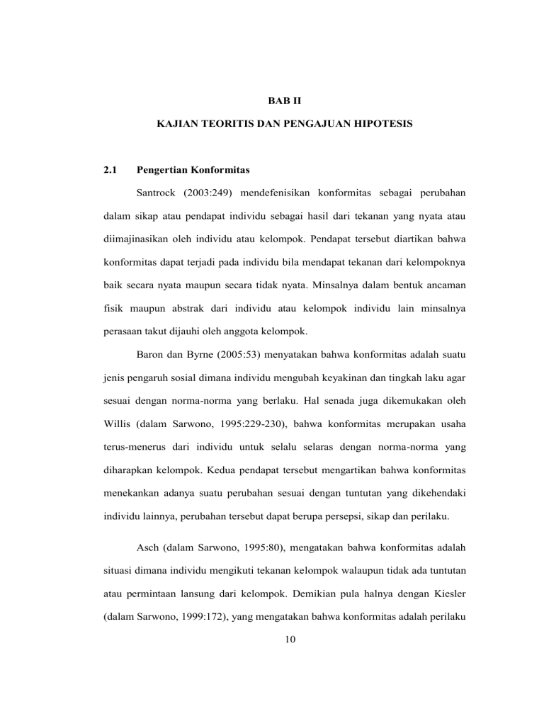 10 BAB II KAJIAN TEORITIS DAN PENGAJUAN HIPOTESIS 2.1 Pengertian Konformitas Santrock (2003:249) mendefenisikan konformitas sebagai perubahan dalam sikap atau pendapat individu sebagai hasil dari tekanan yang nyata atau diimajinasikan oleh individu atau kelompok. Pendapat tersebut diartikan bahwa konformitas dapat terjadi pada individu bila mendapat tekanan dari kelompoknya baik secara nyata maupun secara tidak nyata. Minsalnya dalam bentuk ancaman fisik maupun abstrak dari individu atau kelompok individu lain minsalnya perasaan takut dijauhi oleh anggota kelompok. Baron dan Byrne (2005:53) menyatakan bahwa konformitas adalah suatu jenis pengaruh sosial dimana individu mengubah keyakinan dan tingkah laku agar sesuai dengan norma-norma yang berlaku. Hal senada juga dikemukakan oleh Willis (dalam Sarwono, 1995:229-230), bahwa konformitas merupakan usaha terus-menerus dari individu untuk selalu selaras dengan norma-norma yang diharapkan kelompok. Kedua pendapat tersebut mengartikan bahwa konformitas menekankan adanya suatu perubahan sesuai dengan tuntutan yang dikehendaki individu lainnya, perubahan tersebut dapat berupa persepsi, sikap dan perilaku. Asch (dalam Sarwono, 1995:80), mengatakan bahwa konformitas adalah situasi dimana individu mengikuti tekanan kelompok walaupun tidak ada tuntutan atau permintaan lansung dari kelompok. Demikian pula halnya dengan Kiesler (dalam Sarwono, 1999:172), yang mengatakan bahwa konformitas adalah perilaku 10 11 atau keyakinan karena adanya tekanan dalam kelompok, baik yang sungguh ada maupun yang dibayangkan. Kedua pendapat tersebut mengartikan bahwa konformitas merupakan keadaan yang menuntut individu untuk mengikuti individu lainnya yang dianggapnya sebagai tekanan. Menurut David dan O’Sears (1999:53) bahwa bila seseorang menampilkan perilaku tertentu karena disebabkan oleh karena orang lain menampilkan perilaku tersebut, disebut konformitas. Menurut Baron dan Byrne (2005:53) konformitas remaja adalah penyesuaian perilaku remaja untuk menganut pada norma kelompok acuan, menerima ide atau aturan-aturan yang menunjukkan bagaimana remaja berperilaku. Berdasarkan pendapat ahli di atas, maka yang dimaksud konformitas teman sebaya adalah keadaan dimana individu menyikapi dan melakukan tindakan berdasarkan pengaruh teman sebaya, yang bila tidak dilakukannya dianggap dapat membahayakannya di depan teman sebaya. 2.2 Aspek-aspek Konformitas Wiggins (1991:132) mengemukakan bahwa aspek – aspek konformitas adalah: 1) Kerelaan : rela mengikuti pendapat kelompok yang diinginkan atau diharapkan agar memperoleh reward berupa pujian dan untuk menghindari 12 celaan, keterasingan, cemooh yang mungkin dijatuhkan jika tidak mengerjakan keinginan kelompok. 2) Perubahan : saat terjadi perubahan sikap, dalam suatu konformitas ketidak hadiran seorang anggota kelompok lebih dianggap sesuai dengan pikiran dan tindakan anggota kelompok yang hadir. Konformitas sebuah kelompok acuan dapat mudah terlihat dengan adanya ciri-ciri yang khas. O’Sears (1991:135) mengemukakan secara eksplisit bahwa konformitas remaja ditandai dengan adanya tiga hal sebagai berikut : 1. Kekompakan Kekuatan yang dimiliki kelompok acuan menyebabkan remaja tertarik dan ingin tetap menjadi anggota kelompok. Eratnya hubungan remaja dengan kelompok acuan disebabkan perasaan suka antara anggota kelompok serta harapan memperoleh manfaat dari keanggotaannya. Semakin besar rasa suka anggota yang satu terhadap anggota yang lain, dan semakin besar harapan untuk memperoleh manfaat dari keanggotaan kelompok serta semakin besar kesetiaan mereka, maka akan semakin kompak kelompok tersebut. a. Penyesuaian Diri Kekompakan yang tinggi menimbulkan tingkat konformitas yang semakin tinggi. Alasan utamanya adalah bahwa bila orang merasa dekat dengan anggota kelompok lain, akan semakin menyenangkan bagi mereka untuk mengakui kita, dan semakin menyakitkan bila mereka mencela kita. 13 Kemungkinan untuk menyesuaikan diri akan semakin besar bila kita mempunyai keinginan yang kuat untuk menjadi anggota sebuah kelompok tertentu. b. Perhatian terhadap Kelompok Peningkatan koformitas terjadi karena anggotanya enggan disebut sebagai orang yang menyimpang. Seperti yang telah kita ketahui, penyimpangan menimbulkan resiko ditolak. Orang yang terlalu sering menyimpang pada saat-saat yang penting diperlukan, tidak menyenangkan, dan bahkan bisa dikeluarkan dari kelompok. Semakin tinggi perhatian seseorang dalam kelompok semakin serius tingkat rasa takutnya terhadap penolakan, dan semakin kecil kemungkinan untuk tidak meyetujui kelompok. 2. Kesepakatan Pendapat kelompok acuan yang sudah dibuat memiliki tekanan kuat sehingga remaja harus loyal dan menyesuaikan pendapatnya dengan pendapat kelompok. a. Kepercayaan Penurunan melakukan konformitas yang drastis karena hancurnya kesepakatan disebabkan oleh faktor kepercayaan. Tingkat kepercayaan terhadap mayoritas akan menurun bila terjadi perbedaan pendapat, meskipun orang yang berbeda pendapat itu sebenarnya kurang ahli bila dibandingkan anggota lain yang membentuk mayoritas. Bila seseorang sudah tidak mempunyai kepercayaan terhadap pendapat kelompok, maka 14 hal ini dapat mengurangi ketergantungan individu terhadap kelompok sebagai sebuah kesepakatan. b. Persamaan Pendapat Bila dalam suatu kelompok terdapat satu orang saja tidak sependapat dengan anggota kelompok yang lain maka konformitas akan turun. Kehadiran orang yang tidak sependapat tersebut menunjukkan terjadinya perbedaan yang dapat berakibat pada berkurangnya kesepakatan kelompok. Jadi dengan persamaan pendapat antar anggota kelompok maka konformitas akan semakin tinggi. c. Penyimpangan terhadap pendapat kelompok Bila orang mempunyai pendapat yang berbeda dengan orang lain dia akan dikucilkan dan dipandang sebagai orang yang menyimpang, baik dalam pandangannya sendiri maupun dalam pandangan orang lain. Bila orang lain juga mempunyai pendapat yang berbeda, dia tidak akan dianggap menyimpang dan tidak akan dikucilkan. Jadi kesimpulan ba