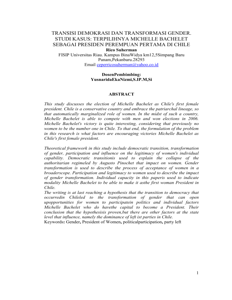 TRANSISI DEMOKRASI DAN TRANSFORMASI GENDER. STUDI KASUS: TERPILIHNYA MICHELLE BACHELET SEBAGAI PRESIDEN PEREMPUAN PERTAMA DI CHILE Rico Suherman FISIP Universitas Riau. Kampus BinaWidya km12,5Simpang Baru Panam,Pekanbaru.28293 Email ceperricosuherman@yahoo.co.id DosenPembimbing: YusnaridaEkaNizmi,S.IP.M,Si ABSTRACT This study discusses the election of Michelle Bachelet as Chile's first female president. Chile is a conservative country and embrace the patriarchal lineage, so that automatically marginalized role of women. In the midst of such a country, Michelle Bachelet is able to compete with men and won elections in 2006. Michelle Bachelet's victory is quite interesting, considering that previously no women to be the number one in Chile. To that end, the formulation of the problem in this research is what factors are encouraging victories Michelle Bachelet as Chile's first female president. Theoretical framework in this study include democratic transition, transformation of gender, participation and influence on the legitimacy of women's individual capability. Democratic transitionis used to explain the collapse of the authoritarian regimeled by Augusto Pinochet that impact on women. Gender transformation is used to describe the process of acceptance of women in a broaderscope. Participation and legitimacy to women used to describe the impact of gender transformation. Individual capacity in this paperis used to indicate modality Michelle Bachelet to be able to make it asthe first woman President in Chile. The writing is at last reaching a hypothesis that the transition to democracy that occurredin Chileled to the transformation of gender that can open upopportunities for women to participatein politics and individual factors Michelle Bachelet who do havethe capital to become a President. Their conclusion that the hypothesisis proven,but there are other factors at the state level that influence, namely the dominance of left ist parties in Chile. Keywords: Gender, President of Women, politicalparticipation, party left 1 ABSTRAK Penelitian ini membahas mengenai terpilihnya Michelle Bachelet sebagai Presiden perempuan pertama di Chile. Chile merupakan negara konservatif dan menganut garis keturunan patriarkis, sehingga otomatis peran perempuan termarginalkan. Di tengah kondisi negara seperti itu, Michelle Bachelet mampu bersaing dengan para laki-laki dan berhasil memenangkan pemilu tahun 2006. Kemenangan Michelle Bachelet cukup menarik, mengingat sebelumnya tidak ada perempuan yang menjadi orang nomor satu di Chile. Untuk itu, rumusan masalah dalam penelitian ini adalah faktor-faktor apa saja yang mendorong kemenangan Michelle Bachelet sebagai Presiden perempuan pertama di Chile. Kerangka teoritik dalam penelitian ini meliputi Transisi demokrasi, Transformasi gender, partisipasi dan pengaruhnya terhadap legitimasi perempuan sertakapasitas individu. Transisi demokrasi digunakan untuk menjelaskan runtuhnya rezim otoriter yang di pimpin oleh Augusto Pinochet yang membawa dampak pada perempuan. Transformasi gender digunakan untuk menjelaskan proses diterimanya perempuan dalam ruang lingkup yang lebih luas. Partisipasi dan legitimasi terhadap perempuan digunakan untuk menjelaskan dampak dari terjadinya transformasi gender. Kapasitas individu dalam penulisan ini digunakan untuk menunjukkan modalitas Michelle Bachelet hingga mampu menjadikannya sebagai Presiden perempuan pertama di Chile. Penulisan ini pada akhirnya mencapai sebuah hipotesis bahwa transisi demokrasi yang terjadi di Chile mendorong terjadinya transformasi gender yang mampu membuka peluang bagi perempuan untuk berpartisipasi dalam politik dan faktor individu Michelle Bachelet yang memang memiliki modal untuk menjadi seorang Presiden. Kesimpulan yang diperoleh bahwa hipotesis terbukti, namun terdapat faktor lain pada tingkat negara yang ikut mempengaruhi, yaitu adanya dominasi partai kiri di Chile. Kata kunci :Gender, Presiden Perempuan, Partisipasi politik, Partai kiri BAB I PENDAHULUAN 1.1 LATAR BELAKANG PERMASALAHAN Partisipasi masyarakat merupakan hal yang sangat penting bagi suatu negara, karena menunjukkan bagaimana negara menjalankan proses pemerintahannya. Dalam pemerintahan yang demokrasi sangat di perlukannya partisipasi masyarakat. Demokrasi sendiri diartikan sebagai berjalannya mekanisme penentuan posisi publik dan pengambilan keputusan di mana suara rakyat yang menentukan.Terkait dengan pentingnya partisipasi masyarakat terdapat permasalahan di dalamnya, yaitu ketika dikaitkan dengan representasi gender. Permasalahan representasi gender muncul karena adanya manifestasi ketidakadilan terhadap peran yang diterima perempuan, baik dalam bidang ekonomi, politik, maupun pendidikan sehingga perlu adanya transformasi gender. ransformasi gender tidak sekadar memperbaiki status perempuan yang 2 indikatornya menggunakan norma laki-laki, melainkan memperjuangkan martabat dan kekuatan perempuan. Akan tetapi dalam penulisan ini hanya akan fokus terhadap permasalahan politik. Masalah gender kemudian menjadi perhatian dunia, sehingga masuk dalam agenda Perserikatan Bangsa-Bangsa (PBB).1Berdasarkan rekomendasi Commision on the Status of Women (CSW)2 terhadap PBB, maka dilaksanakan konferensi internasional pertama tentang perempuan yang diselenggarakan di Mexico pada tahun 1975.Pada konferensi tersebut hak-hak perempuan dibicarakan sebatas upaya meninjau kembali apakah peraturan atau perundangan mengenai perempuan sesuai dengan instrumen internasional yang ada serta bagaimana upaya memperkuatnya.3Konferensi tersebut juga memunculkan gagasan untuk membuat rancangan hak-hak perempuan yang dapat berlaku secara universal yang menghasilkan Konvensi Perempuan.4 Berbagai konferensi tentang perempuan telah dilaksanakan, yang pada intinya merupakan perjuangan hak-hak asasi perempuan untuk memperoleh kesetaraan antara laki-laki dan perempuan dalam berbagai bidang kehidupan. Untuk mempermudah tercapainya tujuan tersebut, maka dibuat prinsip-prinsip 
