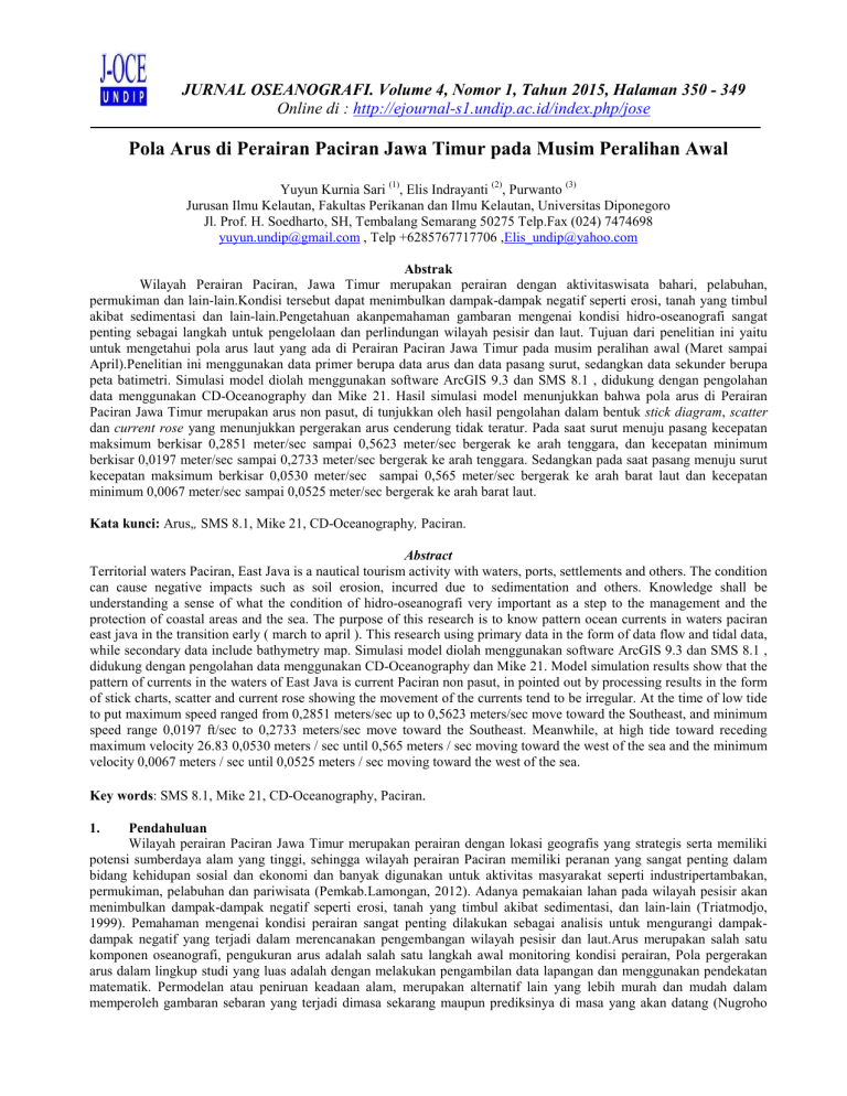 JURNAL OSEANOGRAFI. Volume 4, Nomor 1, Tahun 2015, Halaman 350 - 349 Online di : http://ejournal-s1.undip.ac.id/index.php/jose Pola Arus di Perairan Paciran Jawa Timur pada Musim Peralihan Awal Yuyun Kurnia Sari (1), Elis Indrayanti (2), Purwanto (3) Jurusan Ilmu Kelautan, Fakultas Perikanan dan Ilmu Kelautan, Universitas Diponegoro Jl. Prof. H. Soedharto, SH, Tembalang Semarang 50275 Telp.Fax (024) 7474698 yuyun.undip@gmail.com , Telp +6285767717706 ,Elis_undip@yahoo.com Abstrak Wilayah Perairan Paciran, Jawa Timur merupakan perairan dengan aktivitaswisata bahari, pelabuhan, permukiman dan lain-lain.Kondisi tersebut dapat menimbulkan dampak-dampak negatif seperti erosi, tanah yang timbul akibat sedimentasi dan lain-lain.Pengetahuan akanpemahaman gambaran mengenai kondisi hidro-oseanografi sangat penting sebagai langkah untuk pengelolaan dan perlindungan wilayah pesisir dan laut. Tujuan dari penelitian ini yaitu untuk mengetahui pola arus laut yang ada di Perairan Paciran Jawa Timur pada musim peralihan awal (Maret sampai April).Penelitian ini menggunakan data primer berupa data arus dan data pasang surut, sedangkan data sekunder berupa peta batimetri. Simulasi model diolah menggunakan software ArcGIS 9.3 dan SMS 8.1 , didukung dengan pengolahan data menggunakan CD-Oceanography dan Mike 21. Hasil simulasi model menunjukkan bahwa pola arus di Perairan Paciran Jawa Timur merupakan arus non pasut, di tunjukkan oleh hasil pengolahan dalam bentuk stick diagram, scatter dan current rose yang menunjukkan pergerakan arus cenderung tidak teratur. Pada saat surut menuju pasang kecepatan maksimum berkisar 0,2851 meter/sec sampai 0,5623 meter/sec bergerak ke arah tenggara, dan kecepatan minimum berkisar 0,0197 meter/sec sampai 0,2733 meter/sec bergerak ke arah tenggara. Sedangkan pada saat pasang menuju surut kecepatan maksimum berkisar 0,0530 meter/sec sampai 0,565 meter/sec bergerak ke arah barat laut dan kecepatan minimum 0,0067 meter/sec sampai 0,0525 meter/sec bergerak ke arah barat laut. Kata kunci: Arus,, SMS 8.1, Mike 21, CD-Oceanography, Paciran. Abstract Territorial waters Paciran, East Java is a nautical tourism activity with waters, ports, settlements and others. The condition can cause negative impacts such as soil erosion, incurred due to sedimentation and others. Knowledge shall be understanding a sense of what the condition of hidro-oseanografi very important as a step to the management and the protection of coastal areas and the sea. The purpose of this research is to know pattern ocean currents in waters paciran east java in the transition early ( march to april ). This research using primary data in the form of data flow and tidal data, while secondary data include bathymetry map. Simulasi model diolah menggunakan software ArcGIS 9.3 dan SMS 8.1 , didukung dengan pengolahan data menggunakan CD-Oceanography dan Mike 21. Model simulation results show that the pattern of currents in the waters of East Java is current Paciran non pasut, in pointed out by processing results in the form of stick charts, scatter and current rose showing the movement of the currents tend to be irregular. At the time of low tide to put maximum speed ranged from 0,2851 meters/sec up to 0,5623 meters/sec move toward the Southeast, and minimum speed range 0,0197 ft/sec to 0,2733 meters/sec move toward the Southeast. Meanwhile, at high tide toward receding maximum velocity 26.83 0,0530 meters / sec until 0,565 meters / sec moving toward the west of the sea and the minimum velocity 0,0067 meters / sec until 0,0525 meters / sec moving toward the west of the sea. Key words: SMS 8.1, Mike 21, CD-Oceanography, Paciran. 1. Pendahuluan Wilayah perairan Paciran Jawa Timur merupakan perairan dengan lokasi geografis yang strategis serta memiliki potensi sumberdaya alam yang tinggi, sehingga wilayah perairan Paciran memiliki peranan yang sangat penting dalam bidang kehidupan sosial dan ekonomi dan banyak digunakan untuk aktivitas masyarakat seperti industripertambakan, permukiman, pelabuhan dan pariwisata (Pemkab.Lamongan, 2012). Adanya pemakaian lahan pada wilayah pesisir akan menimbulkan dampak-dampak negatif seperti erosi, tanah yang timbul akibat sedimentasi, dan lain-lain (Triatmodjo, 1999). Pemahaman mengenai kondisi perairan sangat penting dilakukan sebagai analisis untuk mengurangi dampakdampak negatif yang terjadi dalam merencanakan pengembangan wilayah pesisir dan laut.Arus merupakan salah satu komponen oseanografi, pengukuran arus adalah salah satu langkah awal monitoring kondisi perairan, Pola pergerakan arus dalam lingkup studi yang luas adalah dengan melakukan pengambilan data lapangan dan menggunakan pendekatan matematik. Permodelan atau peniruan keadaan alam, merupakan alternatif lain yang lebih murah dan mudah dalam memperoleh gambaran sebaran yang terjadi dimasa sekarang maupun prediksinya di masa yang akan datang (Nugroho JURNAL OSEANOGRAFI. Volume 4, Nomor 1, Tahun 2015, Halaman 351 dan Anugroho, 2007). Tujuan dari penelitian ini yaitu untuk mengetahui pola arus laut yang ada di perairan Paciran Jawa Timur pada musim peralihan awal. 2. A. Materi dan Metode Penelitian Materi Penelitian Materi yang digunakan dalam penelitian ini meliputi data lapangan (data primer) dan data pendukung dari instansi terkait (data sekunder). Data primer yang digunakan yaitu data hasil pengukuran di lapangan berupa data arus dan data pasang surut, sedangkan data sekunder meliputi Peta batimetri perairan Paciran Jawa Timur yang didapat dari instansi BAKOSURTANAL dengan Skala 1:50.000. B. Metode Penelitian Penelitian ini menggunakan metode deskriptif yaitu metode penelitian untuk membuat gambaran mengenai situasi atau kejadian yang diteliti atau dikaji pada waktu terbatas dan tempat tertentu untuk mendapatkan gambaran tentang situasi dan kondisi secara lokal (Suryabrata, 1992).Metode yang dilakukan dalam penelitian ini meliputi pengukuran di lapangan dan analisis data.Hasil akhir dari penelitian ini adalah informasi umum meng
