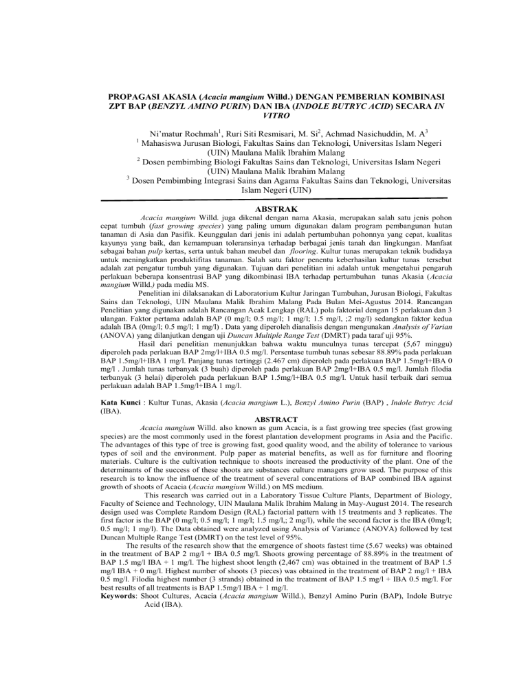 PROPAGASI AKASIA (Acacia mangium Willd.) DENGAN PEMBERIAN KOMBINASI ZPT BAP (BENZYL AMINO PURIN) DAN IBA (INDOLE BUTRYC ACID) SECARA IN VITRO Ni’matur Rochmah1, Ruri Siti Resmisari, M. Si2, Achmad Nasichuddin, M. A3 Mahasiswa Jurusan Biologi, Fakultas Sains dan Teknologi, Universitas Islam Negeri (UIN) Maulana Malik Ibrahim Malang 2 Dosen pembimbing Biologi Fakultas Sains dan Teknologi, Universitas Islam Negeri (UIN) Maulana Malik Ibrahim Malang 3 Dosen Pembimbing Integrasi Sains dan Agama Fakultas Sains dan Teknologi, Universitas Islam Negeri (UIN) 1 ABSTRAK Acacia mangium Willd. juga dikenal dengan nama Akasia, merupakan salah satu jenis pohon cepat tumbuh (fast growing species) yang paling umum digunakan dalam program pembangunan hutan tanaman di Asia dan Pasifik. Keunggulan dari jenis ini adalah pertumbuhan pohonnya yang cepat, kualitas kayunya yang baik, dan kemampuan toleransinya terhadap berbagai jenis tanah dan lingkungan. Manfaat sebagai bahan pulp kertas, serta untuk bahan meubel dan flooring. Kultur tunas merupakan teknik budidaya untuk meningkatkan produktifitas tanaman. Salah satu faktor penentu keberhasilan kultur tunas tersebut adalah zat pengatur tumbuh yang digunakan. Tujuan dari penelitian ini adalah untuk mengetahui pengaruh perlakuan beberapa konsentrasi BAP yang dikombinasi IBA terhadap pertumbuhan tunas Akasia (Acacia mangium Willd.) pada media MS. Penelitian ini dilaksanakan di Laboratorium Kultur Jaringan Tumbuhan, Jurusan Biologi, Fakultas Sains dan Teknologi, UIN Maulana Malik Ibrahim Malang Pada Bulan Mei-Agustus 2014. Rancangan Penelitian yang digunakan adalah Rancangan Acak Lengkap (RAL) pola faktorial dengan 15 perlakuan dan 3 ulangan. Faktor pertama adalah BAP (0 mg/l; 0.5 mg/l; 1 mg/l; 1.5 mg/l, ;2 mg/l) sedangkan faktor kedua adalah IBA (0mg/l; 0.5 mg/l; 1 mg/l) . Data yang diperoleh dianalisis dengan mengunakan Analysis of Varian (ANOVA) yang dilanjutkan dengan uji Duncan Multiple Range Test (DMRT) pada taraf uji 95%. Hasil dari penelitian menunjukkan bahwa waktu munculnya tunas tercepat (5,67 minggu) diperoleh pada perlakuan BAP 2mg/l+IBA 0.5 mg/l. Persentase tumbuh tunas sebesar 88.89% pada perlakuan BAP 1.5mg/l+IBA 1 mg/l. Panjang tunas tertinggi (2.467 cm) diperoleh pada perlakuan BAP 1.5mg/l+IBA 0 mg/l . Jumlah tunas terbanyak (3 buah) diperoleh pada perlakuan BAP 2mg/l+IBA 0.5 mg/l. Jumlah filodia terbanyak (3 helai) diperoleh pada perlakuan BAP 1.5mg/l+IBA 0.5 mg/l. Untuk hasil terbaik dari semua perlakuan adalah BAP 1.5mg/l+IBA 1 mg/l. Kata Kunci : Kultur Tunas, Akasia (Acacia mangium L.), Benzyl Amino Purin (BAP) , Indole Butryc Acid (IBA). ABSTRACT Acacia mangium Willd. also known as gum Acacia, is a fast growing tree species (fast growing species) are the most commonly used in the forest plantation development programs in Asia and the Pacific. The advantages of this type of tree is growing fast, good quality wood, and the ability of tolerance to various types of soil and the environment. Pulp paper as material benefits, as well as for furniture and flooring materials. Culture is the cultivation technique to shoots increased the productivity of the plant. One of the determinants of the success of these shoots are substances culture managers grow used. The purpose of this research is to know the influence of the treatment of several concentrations of BAP combined IBA against growth of shoots of Acacia (Acacia mangium Willd.) on MS medium. This research was carried out in a Laboratory Tissue Culture Plants, Department of Biology, Faculty of Science and Technology, UIN Maulana Malik Ibrahim Malang in May-August 2014. The research design used was Complete Random Design (RAL) factorial pattern with 15 treatments and 3 replicates. The first factor is the BAP (0 mg/l; 0.5 mg/l; 1 mg/l; 1.5 mg/l,; 2 mg/l), while the second factor is the IBA (0mg/l; 0.5 mg/l; 1 mg/l). The Data obtained were analyzed using Analysis of Variance (ANOVA) followed by test Duncan Multiple Range Test (DMRT) on the test level of 95%. The results of the research show that the emergence of shoots fastest time (5.67 weeks) was obtained in the treatment of BAP 2 mg/l + IBA 0.5 mg/l. Shoots growing percentage of 88.89% in the treatment of BAP 1.5 mg/l IBA + 1 mg/l. The highest shoot length (2,467 cm) was obtained in the treatment of BAP 1.5 mg/l IBA + 0 mg/l. Highest number of shoots (3 pieces) was obtained in the treatment of BAP 2 mg/l + IBA 0.5 mg/l. Filodia highest number (3 strands) obtained in the treatment of BAP 1.5 mg/l + IBA 0.5 mg/l. For best results of all treatments is BAP 1.5mg/l IBA + 1 mg/l. Keywords: Shoot Cultures, Acacia (Acacia mangium Willd.), Benzyl Amino Purin (BAP), Indole Butryc Acid (IBA). A. PENDAHULUAN Acacia mangium Willd. juga dikenal dengan nama Akasia, merupakan salah satu jenis pohon cepat tumbuh (fast growing species) yang paling umum digunakan dalam program pembangunan hutan tanaman di Asia dan Pasifik. Keunggulan dari jenis ini adalah pertumbuhan pohonnya yang cepat, kualitas kayunya yang baik, dan kemampuan toleransinya terhadap berbagai jenis tanah dan lingkungan (Krisnawati, dkk. 2011). Kayu Akasia memiliki prospek pasar yang cukup tinggi. Permintaannya bukan hanya di dalam negeri, namun juga datang dari mancanegara. Kayu ini dipergunakan antara lain untuk bahan bangunan, peralatan rumah tangga, sampai pada bahan baku kayu lapis.. Perbanyakan tanaman atau propagasi tanaman dapat dilakukan secara generatif atau secara vegetatif. Perbanyakan secara vegetatif dilakukan dengan menggunakan bagian dari tanaman tersebut. Secara konvensional teknik perbanyakan tanaman secara vegetatif antara lain cangkok, stek, okulasi dan sebagainya. Sedangkan perbanyakan vegetatif secara modern dilakukan dengan teknik kultur jaringan. Umumnya tanaman Akasia diperbanyak melalui perbanyakan secara generatif yaitu dengan menggunakan biji, atau melalui perbanyakan secara vegetatif yaitu dengan mencangkok dan stek. Namun untuk menanggapi permintaan pasar yang semakin me