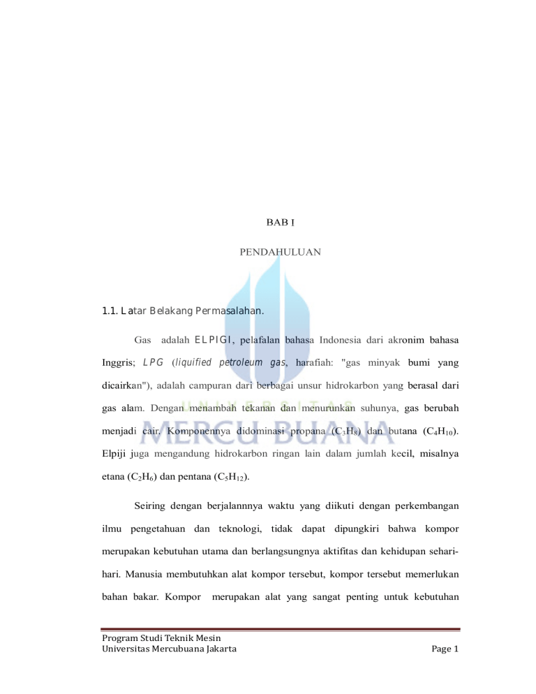 BAB I PENDAHULUAN 1.1. Latar Belakang Permasalahan. Gas adalah ELPIGI, pelafalan bahasa Indonesia dari akronim bahasa Inggris; LPG (liquified petroleum gas, harafiah: "gas minyak bumi yang dicairkan"), adalah campuran dari berbagai unsur hidrokarbon yang berasal dari gas alam. Dengan menambah tekanan dan menurunkan suhunya, gas berubah menjadi cair. Komponennya didominasi propana (C3H8) dan butana (C4H10). Elpiji juga mengandung hidrokarbon ringan lain dalam jumlah kecil, misalnya etana (C2H6) dan pentana (C5H12). Seiring dengan berjalannnya waktu yang diikuti dengan perkembangan ilmu pengetahuan dan teknologi, tidak dapat dipungkiri bahwa kompor merupakan kebutuhan utama dan berlangsungnya aktifitas dan kehidupan seharihari. Manusia membutuhkan alat kompor tersebut, kompor tersebut memerlukan bahan bakar. Kompor merupakan alat yang sangat penting untuk kebutuhan Program Studi Teknik Mesin Universitas Mercubuana Jakarta Page 1 manusia, seperti kita yang memerlukan makan untuk beraktifitas. kompor memerlukan bahan bakar untuk melakukan pembakaran agar bisa digunakan. Bahan bakar tersebut berasal dari berbagai unsur hidrokarbon yang berasal dari gas alam. dari minyak bumi yang terdapat didalam bumi yang mana sewaktuwaktu akan habis dan punah oleh karena pemakaiannya terus menerus. untuk menghemat pemakaian bahan bakar elpiji digunakan alat penghemat bahan bakar, Dengan mengamplikasikan HHO generator pada kompor gas elpj sehingga dapat menghemat pengunaan gas LPG pada kompor gas, tanpa harus mengganti komponennya. Alat tersebut sangat sederhana, hanya berupa tabung, stainless steel yang berfungsi sebagai katoda anoda serta zat kimia Kalium Hidroksida (KOH) sebagai katalisator. Di dalam elektroliser ini air akan diuraikan menjadi hidrogen danoksigen, tepatnya gas Brown (HHO). Unsur gas Brown ini yang nantinya akan diambil sebagai campuran untuk menambah panas pada proses pembakaran. 1.2 Rumusan masalah Dari uraian latar belakang diatas, penulisa dapat merumuskan beberapa permasalahan yaitu bagaimana cara perancangan HHO generator yang digunakan untuk kompor Gas. 1.3 Batasan Masalah Berhubung karena tinjauan alat HHO generator ini sangat luas maka penulis hanya membahas beberapa hal saja, diantaranya adalah : 1. Pembuatan HHO generator pada kompor LPG 2. Pemanfaatan HHO generator pada kompor LPG Program Studi Teknik Mesin Universitas Mercubuana Jakarta Page 2 Karena hal diatas maka penulis mengambil judul pada pembuatan atau penulisa Tugas Akhir ini, yaitu : “ PEMBUATAN DAN PEMANFAATAN HHO GENERATOR UNTUK KOMPOR GAS LPG “ 1.4 Tujuan Penelitian Tujuan dari pembuatan HHO GENERATOR PADA KOMPOR GAS ini adalah untuk menguji air yang di elektrolisa untuk dapat di manfaatkan sebagai kompor gas. 1.5 Metodogi Penelitian. metode penelitian yang dilakukan yaitu meliputi : 1. Berdiskusi yaitu pembahasan yang dibahas secara bersama sesuai dengan materi mengenai perancangan dan pembuatan HHO Generator. 2. Studi Literatur yaitu digunakan untuk memperoleh teori-teori sebagi dasar penulisan yang erat kaitannya dengan masalah yang di bahas. 3. Metode bimbingan yaitu Bimbingan dan konsultasi pada dosen pembimbing untuk mengarahkan penulisan maupun pelaksanaan pembuatan tugas akhir. 1.6 Sistematika Penulisan Dalam penulisan Tugas Akhir ini terdiri dari lima (V) bab dengan sistematika penulisan sebagai berikut : Program Studi Teknik Mesin Universitas Mercubuana Jakarta Page 3 BAB I Pendahuluan menjelaskan tentang latar belakang permasalahan,perumusan masalah, batasan masalah, tujuan penelitian, metodologi penelitian, sistematika penulisan. BAB II Landasan teori menjelaskan tentang beberapa teori yang menunjang penulisan Tugas Akhir ini. BAB III Metode Penelitian berisikan tentang bagaimana cara dan metode yang di pakai dalam pengambilan data. BAB IV “ PEMBUATAN PEMANFAATAN HHO GENERATOR UNTUK KOMPOR GAS LPG ” Berisikan tentang bagaimana cara perancangan dan pembuatan HHO Generator pada kompor Gas LPJ BAB V PENUTUP berisikan tentang : kesimpulan dan Saran. Program Studi Teknik Mesin Universitas Mercubuana Jakarta Page 4