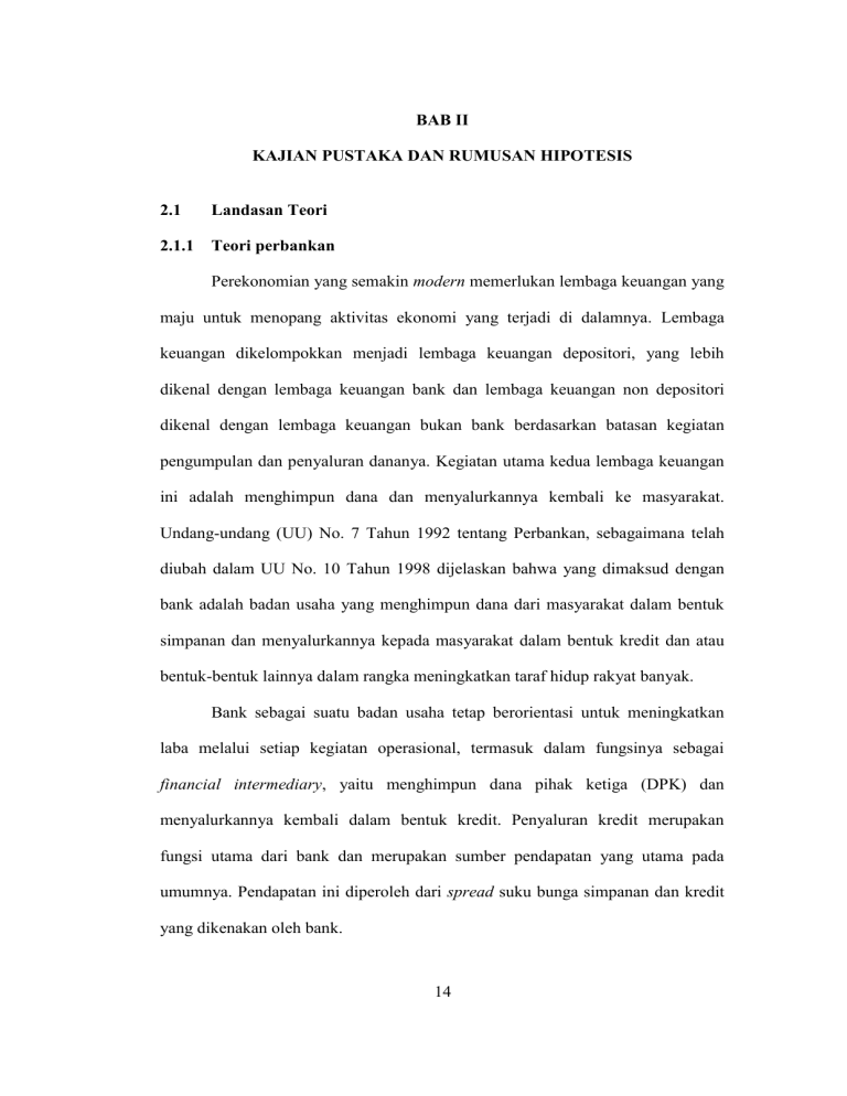 BAB II KAJIAN PUSTAKA DAN RUMUSAN HIPOTESIS 2.1 Landasan Teori 2.1.1 Teori perbankan Perekonomian yang semakin modern memerlukan lembaga keuangan yang maju untuk menopang aktivitas ekonomi yang terjadi di dalamnya. Lembaga keuangan dikelompokkan menjadi lembaga keuangan depositori, yang lebih dikenal dengan lembaga keuangan bank dan lembaga keuangan non depositori dikenal dengan lembaga keuangan bukan bank berdasarkan batasan kegiatan pengumpulan dan penyaluran dananya. Kegiatan utama kedua lembaga keuangan ini adalah menghimpun dana dan menyalurkannya kembali ke masyarakat. Undang-undang (UU) No. 7 Tahun 1992 tentang Perbankan, sebagaimana telah diubah dalam UU No. 10 Tahun 1998 dijelaskan bahwa yang dimaksud dengan bank adalah badan usaha yang menghimpun dana dari masyarakat dalam bentuk simpanan dan menyalurkannya kepada masyarakat dalam bentuk kredit dan atau bentuk-bentuk lainnya dalam rangka meningkatkan taraf hidup rakyat banyak. Bank sebagai suatu badan usaha tetap berorientasi untuk meningkatkan laba melalui setiap kegiatan operasional, termasuk dalam fungsinya sebagai financial intermediary, yaitu menghimpun dana pihak ketiga (DPK) dan menyalurkannya kembali dalam bentuk kredit. Penyaluran kredit merupakan fungsi utama dari bank dan merupakan sumber pendapatan yang utama pada umumnya. Pendapatan ini diperoleh dari spread suku bunga simpanan dan kredit yang dikenakan oleh bank. 14 1) Fungsi bank Secara umum fungsi utama bank adalah menghimpun dana dari masyarakat dan menyalurkan kembali kepada masyarakat untuk berbagai tujuan atau sebagai financial intermediary. Menurut Susilo,dkk (2000:6) secara lebih spesifik fungsi bank dapat dibagi sebagai agent of trust, agent of development, dan agent of services. (1) Agent of trust Dasar utama kegiatan perbankan adalah trust atau kepercayaan, baik dalam hal penghimpunan dana maupun penyaluran dana. Masyarakat akan mau menitipkan dananya di bank apabila dilandasi oleh unsur kepercayaan. Masyarakat percaya bahwa uangnya tidak akan disalahgunakan oleh bank, uangnya akan dikelola dengan baik, bank tidak akan bangkrut, dan juga percaya bahwa pada saat yang telah dijanjikan masyarakat dapat menarik lagi simpanan dananya di bank. Pihak bank sendiri akan mau menempatkan atau menyalurkan dananya pada debitur atau masyarakat apabila dilandasi unsur kepercayaan. Pihak bank percaya bahwa debitur tidak akan menyalahgunakan pinjamannya, debitur akan mengelola dana pinjaman dengan baik, debitur akan mempunyai kemampuan untuk membayar pada saat jatuh tempo, dan juga bank percaya bahwa debitur mempunyai niat baik untuk mengembalikan pinjaman beserta kewajiban lainnya pada saat jatuh tempo. (2) Agent of development Sektor dalam kegiatan perekonomian masyarakat yaitu sektor moneter dan sektor riil, tidak dapat dipisahkan. Kedua sektor tersebut berinteraksi saling 15 mempengaruhi satu dengan yang lain. Sektor riil tidak akan dapat berkinerja dengan baik apabila sektor moneter tidak bekerja dengan baik. Tugas bank sebagai penghimpunan dan penyaluran dana sangat diperlukan untuk kelancaran kegiatan perekonomian di sektor riil. Kegiatan bank tersebut memungkinkan masyarakat melakukan investasi, distribusi, dan juga konsumsi barang dan jasa, mengingat semua kegiatan investasi, distribusi, konsumsi selalu berkaitan dengan penggunaan uang. Kelancaran kegiatan investasi, distribusi, konsumsi ini tidak lain adalah kegiatan pembangunan perekonomian masyarakat. (3) Agent of services Bank juga memberikan penawaran jasa-jasa perbankan yang lain kepada masyarakat di samping melakukan kegiatan penghimpunan dan penyaluran dana. Jasa-jasa yang ditawarkan bank ini erat kaitannya dengan kegiatan perekonomian masyarakat secara umum. Jasa-jasa bank ini antara lain dapat berupa jasa pengiriman uang, jasa penitipan barang berharga, jasa pemberian jaminan bank, dan jasa penyelesaian tagihan. Ketiga fungsi bank tersebut diharapkan dapat memberikan gambaran yang menyeluruh dan lengkap mengenai fungsi bank dalam perekonomian, sehingga bank tidak hanya dapat diartikan sebagai lembaga perantara keuangan atau financial intermediary institution. 16 2) Jenis bank Menurut Kasmir (2004:32) jenis perbankan dapat ditinjau dari beberapa segi antara lain: (1) Dilihat dari segi fungsinya Menurut Undang-Undang Pokok Perbankan Nomor 7 Tahun 1992 dan ditegaskan lagi dengan dikeluarkannya Undang-Undang Nomor 10 Tahun 1998, bank dikategorikan menjadi dua jenis yaitu: a) Bank Umum Adalah bank yang melaksanakan kegiatan usaha secara konvensional dan atau berdasarkan prinsip syariah yang dalam kegiatannya berdasarkan jasa dalam lalu lintas pembayaran. Sifat jasa yang diberikan adalah umum, dalam arti dapat memberikan seluruh jasa perbankan yang ada dan wilayah operasinya dapat dilakukan di seluruh wilayah. b) Bank Perkreditan Rakyat (BPR) Adalah bank yang melaksanakan kegiatan usaha secara konvensional atau berdasarkan prinsip syariah yang dalam kegiatannya tidak memberikan jasa dalam lalu lintas pembayaran. Kegiatan BPR jauh lebih sempit jika dibandingkan dengan kegiatan bank umum. Kegiatan BPR hanya meliputi kegiatan penghimpunan dan penyalur dana saja, bahkan dalam menghimpun dana BPR dilarang untuk menerima simpanan giro. Dalam hal jangkauan wilayah operasi, BPR hanya dibatasi dalam wilayah-wilayah tertentu saja. Pendirian BPR dengan modal awal yang relatif lebih kecil jika dibandingkan 17 dengan modal awal bank umum. Larangan lainnya adalah BPR tidak diperkenankan ikut kliring serta transaksi valuta asing. (2) Dilihat dari segi kepemilikannya Kepemilikan ini dapat dilihat dari akta pendirian dan penguasaan saham yang dimiliki bank bersangkutan. Adapun pembagian bank sebagai berikut: a) Bank milik pemerintah Di mana akta pendirian maupun modalnya dimiliki oleh pemerintah, sehingga keuntungan bank ini dimiliki oleh pemerintah. Contoh: BNI, BRI, BTN, bank Mandiri, dan BPD. b) Bank milik swasta nasional Bank yang seluruh atau sebagian besar dimiliki oleh swasta nasional serta akte pendirian didirikan o