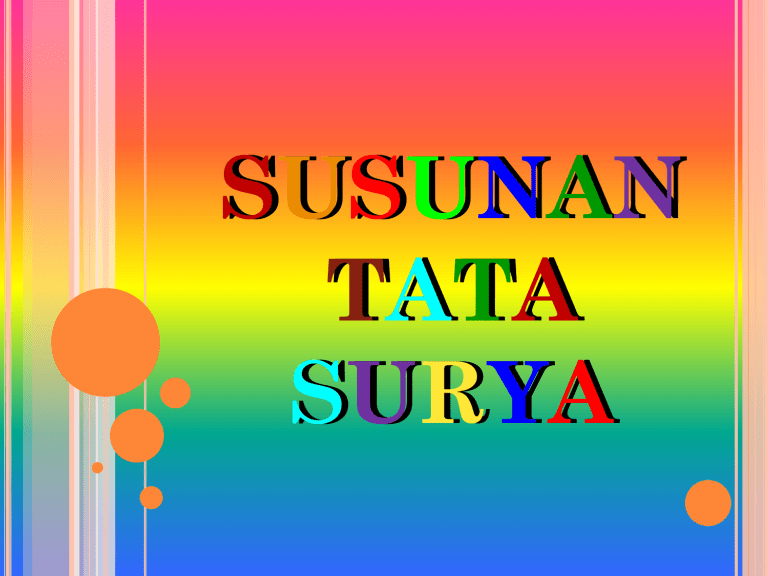 SUSUNAN TATA SURYA Tata Surya adalah kumpulan benda langit yang terdiri atas sebuah bintang yang disebut matahari dan semua obyek yang mengelilinginya. Obyek-obyek tersebut termasuk delapan buah planet yang sudah diketahui dengan orbit berbentuk elips, lima planet-planet kerdil/katai, 173 satelit-satelit alami yang telah diidentifikasi, dan jutaan benda langit (meteor, asteroid, komet) lainnya. Tata Surya terbagi menjadi Matahari, empat planet bagian dalam, sabuk asteroid, empat planet bagian luar, dan di bagian terluar adalah Sabuk Kuiper dan piringan tersebar. Awan Oort diperkirakan terletak di daerah terjauh yang berjarak sekitar seribu kali di luar bagian yang terluar. TATA SURYA-TATA SURYA-TATA SURYA P E N G E R T I A N MERKURIUS MERKURIUS Planet Merkurius adalah planet yang terdekat dengan matahari pada sistem tata surya, planet ini berukuran kecil dan hampir tidak mempunyai atmosfer, akibatnya langit kelihatan gelap seperti di angkasa lepas. Permukaannya dipenuhi kawah (tampak berlubang-lubang) seperti permukaan sebuah bulan. Pada siang hari, suhu permukaan merkurius sangat panas, mencapai 400oC dan sebaiknya suhu pada malam hari sangat dingin hingga 200oC. Periode planet ini kira-kira 88 hari, sedangakn periode rotasinya 59 hari. Diameter planet ini adalah 4.880 km, dengan jarak dengan jarak rata-rata Merkurius ke Matahari 58 juta km. (Planet Merkurius) VENUS VENUS Planet Venus sangat menkilap karena memiliki atmosfer yang tebal seperti awan putih yang menyelubungi permukaan venus. Awan ini terjadi akibat dari pembakaran asam sulfat panas. Atmosfer Venus mengandung 97% karbondioksida (CO) dan 30% nitrogen. Sehingga hampir tidak mungkin terdapat kehidupan suhu siang hari dapat mencapai 500oC. Venus sering disebut bintang pagi atau bintang senja karena terlihat berkilauan di timur pada saat terbit matahari dan saat tenggelam diufuk barat. Arah rotasi Venus berlawanan dengan arah rotasi planet-planet lain. Selain itu jangka waktu rotasi Venus labih lama dari pada jangka waktu revolusinya dalam mengelilingi matahari. Kala revolusi planet Venus adalah 224,7 hari, sedangkan kala rotasinya 244 hari dengan diameternya 12.100km. Bumi merupakan planet ketiga berdasarkan jaraknya dari Matahari dalam Tata Surya. Diperkirakan usianya mencapai 4.6 milyar Tahun. Jarak antara Bumi dengan Matahari adalah 149.6 juta kilometer atau 1 AU (ing : Astronomical Unit). Bumi mempunyai lapisan udara (atmosfer) dan medn magnet yang disebut magnetosfer yang melindungi permukaan Bumi dari angin Matahari, sinar ultra ungu, dan rediasi dari luar angkas dan rediasi dari luar angkasa. Lapisan udara ini menyelimuti Bumi hingga ketinggian sekitar 700 kilometer. Lapisan udara ini dibagi menjadi Troposfer, Statosfer, Masosfer, Termosfer, dan Eksosfer. Gravitasi bumi diukur sebagai 10 N kg-1 disajikan unit ukuran gravitasi planet lain. Bumi mempunyai 1 satelit alami yaitu Bulan 70.8% permukaan Bumi diselimuti air. Udara bumi terdiri dari 78% nitrogen, 21% oksigen, dan 1% uap air, karbondioksida dan gas lain. Bumi mempunyai diameter sepanjang 12.756 kilometer. B B U U M M II MARS MARS Planet Mars mempunyai permukaan berbatu-batu yang terlihat merah yang disebabkan oleh kandungan oksida besi di dalamnya, sedangkan warna lainnya yang berubah ditimbulkna oleh adanya angin yang mengangkat debu dari permukaannya. Suhu permukaannya lebih dingin dari pada suhu permukaan bumi karena letaknya yang lebih jauh dari Matahari. Jarak Mars ke Matahari kira-kira 227.9 km. Mars mempunyai kutub es yang diberi nama Olympus dengan ketinggian 23.000 m dari permukaan tanah sekitarnya. Planet ini mempunyai 2 satelit, yaitu Phobos dan Deimos. Planet ini mengorbit selama 686 hari dalam mengelilingi Matahari. Dalam mitologi Yunani. Mars identik dengan dewa perang, yaitu aries, putra dari zeus dan Hera JUPITER JUPITER Planet Jupiter adalah planet yang terbesar dalam tata surya. Diameternya 13.000 km. dengan jarak rata-rata ke matahari 778,3 juta km. jupiter memiliki periode rotasi selama 10 jam dan periode revolusi adalah 11.86 tahun. Awan yang berputar pad jupiter bergerak dengan kelajuan 200 mil per jam. Atmosfer jupiter terdiri dari hidrogen (H), helium (He), metana (CH4), dan amonia (NH3). Suhu permukaan planet ini berkisar dari 140oC sampai 21oC. Seperti planet lain. Jupiter tersusun atas unsur besi dan unsur berat lainnya. Jupiter memiliki 63 satelit, diantaranya lo, Euro, Ganymede, Callisto (Galilean moons). SATURNUS Saturnus merupakan planet yang mudah dibedakan dengan planet lainnya karena planet ini mempunyai cincin. Cincin itu adalah bongkahanbongkahan es meteorit dengan lebar 402.000 km dan tebal 15 km dengna suhu di permukaan saturnus adalah 170oC. Saturnus berevolusi dalam waktu 29.46 tahun. Setiap 378 hari, Bumi, Saturnus, dan Matahari akan berada dalam satu garis lurus. Selain berevolusi saturnus juga berotasi dalam waktu yang sangat singkat, yaitu 10 jam 14 menit. saturnus memiliki kerapatan yang rendah karena sebagian besar zat penyusunnya berupa gas dan cairan. Inti saturnus diperkirakan terdiri dari batuan padat, atmosfer saturnus tersusun atas gas amoniak dan metana. Hal ini tentu tidak memungkinkan adanya kehidupan di saturnus. Saturnus diketahui memiliki 56 buah satelit alami. Tujuh diantaranya cukup masif untuk dapat runtuh berbentuk bola di bawah gaya gravitasinya sendiri. Mereka adalah mimas, Enceladus, Tethys, dhione, rhea, Titan (satelit terbesar dengan ukuran lebih besar dari planet merkurius), dan lapetus. URANUS URANUS Planet Uranus ditemukan oleh William Herschel pada tahun 1781, planet ini terselubung kabut tebal terutama terdiri dari gaaaaaaaas metan. Garis tengahtengahnya kira-kira empat kali garis tengah bumi. Uranus merupakan planer pemantul cahaya Matahari yang baik. Oleh karena itu kita dapat mudah melihat planet itu berwarna biru. Keunikan planet ini adalah poros putarannya hampir berimpit dengan bidang edarnya. Jarak rata-rata ke Matahari 2.369 juta km. kala revolusi planet uranus adalah 84 tahun, dengan 