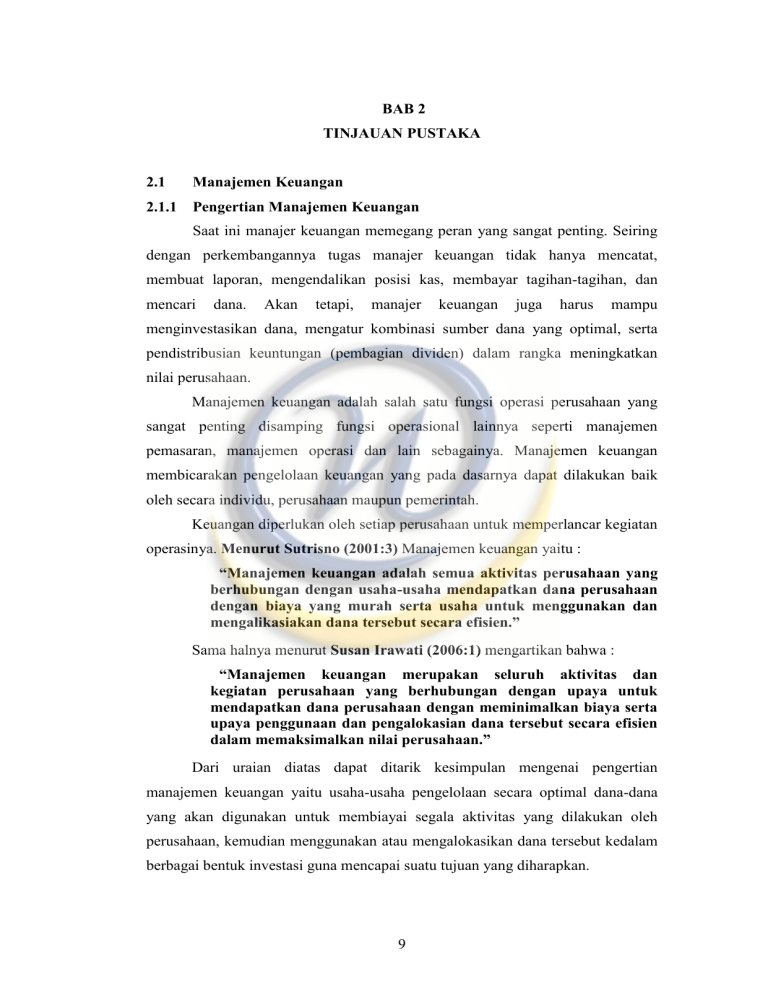 BAB 2 TINJAUAN PUSTAKA 2.1 Manajemen Keuangan 2.1.1 Pengertian Manajemen Keuangan Saat ini manajer keuangan memegang peran yang sangat penting. Seiring dengan perkembangannya tugas manajer keuangan tidak hanya mencatat, membuat laporan, mengendalikan posisi kas, membayar tagihan-tagihan, dan mencari dana. Akan tetapi, manajer keuangan juga harus mampu menginvestasikan dana, mengatur kombinasi sumber dana yang optimal, serta pendistribusian keuntungan (pembagian dividen) dalam rangka meningkatkan nilai perusahaan. Manajemen keuangan adalah salah satu fungsi operasi perusahaan yang sangat penting disamping fungsi operasional lainnya seperti manajemen pemasaran, manajemen operasi dan lain sebagainya. Manajemen keuangan membicarakan pengelolaan keuangan yang pada dasarnya dapat dilakukan baik oleh secara individu, perusahaan maupun pemerintah. Keuangan diperlukan oleh setiap perusahaan untuk memperlancar kegiatan operasinya. Menurut Sutrisno (2001:3) Manajemen keuangan yaitu : “Manajemen keuangan adalah semua aktivitas perusahaan yang berhubungan dengan usaha-usaha mendapatkan dana perusahaan dengan biaya yang murah serta usaha untuk menggunakan dan mengalikasiakan dana tersebut secara efisien.” Sama halnya menurut Susan Irawati (2006:1) mengartikan bahwa : “Manajemen keuangan merupakan seluruh aktivitas dan kegiatan perusahaan yang berhubungan dengan upaya untuk mendapatkan dana perusahaan dengan meminimalkan biaya serta upaya penggunaan dan pengalokasian dana tersebut secara efisien dalam memaksimalkan nilai perusahaan.” Dari uraian diatas dapat ditarik kesimpulan mengenai pengertian manajemen keuangan yaitu usaha-usaha pengelolaan secara optimal dana-dana yang akan digunakan untuk membiayai segala aktivitas yang dilakukan oleh perusahaan, kemudian menggunakan atau mengalokasikan dana tersebut kedalam berbagai bentuk investasi guna mencapai suatu tujuan yang diharapkan. 9 10 2.1.2 Fungsi Manajemen Keuangan Untuk mencapai tujuan perusahaan yang dikehendaki, perusahaan harus menjalankan fungsi-fungsi manajemen keuangan dengan baik. Fungsi manajemen keuangan menurut Sutrisno (2003:5) terdiri dari tiga keputusan utama yang harus dilakukan oleh suatu perusahaan, yaitu : 1. Keputusan Investasi Keputusan investasi adalah masalah bagaimana manajer keuangan harus mengalokasikan dana kedalam bentuk-bentuk investasi yang akan dapat mendapatkan keuntungan di masa yang akan datang. 2. Keputusan Pendanaan Keputusan pendanaan ini sering disebut sebagai kebijakan struktur modal. Pada keputusan ini manajer keuangan harus dituntut untuk mempertimbangkan dan menganalisis kombinasi dari sumber-sumber dana yang ekonomis bagi perusahaan guna membelanjai kebutuhan-kebutuhan investasi serta kegiatan usahanya. 3. Kebijakan Dividen Dividen merupakan bagian keuntungan yang dibayarkan oleh perusahaan kepada pemegang saham. Oleh karena itu dividen ini merupakan penghasilan yang diharapkan oleh para pemegang saham. 2.1.3 Tujuan Manajemen Keuangan Untuk dapat mengambil keputusan-keputusan keuangan yang benar, manajer keuangan perlu menentukan tujuan yang harus dicapai. Keputusan yang benar adalah keputusan yang akan membantu mencapai tujuan tersebut. Secara normatif tujuan keputusan keuangan adalah untuk memaksimalkan nilai perusahaan Husnan (2004:6). Tujuan perusahaan adalah meningkatkan kemakmuran para pemegang saham atau pemilik. Kemakmuran para pemegang saham diperlihatkan dalam wujud semakin tinggi harga saham, yang merupakan pencerminan dari keputusankeputusan investasi, pendanaan, dan kebijakan dividen. Maka tujuan dari manajemen keuangan adalah bagaimana perusahaan mengelola baik itu 11 mendapatkan dana maupun mengalokasiakan dana guna mencapai nilai perusahaan yaitu kemakmuran para pemegang saham Sutrisno (2003:5) 2.2 Pasar Modal 2.2.1 Pengertian Pasar Modal Setiap perusahaan membutuhkan pasar keuangan atau financial market untuk mendukung sumber dana. Pasar keuangan terdiri dari pasar uang (money market) dan pasar modal (capital market). Money markets atau pasar uang berkaitan dengan penyediaan dana-dana yang berjangka pendek, sementara pasar modal atau capital market berkaitan dengan penyedian dana-dana yang berjangka panjang. Pasar uang lebih banyak dimanfaatkan oleh perbangkan dan sebagian perusahaan-perusahaan besar, sedangkan pasar modal banyak dimanfaatkan oleh perusahaan-perusahaan untuk mencari dana dalam jumlah besar serta dimanfaatkan para investor untuk menanamkan dananya. Pasar modal merupakan kegiatan yang berhubungan dengan penawaran umum dan perdagangan efek, perusahaan publik yang berkaitan dengan efek yang diterbitkannya, serta lembaga dan profesi yang berkaitan dengan efek. Pasar modal menyediakan berbagai alternatif investasi bagi para investor selain alternatif investasi lainnya seperti : menabung di bank, membeli emas, asuransi, tanah dan bangunan, dan sebagainya. Pasar modal bertindak sebagai penghubung antara para investor dengan perusahaan ataupun institusi pemerintah melalui perdagangan intrumen keuangan jangka panjang seperti Obligasi, Saham dan lainnya. Para pemodal menggunakan instrumen pasar modal untuk keperluan investasi portofolionya sehingga nantinya akan memaksimumkan penghasilan dan emiten memperoleh tambahan dana yang dapat digunakan untuk meningkatkan aktivitas usahanya. Bursa Efek Indonesia (BEI) merupakan pasar modal utama indonesia. Pengertian pasar modal seperti yang tercantum dalam Undang-Undang Pasar Modal Nomor 8 Tahun 1995 tentang Pasar Modal adalah : ”Pasar modal adalah kegiatan yang bersangkutan dengan penawaran umum dan perdagangan efek, perusahaan publik yang berkaitan dengan efek yang diterbitkannya, serta lembaga dan profesi yang berkaitan dengan efek.” 12 Sedangkan bursa efek menurut UU Pasar Modal no.8 pasal 1 butir 4 tentang Bursa Efek adalah : “Bursa Efek adalah pihak yang menyelenggarakan dan menyediakan sistem dan atau sarana untuk mempertemukan penawaran jual dan beli efek, pihak-pihak lain dengan tujuan memperdagangkan efek diantara merek