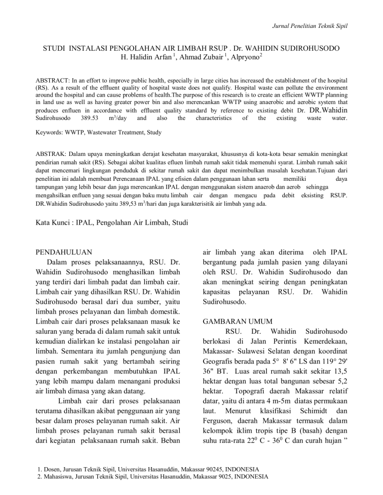 Jurnal Penelitian Teknik Sipil STUDI INSTALASI PENGOLAHAN AIR LIMBAH RSUP . Dr. WAHIDIN SUDIROHUSODO H. Halidin Arfan 1, Ahmad Zubair 1, Alpryono2 ABSTRACT: In an effort to improve public health, especially in large cities has increased the establishment of the hospital (RS). As a result of the effluent quality of hospital waste does not qualify. Hospital waste can pollute the environment around the hospital and can cause problems of health.The purpose of this research is to create an efficient WWTP planning in land use as well as having greater power bin and also merencankan WWTP using anaerobic and aerobic system that produces enfluen in accordance with effluent quality standard by reference to existing debit Dr. DR.Wahidin Sudirohusodo 389.53 m3/day and also the characteristics of the existing waste water. Keywords: WWTP, Wastewater Treatment, Study ABSTRAK: Dalam upaya meningkatkan derajat kesehatan masyarakat, khususnya di kota-kota besar semakin meningkat pendirian rumah sakit (RS). Sebagai akibat kualitas efluen limbah rumah sakit tidak memenuhi syarat. Limbah rumah sakit dapat mencemari lingkungan penduduk di sekitar rumah sakit dan dapat menimbulkan masalah kesehatan.Tujuan dari penelitian ini adalah membuat Perencanaan IPAL yang efisien dalam penggunaan lahan serta memiliki daya tampungan yang lebih besar dan juga merencankan IPAL dengan menggunakan sistem anaerob dan aerob sehingga mengahsilkan enfluen yang sesuai dengan baku mutu limbah cair dengan mengacu pada debit eksisting RSUP. DR.Wahidin Sudirohusodo yaitu 389,53 m3/hari dan juga karakterisitik air limbah yang ada. Kata Kunci : IPAL, Pengolahan Air Limbah, Studi PENDAHULUAN Dalam proses pelaksanaannya, RSU. Dr. Wahidin Sudirohusodo menghasilkan limbah yang terdiri dari limbah padat dan limbah cair. Limbah cair yang dihasilkan RSU. Dr. Wahidin Sudirohusodo berasal dari dua sumber, yaitu limbah proses pelayanan dan limbah domestik. Limbah cair dari proses pelaksanaan masuk ke saluran yang berada di dalam rumah sakit untuk kemudian dialirkan ke instalasi pengolahan air limbah. Sementara itu jumlah pengunjung dan pasien rumah sakit yang bertambah seiring dengan perkembangan membutuhkan IPAL yang lebih mampu dalam menangani produksi air limbah dimasa yang akan datang. Limbah cair dari proses pelaksanaan terutama dihasilkan akibat penggunaan air yang besar dalam proses pelayanan rumah sakit. Air limbah proses pelayanan rumah sakit berasal dari kegiatan pelaksanaan rumah sakit. Beban air limbah yang akan diterima oleh IPAL bergantung pada jumlah pasien yang dilayani oleh RSU. Dr. Wahidin Sudirohusodo dan akan meningkat seiring dengan peningkatan kapasitas pelayanan RSU. Dr. Wahidin Sudirohusodo. GAMBARAN UMUM RSU. Dr. Wahidin Sudirohusodo berlokasi di Jalan Perintis Kemerdekaan, Makassar- Sulawesi Selatan dengan koordinat Geografis berada pada 5° 8' 6" LS dan 119° 29' 36" BT. Luas areal rumah sakit sekitar 13,5 hektar dengan luas total bangunan sebesar 5,2 hektar. Topografi daerah Makassar relatif datar, yaitu di antara 4 m-5m diatas permukaan laut. Menurut klasifikasi Schimidt dan Ferguson, daerah Makassar termasuk dalam kelompok iklim tropis tipe B (basah) dengan suhu rata-rata 220 C - 360 C dan curah hujan ” 1. Dosen, Jurusan Teknik Sipil, Universitas Hasanuddin, Makassar 90245, INDONESIA 2. Mahasiswa, Jurusan Teknik Sipil, Universitas Hasanuddin, Makassar 9025, INDONESIA Jurnal Penelitian Teknik Sipil 2.000 - 3.000 mm, dan jumlah hari hujan ratarata 108 hari pertahun. RSUP. Dr. Wahidin Sudirohusodo dalam melaksakan aktifitasnya ditunjang oleh poliklinik spesialis dan sub spesialis yang ditangani oleh 270 dokter ahli meliputi pelayanan Bedah Umum, Bedah Tumor, Bedah Anak, Bedah Ortopedi, Bedah Urologi, Bedah Saraf, Kardiologi, Anak. Selain itu juga didukung oleh tenaga paramedis perawatan sebanyak 697 orang, tenaga Paramedis Non Perawatan sebanyak 290 orang, Tenaga non medis sebanyak 1014 orang. Debit (m3/hari) (m3/hari) Rata-rata (137 m3/hari) Maks (147 m3/hari) 170 160 150 140 130 120 110 100 1 3 5 7 9 11 13 15 17 19 21 23 25 27 29 31 Hari Gambar 1. Fluktuasi Debit Harian Eksisting Total penggunaan air di RSU. Dr. Wahidin Sudirohusodo, baik untuk proses pelayanan maupun kegiatan lain rata-rata sebesar 389.53 m3/hari yang berasal dari PDAM dan air tanah. Dari rata-rata penggunaan air bersih tersebut berasal dari pengunjung, pasien dan berbagai perangkat rumah sakit. Berikut adalah daftar pengunjung beserta pasien rumah sakit pada tahun 2012 yang dapat dilihat pada tabel 1. Tabel 1. Data Pengunjung dan Pasien Tahun (2012) Januari Februari Maret April Mei Juni Pengunjung 15467 13447 13200 13235 14135 12154 Pasien R.Inap R.Jalan 2314 17961 1973 14372 2120 14293 2095 14964 2161 15774 2207 14212 Berikut adalah gambar fluktuasi debit air limbah rumah sakit yang dapat dilihat pada gambar 1. Kualitas air limbah menyatakan banyaknya kontaminan yang terdapat dalam air limbah. Kontaminan di dalam air limbah dapat berupa kontaminan fisik, kimia, maupun biologi. Karakteristik utama air limbah RSU. Dr. Wahidin Sudirohusodo Makassar adalah kandungan COD yang ada di dalam air limbah yang sangat tinggi. Selain COD yang tinggi, karakteristik air limbah RSU. Dr. Wahidin Sudirohusodo adalah tingginya BOD, minyak dan lemak, serta TSS. Data kualitas air limbah RSU. Dr. Wahidin Sudirohusodo dapat dilihat pada tabel 2 dan tabel 3. Jurnal Penelitian Teknik Sipil Tabel 2. Data Kualitas Air Limbah Influen Parameter Temperatur TDS TSS pH Besi (Fe) m Fluorida (F) NTK Nitrat, sebagai N Nitrit, sebagai N P- total BOD COD total COD terlarut (sCOD) COD tidak terlarut (pCOD) Fenol MBAS Minyak&Lemak Satuan C mg/L mg/L mg/L mg/L mg/L mg/L mg/L mg/L mg/L mg/L mg/L mg/L mg/L mg/L mg/L Besaran 35 447 2030 3,4 1,302 12,41 28,016 28,5091 0,353 0,1069 12008 54090 35808 18282 0,134 0,471 2113,16 Data kualitas enfluen yang dihasilkan oleh IPAL RSUP. Dr. Wahidin Sudirohusodo yang diperoleh dari hasil tes laboratorium dapat dilihat pada tabel 3. Tabel 3. Data Kual