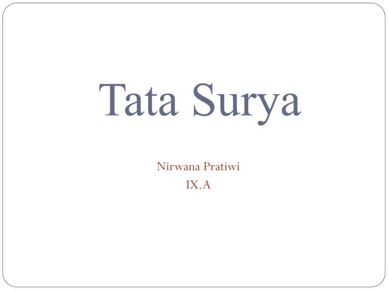 Tata Surya Nirwana Pratiwi IX.A Definisi Tata Surya Tata surya adalah kumpulan benda langit yang terdiri atas sebuah bintang yang disebut Matahari dan semua objek yang terikat oleh gaya gravitasinya. Objek-objek tersebut termasuk delapan buah planet yang sudah diketahui dengan orbit berbentung elips, lima planet kerdil/kadai, 173 satelit alami yang telah diidentifikasi, dan jutaan benda langit (meteor, asteroid, komet) lainnya. Teori Asal Usul Tata Surya Teori Nebula Teori ini dikemukakan oleh Immanuel Kent dan disempurnakan lagi oleh Pierre Marquis de Leplace. Menurut teori ini, tata surya terbentuk dari kabut raksaksa yang terbentuk dari debu, es, dan gas yang disebut nebula. Karena gaya gravitasi yang dimilikinya, kabut itu menyusut dan berputar dengan arah tertentu dan berbentuk seperti cakram. Karena perputarannya yang sangat cepat, maka ujung-ujung cakram itu terlepas dan akhirnya menjadi planet-planet seperti sekarang. Inti cakram yang tidak terlepas menjadi matahari. Teori Planetesimal Teori ini dikemukakan oleh Thomas C. Chamberlin dan Forest R. Moulton. Teori ini berpendapat bahwa sebelumnya Matahari telah terlebih dahulu ada di langit, namun suatu waktu melintas sebuah bintang yang jaraknya tidak terlalu jauh dari Matahari. Akibatnya, terjadi peristiwa pasang naik pada permukaan Matahari maupun bintang itu sehingga sebagian dari massa Matahari tertarik ke arah bintang mirip lidah raksasa. Pada saat bintang itu menjauhi Matahari, sebagian dari massa yang tertarik itu kembali jatuh ke permukan matahari, dan sebagian lagi terhambur ke ruang angkasa di sekitar Matahari menjadi planet-planet, dan benda langit lainnya. Teori Bintang Kembar Dari teori ini, tata surya dijelaskan bermula dari terdapatnya dua bintang kembar, kemudian satu bintang itu meledak menjadi serpihan kecil. Akibat medan gravitasi bintang yang tidak meledak, serpihan itu berputar mengelilinginya. Dari serpihan inilah terbentuk planet dan benda langit lainnya, sedangkan bintang yang utuh adalah Matahari. Tata Surya Neptunus Merkurius Venus Uranus Saturnusu s Yupiter Komet Bumi Mars Asteroid Hukum Keppler Hukum Keppler adalah hukum-hukum yang menjelaskan tentang gerak planet. Hukum Keppler I Bunyi Hukum Keppler I: “Orbit setiap planet berbentuk elips dan matahari terletak di salah satu titik fokusnya.” Titik Aphelium: titik terjauh dari matahari. Titik Perihelium: titik terdekat dari matahari. Hukum Keppler III Bunyi Hukum Keppler III: “Perbandingan antara kuadrat kala (periode) revolusi dengan pangkat tiga jarak rata-rata planet matahari adalah konstan. Persamaannya: Hukum Keppler II Bunyi Hukum Keppler II: “Garis hubung planet dengan matahari selama revolusi menyapu luas daerah yang sama dalam waktu tempuh yang sama.” T1: Waktu revolusi planet pertama T2: Waktu revolusi planet kedua R1: Jarak planet pertama ke matahari R2: Jarak planet kedua ke matahari Aphelium dan Perihelium Perihelium adalah kedudukan terdekat ke Matahari. Aphelium adalah kedudukan terjauh ke Matahari. Pengelompokan Planet Berdasarkan sabuk asteroid Planet Dalam Adalah Planet yang orbitnya berada dalam peredaran Asteroid. Planet yang termasuk planet dalam adalah Merkurius, Venus, Bumi, dan Mars. Planet Luar Adalah planet yang orbitnya berada dalam peredaran Asteroid. Planet yang termasuk planet luar adalah Yupiter, Saturnus, Uranus, dan Neptunus. Berdasarkan Ukurannya Planet Terestial Adalah planet yang mempunyai ukuran dan massa yang lebih kecil ataupun sama dengan bumi. Planet yang termasuk planet terestial adalah Merkurius, Venus, Bumi, dan Mars. Planet Jovian Adalah planet yang mempunyai ukuran dan massa yang lebih besar dari bumi. Planet yang termasuk planet jovian adalah Yupiter, Saturnus, Uranus, dan Neptunus Planet Terestial Planet Jovian Berdasarkan Bumi sebagai pembatasnya Planet Inferior Planet Superior Adalah planet yang orbitnya terletak di antara orbit Bumi dan Matahari. Adalah planet yang orbitnya terletak di luar orbit bumi. Planet yang termasuk planet inferior adalah planet Merkurius dan Venus. Planet yang termasuk planet superior adalah Mars, Yupiter, Saturnus, Uranus, dan Neptunus. Matahari Matahari adalah bintang terdekat dengan Bumi dengan jarak rata-rata 149.680.000 km (93.026.724 mil). Lapisan-Lapisan Matahari Inti Matahari Inti Matahari adalah bagian matahari yang mempunya suhu sekitar 15 juta derajat celsius. Lapisan ini merupakan tempat terjadinya reaksi nuklir fusi yang disertai dengan pelepasan energi yang sangat besar. Dalam lapisan ini terdapat zona radiatif dan zona konvektif. Zona radiatif adalah lapisan yang menyelubungi bagian inti. Lapisan ini mempunyai suhu dari dalam ke luar adalah sekitar tujuh juta sampai dua juta derajat celsius. Zona konvektif adalah lapisan yang suhunya sudah menurun. Suhu lapisan ini sekitar dua juta derajat celcius. Setelah keluar dari zona radiatif, atom-atom bagian inti ini akan bergerak menuju lapisan yang lebih luar dengan suhu yang lebih rendah. Fotosfer Fotosfer adalah lapisan permukaan Matahari yang dapat mengeluarkan sinar. Gas-gas dalam fotosfer memancarkan cahaya yang sangat kuat sehingga tampak berwarna kuning. Kromosfer Kromosfer adalah lapisan di atas fotosfer bersuhu sekitar enam ribu sampai 50 ribu derajat celcius. Lapisan ini mengeluarkan cahaya merah lemah dan hanya dapat dilihat pada saat gerhana matahari total. Korona Korona adalah lapisan terluar matahari. Lapisan berwarna putih ini akan terlihat mengelilingi matahari pada saat terjadinya gerhana matahari. Lapisan ini merupakan lapisan gas tipis dan bentuknya selalu berubah-ubah. Aktivitas Matahari Sunspot (Noda Hitam) Sunspot adalah bintik hitam yang biasa tampak di permukaan matahari. Sunspot di matahari memiliki medan magnet yang sangat besar mencapai 10004000 Gauss. Prominensa (Lidah Api) Adalah loncatan api yang menjulur dari fotosfer sampi keluar matahari. Granula (Gumpalan Adalah gas panas yang mengepul dan bergumpal-gumpal pada fotosfer. Planet-Planet dalam Sistem Tata Surya Merkurius Merkurius a