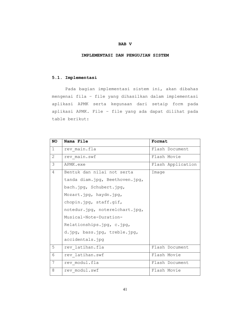BAB V IMPLEMENTASI DAN PENGUJIAN SISTEM 5.1. Implementasi Pada bagian implementasi sistem ini, akan dibahas mengenai fila – file yang dihasilkan dalam implementasi aplikasi APMK serta kegunaan dari setaip form pada aplikasi APMK. File – file yang ada dapat dilihat pada table berikut: NO Nama File Format 1 rev_main.fla Flash Document 2 rev_main.swf Flash Movie 3 APMK.exe Flash Application 4 Bentuk dan nilai not serta Image tanda diam.jpg, Beethoven.jpg, bach.jpg, Schubert.jpg, Mozart.jpg, haydn.jpg, chopin.jpg, staff.gif, notedur.jpg, noterelchart.jpg, Musical-Note-DurationRelationships.jpg, c.jpg, d.jpg, bass.jpg, treble.jpg, accidentals.jpg 5 rev_latihan.fla Flash Document 6 rev_latihan.swf Flash Movie 7 rev_modul.fla Flash Document 8 rev_modul.swf Flash Movie 41 9 rev_media.fla Flash Document 10 rev_media.swf Flash Movie 11 rev_about.fla Flash Document 12 rev_about.swf Flash Movie 13 Bach Toccata and Fugue in D Video minor, BWV 565.mp4, Beethoven Symphony No. 5 (FULL).mp4, Beethoven 3rd Symphony (1_5); 1st movement; Bernstein – YouTube.mp4, Chopin Nocturne Op.9 No.2 (Arthur Rubinstein).mp4, Four Seasons ~ Vivaldi – YouTube.mp4, Maurice Ravel – Bolero.mp4, Music Theory- Note Names, Rests & Dotted Notes.flv, How To Read Sheet Music - The Basics.flv 14 Mozart Pachelbel – Canon in Sound D.mp3 Tabel 5.1 Tabel Implementasi 42 5.1.1. Halaman Utama Tabel 5.1.1 Gambar Antarmuka Halaman Utama Halaman Utama (gambar 5.1.1) merupakan halaman utama dari program APMK, pada halaman utama terdapat pilihan tombol – tombol untuk menuju ke halaman Modul, Latihan, Media, dan About. 43 5.1.2. Halaman Modul – Pengertian Musik Klasik Tabel 5.1.2 Gambar Antarmuka Halaman Modul – Pengertian Musik Klasik Pada halaman Modul – Pengertian Musik Klasik (gambar 5.1.2) terdapat pilihan tombol untuk kembali ke halaman utama dank e halaman selanjutnya dari modul. Halaman Modul – Pengertian Musik Klasik ini berisi tentang pengertian tentang musik klasik secara umum. 44 5.1.3. Halaman Modul – Karakteristik Musik Klasik Tabel 5.1.3 Gambar Antarmuka Halaman Modul – Karakteristik Musik Klasik Pada Halaman Klasik(gambar Modul 5.1.3) – terdapat Karakteristik pilihan tombol Musik untuk kembali ke halaman utama, ke halaman sebelumnya dan ke halaman selanjutnya tentang penjelasan dari modul. tentang klasik. 45 Halaman karakteristik ini dari berisi musik 5.1.4. Halaman Modul – Para Komposer Musik Klasik: Haydn Tabel 5.1.4 Gambar Antarmuka Halaman Modul – Para Komposer Musik Klasik: Haydn Pada Halaman Modul – Para Komposer Musik Klasik: Haydn(gambar 5.1.4) terdapat pilihan tombol untuk kembali ke halaman utama, ke halaman sebelumnya dan ke halaman selanjutnya tentang penjelasan dari modul. tentang Haydn. 46 Halaman sejarah ini berisi kehidupan Joseph 5.1.5. Halaman Modul – Para Komposer Musik Klasik: Bach Tabel 5.1.5 Gambar Antarmuka Halaman Modul – Para Komposer Musik Klasik: Bach Pada Halaman Modul – Para Komposer Musik Klasik: Bach(gambar 5.1.5) terdapat pilihan tombol untuk kembali ke halaman utama, ke halaman sebelumnya dan ke halaman selanjutnya dari modul. Halaman ini berisi tentang penjelasan tentang sejarah kehidupan J.S.Bach. 47 48 5.1.6. Halaman Modul – Para Komposer Musik Klasik: Schubert Tabel 5.1.6 Gambar Antarmuka Halaman Modul – Para Komposer Musik Klasik: Schubert Pada Halaman Modul – Para Komposer Musik Klasik: Schubert(gambar 5.1.6) terdapat pilihan tombol untuk kembali ke halaman utama, ke halaman sebelumnya dan ke halaman selanjutnya tentang penjelasan dari modul. tentang Schubert. 49 Halaman sejarah ini kehidupan berisi Franz 5.1.7. Halaman Modul – Para Komposer Musik Klasik: Beethoven Tabel 5.1.7 Gambar Antarmuka Halaman Modul – Para Komposer Musik Klasik: Beethoven Pada Halaman Modul – Para Komposer Musik Klasik: Beethoven(gambar 5.1.7) terdapat pilihan tombol untuk kembali ke halaman utama, ke halaman sebelumnya dan ke halaman selanjutnya dari modul. Halaman ini berisi tentang penjelasan tentang sejarah kehidupan Beethoven. 50 5.1.8. Halaman Modul – Para Komposer Musik Klasik: Mozart Tabel 5.1.8 Gambar Antarmuka Halaman Modul – Para Komposer Musik Klasik: Mozart Pada Halaman Modul – Para Komposer Musik Klasik: Mozart(gambar 5.1.8) terdapat pilihan tombol untuk kembali ke halaman utama, ke halaman sebelumnya dan ke halaman selanjutnya dari modul. Halaman ini berisi tentang penjelasan tentang sejarah kehidupan Mozart. 51 5.1.9. Halaman Modul – Para Komposer Musik Klasik: Chopin Tabel 5.1.9 Gambar Antarmuka Halaman Modul – Para Komposer Musik Klasik: Chopin Pada Halaman Modul – Para Komposer Musik Klasik: Chopin(gambar 5.1.9) terdapat pilihan tombol untuk kembali ke halaman utama, ke halaman sebelumnya dan ke halaman selanjutnya dari modul. 52 Halaman ini berisi tentang penjelasan tentang sejarah kehidupan Franz Chopin. 5.1.10. Halaman Modul – Analisa Lagu Tabel 5.1.10 Gambar Antarmuka Halaman Modul – Analisa Lagu Pada Halaman Modul – Analisa Lagu(gambar 5.1.10) terdapat pilihan tombol untuk kembali ke halaman utama, ke halaman sebelumnya dan ke halaman selanjutnya dari 53 modul. Halaman ini berisi tentang penjelasan tentang analisa beberapa lagu – lagu musik klasik. 5.1.11. Halaman Modul – Sound Tabel 5.1.11 Gambar Antarmuka Halaman Modul – Sound Pada Halaman Modul – Sound(gambar 5.1.11) terdapat pilihan tombol untuk halaman sebelumnya kembali dan ke ke halaman halaman utama, selanjutnya ke dari modul. Halaman ini berisi tentang penjelasan tentang pengertian dan pembagian jenis – jenis bunyi. 54 5.1.12. Halaman Modul – Rhythm Tabel 5.1.12 Gambar Antarmuka Halaman Modul – Rhythm Pada Halaman Modul – Rhythm(gambar 5.1.12) terdapat pilihan tombol untuk kembali ke halaman utama, ke halaman sebelumnya dan ke halaman selanjutnya dari modul. Halaman ini berisi tentang penjelasan tentang pengertian dan pembagian jenis – jenis ritme. 55 5.1.13. Halaman Modul – Notasi Musik Tabel 5.1.13 Gambar Antarmuka Halaman Modul – Notasi Mu