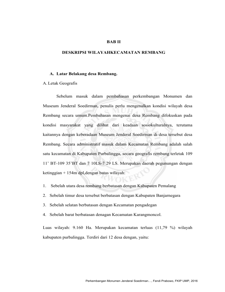 BAB II DESKRIPSI WILAYAHKECAMATAN REMBANG A. Latar Belakang desa Rembang. A. Letak Geografis Sebelum masuk dalam pembahasan perkembangan Monumen dan Museum Jenderal Soedirman, penulis perlu mengenalkan kondisi wilayah desa Rembang secara umum.Pembahasan mengenai desa Rembang difokuskan pada kondisi masyarakat yang dilihat dari keadaan sosiokulturalnya, terutama kaitannya dengan keberadaan Museum Jenderal Soedirman di desa tersebut desa Rembang. Secara administratif masuk dalam Kecamatan Rembang adalah salah satu kecamatan di Kabupaten Purbalingga, secara geografis rembang terletak 109 11‟ BT-109 35‟BT dan 7 10LS-7 29 LS. Merupakan daerah pegunungan dengan ketinggian + 154m dpl,dengan batas wilayah: 1. Sebelah utara desa rembang berbatasan dengan Kabupaten Pemalang 2. Sebelah timur desa tersebut berbatasan dengan Kabupaten Banjarnegara 3. Sebelah selatan berbatasan dengan Kecamatan pengadegan 4. Sebelah barat berbatasan denagan Kecamatan Karangmoncol. Luas wilayah: 9.160 Ha. Merupakan kecamatan terluas (11,79 %) wilayah kabupaten purbalingga. Terdiri dari 12 desa dengan, yaitu: Perkembangan Monumen Jenderal Soedirman…, Fendi Prabowo, FKIP UMP, 2016 Tabel 1 Daftar Nama Desa Di Kecamatan Rembang 33.03.13 Kecamatan Luas Rembang (HA) 33.03.13.2001 Wlahar 436,520 33.03.13.2002 Bantar Barang 965,535 33.03.13.2003 Karang Bawang 361,714 33.03.13.2004 Gunung Wuled 563,000 33.03.13.2005 Losari 717,525 33.03.13.2006 Bodas Karang Jati 266,344 33.03.13.2007 Wanogara Wetan 212,835 33.03.13.2008 Wanogara Kulon 129,000 33.03.13.2009 Makam 576,000 33.03.13.2010 Sumampir 575,000 33.03.13.2011 Tanalum 455,000 33.03.13.2012 Panusupan 930,000 Sumber: Data Wilayah Kecamatan Rembang Rembang dengan kondisi wilayahya yang luas, penduduknya yang cukup padat dan didukung dengan struktur dan kontur tanahnya yang berbukit atau dataran tinggi daerah ini cocok untuk perkebunan, pertanian, kehutanan dan merupakan daerah yang potensial untuk pariwisata. Dengan kontur tanahnya yang berjenis tanah Latosol Coklat Dan Regosol Coklat, Aluvial Coklat Tua, Latosol Perkembangan Monumen Jenderal Soedirman…, Fendi Prabowo, FKIP UMP, 2016 Merah Kuning Kecamatan Rembang memiliki kekayaan alam yang cukup beragam, antara lain berupa Andesit, Batu Gamping, Batu Lempung, Batu Pasir, Kalsit. Secara makro, keadaan Geografis Kecamatan Rembang dapat di bagi menjadi dua bagian yang masing-masing mempunyai potensi yang menguntungkan secara ekonomis, yaitu: a. Bagian utara dengan kondisi tanah yang berbukit atau dataran tinggi daerah ini terdapat kawasan hutan produksi, hutan rakyat, pertanian, pertanian hortikultura, dan merupakan daerah potensial untuk pariwisata. b. Bagian selatan terdiri dari daerah yang lebih rendah atau datar, sangat cocok untuk peternakan, perikanan, kawasan pertambangan, kawasan industri kecil. B. Topografis Keadaan wilayah Kecamatan Rembang terdiri dari dataran dan perbukitan dengan struktur perbukitan terdiri dari Utara untuk pertanian, sebagian dataran tinggi untuk daerah wisata dan pemukiman, sementara daerah yang lebih datar di fungsikan sebagai area peternakan. Perkembangan Monumen Jenderal Soedirman…, Fendi Prabowo, FKIP UMP, 2016 Tabel 2 Pemanfaatan Lahan No Uraian Hektare % 1 Sawah irigrasi 314 Ha 46 2 Sawah tadah hujan 30 Ha 4,47 3 Tegalan 135 Ha 20 4 Pemukiman 52 Ha 7,74 5 Tanah perkebunan rakyat 52 Ha 7,74 6 Kas desa 49,9 Ha 7,4 7 Lapangan 0,75 Ha 0,1 8 Perkantoran pemerintah 0,0495 Ha 0,0073 9 Lainya 18 Ha 2,6 Sumber: Data Wilayah Kecamatan Rembang Kecamatan Rembang adalah salah satu kecamatan di Kabupaten Purbalingga, secara geografis merupakan daerah pegunungan dengan ketinggian + 154m dpl yaitu seluas 91,59 ha dengan jumlah penduduk 7kepadatan penduduk 715 jiwa C. Kehidupan Sosial Budaya Secara sosiokultural, masyarakat di desa Rembang memiliki kebiasaan yang berbeda dengan desa – desa tetangganya. Dengan jumlah penduduk 7,713 yang terdiri dari 4,615 laki – laki dan 3.098 perempuan, secara keseluruhan masyarakat desa Rembang menganut agama Islam. Perkembangan Monumen Jenderal Soedirman…, Fendi Prabowo, FKIP UMP, 2016 Dilihat dari mata pencahariannya secara umum masyarakat desa Rembang bekerja pada sektor pertanian dan perdagangan , sawah tadah hujan, untuk yang dekat sungai Bodas sekarang sudah dibangun irigasi menggunakan tenaga disel. Perkebunan yang ditanami kayu alba, kelapa, jati, mahoni, sekarang bertambah lagi pohon karet. Dengan penanaman pohon karet banyak sawah yang dikeringkan sehingga luas sawah berkurang. Desa Bodaskarangjati dapat dicapai sekitar 30 KM dari pusat kota Purbalingga. Dari arah Bancar sekitar 20 menit akan ada perempatan, selanjutnya ambil jalur kiri, dan setelah memasuki desa Bantarbarang kearah monumen Jenderal Soedirman, setelah itu ambil kanan, setelah melewati satu tanjakan disitulah tempat kelahiran Panglima Besar Jenderal Soedirman, desa yang dikelilingi bukit-bukit, dengan suasana yang dibilang masih asri dan sejuk. Banyak masyarakat yang bergantung pada bidang pertanian, selain itu berdagang juga menjadi salah satu mata pencaharian sebagian masyarakat desa Bodaskarangjati, mereka merantau ke berbagai daerah, seperti pulau Sumatra, Kalimantan, Sulawesi. Terdapat satu sekolah menengah atas yaitu SMK N 1 Rembang Purbalingga, yang baru dibangun pada tahun 2013 yang terletak di perbatasan antara desa Bodaskrangjati dan desa Makam. Desa Bodaskrangjati merupakan salah satu pusat pemerintahan dikecamatan Rembang kabupaten Purbalingga, yang mana tempat – tempat umum seperti KUA, POLSEK, KUD, berada di desa ini. Perkembangan Monumen Jenderal Soedirman…, Fendi Prabowo, FKIP UMP, 2016 I. Mengapa disebut Desa Bodaskarangjati Pada waktu almarhum R. Tjokrosoenarjo menjabat sebagai Asisten Wedana, maka wilayah hukum yang menjadi daerah tugas tanggung jawabnyalah Onderdistrik Bodaskarangjati, Distrik Cahaya, Kabupaten Purbalingga. Kemudian nama berubah menjadi Kecamatan Rembang, Kawedanan Bukateja, Kabupaten Purbalingga. Rupanya penulis masih terpancang kepada nama