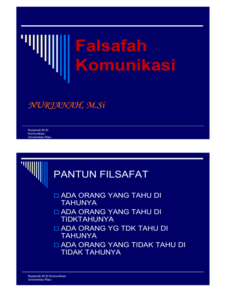 Falsafah Komunikasi NURJANAH, M.Si Nurjanah,M.Si Komunikasi Universitas Riau PANTUN FILSAFAT ADA ORANG YANG TAHU DI TAHUNYA ADA ORANG YANG TAHU DI TIDKTAHUNYA ADA ORANG YG TDK TAHU DI TAHUNYA ADA ORANG YANG TIDAK TAHU DI TIDAK TAHUNYA Nurjanah,M.Si Komunikasi Universitas Riau BGM CARANYA AGAR MENDAPAT PENGETAHUAN YG BENAR? 1. KETAHUILAH APA YG KAU KETAHUI 2. KETAHUILAH APA YG TDK KAU KETAHUI 1.PENGETAHUAN 1.PENGETAHUAN DIMULAI DG RASA INGIN TAHU 2.KEPASTIAN 2.KEPASTIAN DIMULAI DG RASA RAGURAGU-RAGU 3.FILSAFAT 3.FILSAFAT DIMULAI DG KEDUAKEDUANurjanah,M.Si Komunikasi DUANYA Universitas Riau Dasar Pengetahuan Penalaran : kemampuan bernalar menyebabkan manusia mampu mengembangkan pengetahuan yg merupakan rahasia kekuasaannya. Scr simbolik manusia memakan buah pengetahuan lewat adam dan hawa. Stelah itu manusia hrs hidup berbekal pengetahuan itu. Dia mengetahui mana yg benar mana yg salah, mana yg baik mana yg buruk, mana yg indah mana yg jelek. Scr terus menerus dia dipaksa utk mengambil pilihan. Dlm melakukan pilihan manusia berpaling kpd ilmu pengetahuan Nurjanah,M.Si Komunikasi Universitas Riau Manusia mampu mengembangkan pengetahuan disebbkan 2 hal: Manusia mempunyai bahasa yg mampu mengkomunikasikan informasi dan jalan fikiran yg melatarbelakangi informasi itu. Kemampuan berfikir menurut suatu alur kerangka berfikir tertentu. Penalaran adalah proses berfikir dlm menarik sesuatu kesimpulan yg berupa pengetahuan Nurjanah,M.Si Komunikasi Universitas Riau BERFILSAFAT BERARTI BERENDAH HATI BHW TDK SEMUANYA AKAN KT KETAHUI DLM KEMESTAAH YG TAK TERBATAS MENGOREKSI DIRI Nurjanah,M.Si Komunikasi Universitas Riau BERFILSAFAT TTG ILMU BERARTI : BERTERUS TERANG PD DIRI KT SENDIRI TTG • APAKH SEBENARNYA YG SY KETAHUI TTG ILMU? • APKH CIRI-CIRINYA YG MEMBEDAKAN ILMU DG PENGETAHUAN LAINNYA? • BGMN SY KETAHUI BHW ILMU MERUPAKAN PENGETAHUAN YG BENAR? • KRITERIA APA YG KT PAKAI DLM MENENTUKAN KEBENARAN SCR ILMIAH? • MGP MESTI MEMPELAJARI ILMU? Nurjanah,M.SiKT Komunikasi Universitas Riau Falsafah sbg landasan teoritis Kata Filsafat dari bhs Yunani “Philosopia” Philo atau philien artinya “cinta” Sophia artinya :kebenaran” Scr istilah filsafat berarti: mencintai kebenaran. Dlm upaya mencapai suatu kebenaran dg kesadaran penuh di dlm perbuatannya Nurjanah,M.Si Komunikasi Universitas Riau Lanjutan8.. Pembahasan filsafat : sbg pandangan hidup, asas atau pendirian: (suatu nilai kebenaran yg dpt diterima dan diyakini sbg pandangan hidup, prinsip2, dan pedoman yg berkaitan dg filsafat etika, kode prilaku, kode profesi, tindakan etis scr moral dan norma2 atau kaedah2 yg berlaku dimsyrakat. Landasan pemikiran: (bersumber pd kebijaksanaan moral ttg segala sesuatu yg akan dan hrs diterapkan dlm praktek. Nurjanah,M.Si Komunikasi Universitas Riau Falsafah Komunikasi Persuasif Berangkat dr 3 pertanyaan: 1. Apa yang dikaji oleh ilmu ini? (Ontologi) 2. Bagamana cara memperoleh pengetahuan? (Epistemologi) 3. Untuk apa pengetahuan ini digunakan.(Aksiologi) Nurjanah,M.Si Komunikasi Universitas Riau Cabang filsafat Komunikasi Persuasif antara lain: ONTOLOGI EPISTIMOLOGI AKSIOLOGI Nurjanah,M.Si Komunikasi Universitas Riau Ontologi dlm kaitannya dg k’kasi persuasif Sampai tingkat mana manusia menentukan pilihannya scr realistis? (perilaku manusia pd dasarnya ditimbulkan olh kondisi awal yg bersifat reaktif dan pasif) Sampai tingkat mana manusia memahami ttg perbedaan apa yg dinyatakan dan yg dicirikan (manusia bersifat dinamis) Nurjanah,M.Si Komunikasi Universitas Riau Sampai taraf mana perbedaan pengalaman individu dan pengalaman sosial manusia? Sampai tingkat mana pengkontekstualisasian komunikasi? (dg menggunakan prinsip universal dan situasional) Nurjanah,M.Si Komunikasi Universitas Riau Ontologi adalah ilmu yang membahas tentang hakikat yang ada, yang merupakan ultimate reality baik yang berbentuk jasmani/konkret maupun rohani/abstrak (Bakhtiar, 2004) Ontologi menjawab : pertanyaan ttg hakekat yg dikaji oleh ilmu (bgmn cara memperoleh pengetahuan) Nurjanah,M.Si Komunikasi Universitas Riau Hakekat yg dikaji dlm k’kasi Interaksi sosial Tujuan: utk mempengaruhi sikap, pendapt dan perilaku org lain melalui kegiatan komunikasi, baik scr verbal maupun non verbal Nurjanah,M.Si Komunikasi Universitas Riau Ontologi (lanjutan2) Menyangkut pertanyaan apa yang dikaji oleh suatu ilmu Hakekat yg dikaji dlm komunikasi adh interaksi sosial Tujuan: mempengaruhi sikap pendpt, dan perilaku org la Nurjanah,M.Si Komunikasi Universitas Riau EPISTOMOLOGI Cara mendapatkan pengetahuan yang benar Aspek epistemologi atau pertanyaan yg berkaitan dg pengetahuan, mempelajari pengetahuan atau bgmn seseorg mengetahui apa yg mrk anggap tahu. Nurjanah,M.Si Komunikasi Universitas Riau Epistemologi dpt dikembangkan melalui pertanyaan Sampai tarap apa pengetahuan dpt eksis sebelum pengalaman (pengetahuan berasal dr pengalaman lewat observasi) Sampai taraf mana pengetahuan bersifat ajeg (pasti): relativisme ilmu Nurjanah,M.Si Komunikasi Universitas Riau Melalui proses apa pengetahuan dpt muncul (melalui persepsi. Pengetahuan merupakan produk dr interaksi simbolik) Apakah pengetahuan disusun dlm bagian per bagian atau secara keseluruhan (kebenaran bersifat umum, pemahamannya menyeluruh yg berhubungan dg fenomena d berjln sbg sebuah sistem) Sampai taraf mana pengetahuan itu ekspilisit (pengetahuan terbentuk dr interaksi antara yg mengetahui dan yg diketahui. Pengetahuan adlh interpretasi Nurjanah,M.Si Komunikasi Universitas Riau AKSIOLOGI Nilai kegunaan ilmu/ Untuk apa ilmu itu dipergunakan Nurjanah, M.Si Nurjanah,M.Si Komunikasi Universitas Riau Aspek Aksiologi Aspek Aksiologi, yaitu komponen pengetahuan/ilmu yang membahas tata guna ilmu pengetahuan, teori tentang nilai yang menjadi azas dalam penggunaan ilmu pengetahuan yang telah diperoleh dari hasil knowing (nalar/berfikir) Nurjanah,M.Si Komunikasi Universitas Riau Kajian Aksiologi: Utk apa pengetahuan itu dipergunakan Utk taraf yg bgmn praktik penelitian berpengaruh terhadap apa yg a