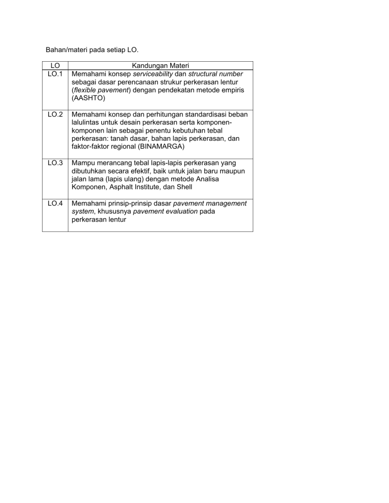 Bahan/materi pada setiap LO. LO LO.1 Kandungan Materi Memahami konsep serviceability dan structural number sebagai dasar perencanaan strukur perkerasan lentur (flexible pavement) dengan pendekatan metode empiris (AASHTO) LO.2 Memahami konsep dan perhitungan standardisasi beban lalulintas untuk desain perkerasan serta komponenkomponen lain sebagai penentu kebutuhan tebal perkerasan: tanah dasar, bahan lapis perkerasan, dan faktor-faktor regional (BINAMARGA) LO.3 Mampu merancang tebal lapis-lapis perkerasan yang dibutuhkan secara efektif, baik untuk jalan baru maupun jalan lama (lapis ulang) dengan metode Analisa Komponen, Asphalt Institute, dan Shell LO.4 Memahami prinsip-prinsip dasar pavement management system, khususnya pavement evaluation pada perkerasan lentur