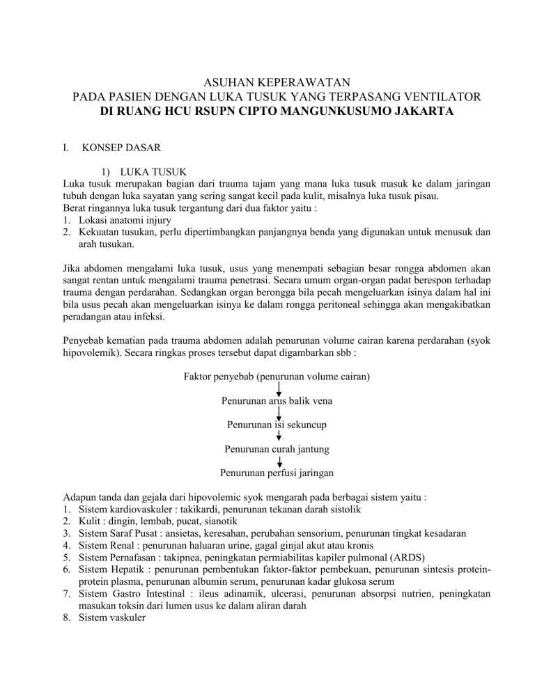 ASUHAN KEPERAWATAN PADA PASIEN DENGAN LUKA TUSUK YANG TERPASANG VENTILATOR DI RUANG HCU RSUPN CIPTO MANGUNKUSUMO JAKARTA I. KONSEP DASAR 1) LUKA TUSUK Luka tusuk merupakan bagian dari trauma tajam yang mana luka tusuk masuk ke dalam jaringan tubuh dengan luka sayatan yang sering sangat kecil pada kulit, misalnya luka tusuk pisau. Berat ringannya luka tusuk tergantung dari dua faktor yaitu : 1. Lokasi anatomi injury 2. Kekuatan tusukan, perlu dipertimbangkan panjangnya benda yang digunakan untuk menusuk dan arah tusukan. Jika abdomen mengalami luka tusuk, usus yang menempati sebagian besar rongga abdomen akan sangat rentan untuk mengalami trauma penetrasi. Secara umum organ-organ padat berespon terhadap trauma dengan perdarahan. Sedangkan organ berongga bila pecah mengeluarkan isinya dalam hal ini bila usus pecah akan mengeluarkan isinya ke dalam rongga peritoneal sehingga akan mengakibatkan peradangan atau infeksi. Penyebab kematian pada trauma abdomen adalah penurunan volume cairan karena perdarahan (syok hipovolemik). Secara ringkas proses tersebut dapat digambarkan sbb : Faktor penyebab (penurunan volume cairan) Penurunan arus balik vena Penurunan isi sekuncup Penurunan curah jantung Penurunan perfusi jaringan Adapun tanda dan gejala dari hipovolemic syok mengarah pada berbagai sistem yaitu : 1. Sistem kardiovaskuler : takikardi, penurunan tekanan darah sistolik 2. Kulit : dingin, lembab, pucat, sianotik 3. Sistem Saraf Pusat : ansietas, keresahan, perubahan sensorium, penurunan tingkat kesadaran 4. Sistem Renal : penurunan haluaran urine, gagal ginjal akut atau kronis 5. Sistem Pernafasan : takipnea, peningkatan permiabilitas kapiler pulmonal (ARDS) 6. Sistem Hepatik : penurunan pembentukan faktor-faktor pembekuan, penurunan sintesis proteinprotein plasma, penurunan albumin serum, penurunan kadar glukosa serum 7. Sistem Gastro Intestinal : ileus adinamik, ulcerasi, penurunan absorpsi nutrien, peningkatan masukan toksin dari lumen usus ke dalam aliran darah 8. Sistem vaskuler 2) KONSEP GAGAL NAFAS Definisi : Gagal nafas akut diartikan sebagai kegagaln pertukaran gas dalam paru, ditandai dengan turunnya kadar oksigen di arteri (hipoksemia) atau naiknya kadar karbon dioksida (hiperkarbia) atau kombinasi keduanya. Kriteria diagnosis pada pasien yang bernafas pada udara kamar didapatkan hasil pemeriksaan analisa gas darah : 1. PaO2 kurang dari 50 mmHg 2. PaCO2 lebih dari 50mmHg tanpa ada gangguan alkalosis metabolik primer Gagal nafas dapat diakibatkan oleh bermacam penyakit baik akut maupun kronik; setiap gangguan pada kelima tahap respirasi dapat menyebabkan gagal nafas. a. Patofisiologi Mekanisme yang menyebabkan terjadinya gagal nafas meliputi : 1. Hypoventilasi : keadaan dimana seseorang tidak dapat mempertahankan ventilasi alveolar yang cukup, sehingga terjadi kenaikan kadar CO2 dalam darah 2. Gangguan perfusi dan difusi Adanya emboli di salah satu cabang arteri pulmonali akan meningkatkan ruang rugi karena banyak alveoli yang hanya mengalami ventilasi tanpa perfusi 3. Pintasan intra pulmoner dan gangguan perbandingan ventilasi perfusi Pintasan intrapulmoner (Shunt) diartikan sebagai darah yang memperfusi paru yang tidak mengalami pertukaran gas karena alveoliya tidak terventilasi seperti pada atelectasis b. Tanda dan gejala gagal nafas akut Diagnosa pasti gagal nafas akut ditegakkan dengan pemeriksaan analisa gas darah. Namun gejala klinis gagal nafas akut dapat ditegakkan dengan mengamati hal-hal sbb : Pola pernafasan : laju pernafasan meningkat, pernafasan dangkal mungkin ada pernafasan cuping hidung dan terlihat otot pernafasan tambahan mulai aktif Warna kulit : pada keadaan awal mungkin masih merah, bila proses berlanjut/bertambah berat kulit berwarna pucat/biru yang menandakan hipoksemia yang bertambah berat. Tensi/laju nadi : umumnya nadi cepat, bila ada aritmia mungkin disebabkan hiperkarbia (dan hipoksia) Nadi yang melemah dan bertambah lambat menandakan keadaan bertambah parah, yang memerlukan tindakan segera. Tekanan darah, pada keadaan yang masih ringan mungkin masih dalam batas normal. Bila keadaan bertambah berat, tekanan darah mula-mula naik karena pelepasan katekolamin, bila tekanan darah mulai turun hal ini harus segera diatasi karena ini merupakan tanda perburukan. Gagal nafas dengan tanda-tanda yang nyata sangat mudah dikenali. Yang sulit adalah awal dari adanya gagal nafas, yang luput dari pengawasan ketat yang mungkin dalam waktu relatif singkat dapat memburuk. Pengawasan/observasi ketat memegang peranan penting sehingga bila therapi konvensional tidak menolong dan keadaan memburuk, dapat segera diambil tindakan lain seperti intubasi dan pemakaian alat bantu nafas/ventilator. c. Penatalaksanaan dan pengobatan Dasar pengobatan dibagi yang non spesifik dan spesifik, umumnya diperlukan kombinasi keduanya. Pengobatan non spesifik ditujukan langsung untuk memperbaiki pertukaran gas, seperti pemberian oksigen, pembersihan jalan nafas dan fisiotherapi dada serta usaha-usaha lain untuk menurunkan kebutuhan oksigen seperti menurunkan panas badan dan pemberian sedasi. Sedangkan pengobatan spesifik ditujukan kepada penyebab gagal nafas ; bila gagal nafas disebabkan karena adanya benda asing di bronkhus maka dilakukan bronkoskopi untuk mengatasi sumbatan karena benda asing tersebut juga melakukan pungsi pleura dan WSD pada efusi pleura yang masif dll. d. Indikasi ventilasi bantu/artifisial Pada keadaan yang ekstrem seperti penderita apneu atau pernafasan yang amat lemah, indikasi ventilasi bantu/artifisial mudah ditegakkan. Namun pada keadaan di lapangan sering dijumpai kasus yang sulit bagi kita untuk memutuskan apakah sudah merupakan indikasi untuk ventilasi artifisial, sebab penundaan alat bantu nafas yang berlarut dapat berakibat fatal. Sebaliknya tindakan terlalu dini dan agresif tidak selalu menguntungkan bahkan dapat merugikan. Beberapa patokan untuk menentukan indikasi ventilasi adalah : Parameter Indikasi 1. Mekanik - Laju napas Lebih 35/menit - Volume tidal Kurang
