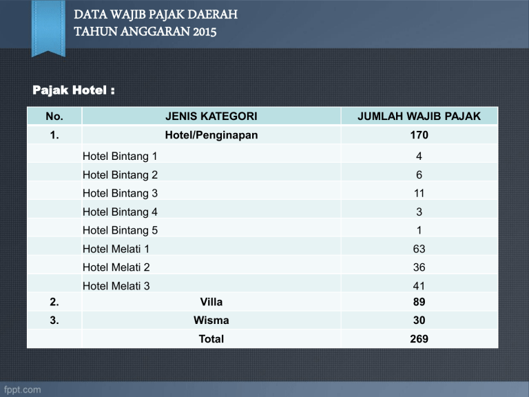DATA WAJIB PAJAK DAERAH TAHUN ANGGARAN 2015 Pajak Hotel : No. JENIS KATEGORI JUMLAH WAJIB PAJAK 1. Hotel/Penginapan 170 Hotel Bintang 1 4 Hotel Bintang 2 6 Hotel Bintang 3 11 Hotel Bintang 4 3 Hotel Bintang 5 1 Hotel Melati 1 63 Hotel Melati 2 36 Hotel Melati 3 2. Villa 41 89 3. Wisma 30 Total 269 DATA WAJIB PAJAK DAERAH TAHUN ANGGARAN 2015 Pajak Restoran : No. JENIS KATEGORI JUMLAH WAJIB PAJAK 1. Cafe 28 2. Rumah Makan 331 3. Catering 5 Total 364 DATA WAJIB PAJAK DAERAH TAHUN ANGGARAN 2015 Pajak Hiburan : No Jenis Kategori Jumlah Wajib Pajak 1 Pertunjukan Film 4 2 Permainan Billyard 5 3 Objek Wisata/Pameran 16 4 Permainan Ketangkasan 62 5 Mandi Uap/SPA 4 6 Usaha Kebugaran Jasmani 8 7 Pertandingan Olahraga 1 Total 100 DATA WAJIB PAJAK DAERAH TAHUN ANGGARAN 2015 Pajak Mineral Bukan Logam dan Batuan : No Non Semen Jenis Kategori Jumlah Wajib Pajak 84 1 Andesit 49 2 Batu Kapur 1 3 Bentonit - 4 Pasir dan Kerikil 7 5 Tanah Liat 2 6 Tanah Urug 6 7 Trass 17 DATA WAJIB PAJAK DAERAH TAHUN ANGGARAN 2015 Pajak Penerangan Jalan PLN : No. JENIS KATEGORI JUMLAH WAJIB PAJAK 2014 1. Area Bogor 726.987 2. Area Gunung Putri 395.500 3. Area Depok 274.821 4. Distribusi Jakarta Raya dan Tangerang 22.276 JUMLAH 1.419.584 Pajak Penerangan Jalan Non PLN : No. JENIS KATEGORI JUMLAH WAJIB PAJAK 1 Niaga Cadangan 54 2 Industri Murni 14 3 Industri Cadangan 226 4 Industri Cadangan + Murni 10 Jumlah 304 DATA WAJIB PAJAK DAERAH TAHUN ANGGARAN 2015 Pajak Parkir : No 1 2 3 4 5 6 Kategori LAPANGAN GOLF HALAMAN HOTEL HALAMAN RESTORAN TEMPAT WISATA TEMPAT PENITIPAN PERUSAHAAN JUMLAH Jumlah Wajib Pajak 6 28 23 14 25 44 140 Pajak Air Tanah: No 1 1 Kategori NON PDAM PDAM JUMLAH Jumlah Wajib Pajak 229 6 235 DATA WAJIB PAJAK DAERAH TAHUN ANGGARAN 2015 Pajak Reklame: No 1 2 3 4 5 6 7 Kategori PAJAK REKLAME Reklame papan/Billboard/Videotron/Megatron Reklame kain Reklame Berjalan Banner Bando Rombong Prismatek JUMLAH Jumlah Objek Jumlah Wajib Pajak Pajak 1.621 5.665 90 1.121 510 408 17 3 128 1 8.626 32 1 971