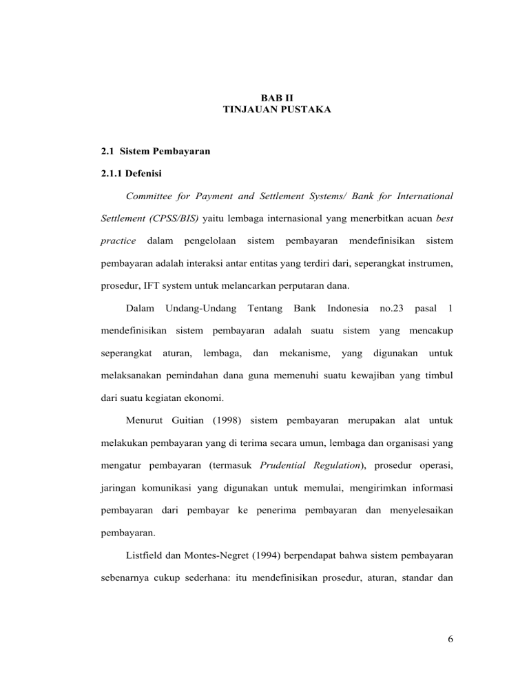 BAB II TINJAUAN PUSTAKA 2.1 Sistem Pembayaran 2.1.1 Defenisi Committee for Payment and Settlement Systems/ Bank for International Settlement (CPSS/BIS) yaitu lembaga internasional yang menerbitkan acuan best practice dalam pengelolaan sistem pembayaran mendefinisikan sistem pembayaran adalah interaksi antar entitas yang terdiri dari, seperangkat instrumen, prosedur, IFT system untuk melancarkan perputaran dana. Dalam Undang-Undang Tentang Bank Indonesia no.23 pasal 1 mendefinisikan sistem pembayaran adalah suatu sistem yang mencakup seperangkat aturan, lembaga, dan mekanisme, yang digunakan untuk melaksanakan pemindahan dana guna memenuhi suatu kewajiban yang timbul dari suatu kegiatan ekonomi. Menurut Guitian (1998) sistem pembayaran merupakan alat untuk melakukan pembayaran yang di terima secara umun, lembaga dan organisasi yang mengatur pembayaran (termasuk Prudential Regulation), prosedur operasi, jaringan komunikasi yang digunakan untuk memulai, mengirimkan informasi pembayaran dari pembayar ke penerima pembayaran dan menyelesaikan pembayaran. Listfield dan Montes-Negret (1994) berpendapat bahwa sistem pembayaran sebenarnya cukup sederhana: itu mendefinisikan prosedur, aturan, standar dan 6 instrumen yang digunakan untuk pertukaran nilai keuangan antara dua pihak melaksanakan sebuah kewajiban. Dari semua defenisi di atas, maka dapat disimpulkan bahwa sistem pembayaran merupakan alat pembayaran, prosedur perbankan yang berhubungan dengan pembayaran dan sistem transfer antar bank yang dipakai dalam proses pembayaran. 2.1.2 Evolusi Sistem Pembayaran Perkembangan sistem pembayaran dimulai dari sistem perekonomian yang paling senderhana. Pada saat itu seseorang bertransaksi dengan saling menukarkan barangnya untuk saling memenuhi kebutuhannnya. Jenis transaksi ini dikenal dengan istilah barter. Kemudian sistem barter ditinggalkan dan digantikan dengan sistem commodity currency yaitu pertukaran yang menggunakan barang tertentu sebagai media penukaran (medium of exchange) atau standar nilai dalam transaksi . Sebagai contoh, garam yang digunakan oleh orang romawi sebagai alat tukar maupun sebagai alat pembayaran upah. Jadi agar proses tukar menukar dapat berlangsung harus ada dua keinginan yang saling bertemu atau “kehendak ganda yang saling selaras” (double coincidence of wants) (Manurung, 2004). Sejalan dengan berjalannya waktu sistem barter dan commodity currency menjadi tidak efisien karena memiliki beberapa kendala yaitu sulit mencari orang yang mau saling bertukar barang, sulit menentukan nilai barang yang akan ditukarkan, dan setiap orang memiliki ide yang berbeda dalam menilai yang akan dipertukarkan. 7 Dengan meningkatnya kebutuhan manusia dan kegiatan ekonomi yang terus berkembang, kedua sistem transaksi tersebut menjadi tidak efisien lagi. Kemudian muncullah uang yang mempunyai fungsi sebagai alat ukur nilai seuatu barang dan juga sebagai alat tukar untuk digunakan dalam perdagangan. Namun sejalan dengan perkembangan ekonomi dan teknologi, penggunaan uang tunai dirasa kurang cukup praktis untuk pembayaran-pembayaran dalam transaksi benilai besar, karena diperlukan kuantitas uang fisik yang banyak dalam melakukan transaksi-transaksi bernilai besar. Untuk mengatasi kendala-kendala tersebut dilakukan inovasi-inovasi baru dalam penciptaan alat pembayaran yang bersifat non-tunai. Seiring dengan berkembangnya teknologi, maka dikembangkan sistem pembayaran yang bersifat elektronis dalam bentuk kartu untuk mempermudah transaksi. Dalam bentuk kartu pertama kali dikenalkan oleh John Biggins pada tahun 1946 dengan sebutan “Charg-It”. Agustus 1966, InterBank Card Association (ICA) yang didirikan oleh sekelompok bank perkreditan, menciptakan sistem kartu kredit nasional (Mastercard). kemudian Seattle's First National Bank menawarkan kartu debit pertama kepada para eksekutif bisnis pada tahun 1978 (Brighthub.com). Dan pada 1990 David Chaum membetuk e-money. 2.2 Alat Pembayaran Dengan Menggunakan Kartu (APMK) APMK adalah sebuah perangkat berbentuk kartu yang memungkinkan pemiliknya (pemegang kartu) untuk melakukan pembayaran elektronik (Wikipedia). Berdasarkan PBI Nomor 11/11/PBI/2009 Alat Pembayaran dengan Menggunakan Kartu, yang selanjutnya disebut APMK adalah alat pembayaran 8 yang berupa kartu kredit, kartu automated teller machine (ATM) dan/atau kartu debit. 2.2.1 Kartu ATM-Debit Kartu ATM-Debit adalah alat pembayaran yang menggunakan kartu yang dananya berasal dari rekening nasabah. Kartu ATM adalah jenis APMK yang dapat digunakan untuk melakukan penarikan dan pemindahan dana, dimana dengan seketika akan menguragi simpanan pemegang kartu pada bank ketika melakukan transaksi. Kartu Debit merupakan APMK yang dapat digunakan untuk melakukan pembayaran atas kewajiban yang timbul dari suatu kegiatan ekonomi, termasuk transaksi pembelanjaan, dimana kewajiban pemegang kartu dipenuhi seketika dengan mengurangi secara langsung simpanan pemegang kartu pada Bank. ATM-Debit merupakan kartu pembayaran gabungan antara kartu ATM dan kartu debit, sehingga memiliki lebih banyak fungsi dibandingkan kartu ATM biasa yaitu selain bertransaksi melaui mesin ATM dapat juga di gunakan untuk berbelanja di tempat perbelanjaan. 2.2.2 Kartu Kredit Kartu Kredit adalah APMK yang dapat digunakan untuk melakukan pembayaran atas kewajiban yang timbul dari suatu kegiatan ekonomi, termasuk transaksi pembelanjaan dan/atau untuk melakukan penarikan tunai, dimana kewajiban pembayaran pemegang kartu dipenuhi terlebih dahulu oleh acquirer atau penerbit, dan pemegang kartu berkewajiban untuk melakukan pembayaran 9 pada waktu yang disepakati baik dengan pelunasan secara sekaligus (charge card) ataupun dengan pembayaran secara angsuran. 2.2.3 Institusi Yang Berperan Penting Dalam Penyelenggaraan APMK Institusi/lembaga yang berperan penting dalam penyelenggaraan APMK, diantaranya adalah sebagai berikut: A. Prinsipal Prinsipal adalah Bank atau Lembaga Selain Bank yang bertanggung jawab atas pengelolaan sistem dan/atau jaringa
