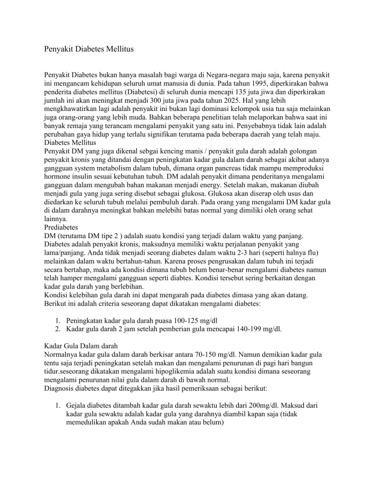 Penyakit Diabetes Mellitus Penyakit Diabetes bukan hanya masalah bagi warga di Negara-negara maju saja, karena penyakit ini mengancam kehidupan seluruh umat manusia di dunia. Pada tahun 1995, diperkirakan bahwa penderita diabetes mellitus (Diabetesi) di seluruh dunia mencapi 135 juta jiwa dan diperkirakan jumlah ini akan meningkat menjadi 300 juta jiwa pada tahun 2025. Hal yang lebih mengkhawatirkan lagi adalah penyakit ini bukan lagi dominasi kelompok usia tua saja melainkan juga orang-orang yang lebih muda. Bahkan beberapa penelitian telah melaporkan bahwa saat ini banyak remaja yang terancam mengalami penyakit yang satu ini. Penyebabnya tidak lain adalah perubahan gaya hidup yang terlalu signifikan terutama pada beberapa daerah yang telah maju. Diabetes Mellitus Penyakit DM yang juga dikenal sebgai kencing manis / penyakit gula darah adalah golongan penyakit kronis yang ditandai dengan peningkatan kadar gula dalam darah sebagai akibat adanya gangguan system metabolism dalam tubuh, dimana organ pancreas tidak mampu memproduksi hormone insulin sesuai kebutuhan tubuh. DM adalah penyakit dimana penderitanya mengalami gangguan dalam mengubah bahan makanan menjadi energy. Setelah makan, makanan diubah menjadi gula yang juga sering disebut sebagai glukosa. Glukosa akan diserap oleh usus dan diedarkan ke seluruh tubuh melalui pembuluh darah. Pada orang yang mengalami DM kadar gula di dalam darahnya meningkat bahkan melebihi batas normal yang dimiliki oleh orang sehat lainnya. Prediabetes DM (terutama DM tipe 2 ) adalah suatu kondisi yang terjadi dalam waktu yang panjang. Diabetes adalah penyakit kronis, maksudnya memiliki waktu perjalanan penyakit yang lama/panjang. Anda tidak menjadi seorang diabetes dalam waktu 2-3 hari (seperti halnya flu) melainkan dalam waktu bertahun-tahun. Karena proses pengrusakan dalam tubuh ini terjadi secara bertahap, maka ada kondisi dimana tubuh belum benar-benar mengalami diabetes namun telah hamper mengalami gangguan seperti diabtes. Kondisi tersebut sering berkaitan dengan kadar gula darah yang berlebihan. Kondisi kelebihan gula darah ini dapat mengarah pada diabetes dimasa yang akan datang. Berikut ini adalah criteria seseorang dapat dikatakan mengalami diabetes: 1. Peningkatan kadar gula darah puasa 100-125 mg/dl 2. Kadar gula darah 2 jam setelah pemberian gula mencapai 140-199 mg/dl. Kadar Gula Dalam darah Normalnya kadar gula dalam darah berkisar antara 70-150 mg/dl. Namun demikian kadar gula tentu saja terjadi peningkatan setelah makan dan mengalami penurunan di pagi hari bangun tidur.seseorang dikatakan mengalami hipoglikemia adalah suatu kondisi dimana seseorang mengalami penurunan nilai gula dalam darah di bawah normal. Diagnosis diabetes dapat ditegakkan jika hasil pemeriksaan sebagai berikut: 1. Gejala diabetes ditambah kadar gula darah sewaktu lebih dari 200mg/dl. Maksud dari kadar gula sewaktu adalah kadar gula yang darahnya diambil kapan saja (tidak memedulikan apakah Anda sudah makan atau belum) 2. Kadar gula darah puasa lebih dari 126mg/dl. Puasa sebelumnya yang harus dilakukan adalah terakhir makan 8 jam sebelum pengambilan darah. Kadar gula darah 2 jam post prandial sebanyak lebih dari 200mg/dl. Maksud dari gula darah 2 jam post prandial adalah dua jam setelah menerima glukosa dalam jumlah tertentu dari glucose tolerance test. Cara mencegah Diabetes Fung dan koleganya melakukan penelitian pada wanita yang belum mengalami diabetes. Dalam penelitian itu mereka menemukan bahwa semakin tinggi asupan magnesium seseorang maka kadar insulin puasanya menjadi semakin rendah. Ya, sensitivitas insulin yang baik terdapat pada orang yang memiliki asupan magnesium yang tinggi pula. Menjaga insulin tetap sensitive penting karena pada sebagian besar kasus diabetes ditemukan hormon insulin yang tidak sensitive sehingga gula sukar masuk ke dalam tubuh. Hal ini didukung oleh peneliti lain yaitu Song dkk. Yang menemukan bahwa asupan magnesium yang tinggi pada wanita yang mengalami obesitas mampu menurunkan risiko terjadi diabetes mellitus tipe 2. Bagaimana memperoleh magnesium? Untuk memperoleh manfaat dari magnesium kita dapat mengonsumsi makanan yang kaya akan buah-buahan, sayuran berdaun hijau, biji-bijian utuh dan kacangkacangan yang merupakan sumber utama magnesium. Alasan Mengapa Anda Harus Berolahraga Apakah Anda aktif berolahraga? Beberpa penelitian jangka panjang secara konsisten menemukan bahwa semakin aktif kita berolahraga maka akan semakin mungkin kita terbebas dari diabetes mellitus tipe 2. Olahraga membuat tubuh kita beradaptasi dengan mudah terhadap masalah yang berdampak pada penyakit kronis. Dengan berolahraga secara teratur artinya kita membantu pancreas kita (organ yang berfungsi menghasilkan hormon insulin) untuk bekerja lebih baik. Latihan fisik atau olahraga juga meningkatkan pengambilan gula darah oleh otot. Dengan demikian olahraga secara langsung atau tidak langsung berperan dalam mencegah penyakit diabetes.