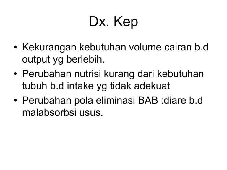 Dx. Kep • Kekurangan kebutuhan volume cairan b.d output yg berlebih. • Perubahan nutrisi kurang dari kebutuhan tubuh b.d intake yg tidak adekuat • Perubahan pola eliminasi BAB :diare b.d malabsorbsi usus. Dx.1. Kekurangan kebutuhan volume cairan b.d output yg berlebih. • • • • • • • • • Tujuan : Setelah dilakukan askep 3x24jam masalah kebutuhan volume cairan teratasi. KH: TTV dalam batas normal (TD: 90/55mmHg, suhu: 36-37℃, nadi: 80130x/mnt, Rr: 20-30x/mnt). Nadi perifer dapat teraba. Pengisian kapiler < 3detik. Intake dan output seimbang. Intake: cairan= 1000+50x14= 1070kg/hari. Output : 500cc/hari. Pengeluaran urine adekuat (0,5x1cc/KgBB/hari) = 0,5 x12kg = 6cc/hr BB dalam batas normal (umr x 2 +8) = 3x2+8 = 14kg. Tidak ada tanda2 dehidrasi ( turgor kulit elastis, membran mukosa lembab). INTERVENSI • • • • • • • • Kaji tanda2 dehidrasi (turgor kulit, membrann mukosa,pengisian kapiler, nadi perifer). Kaji TTV dan tingkat kesadaran klien. Kaji factor penyebab dan cara yg telah dilakukan untuk menngatasinya. Catat intake dan output Pantau jumlah dan warna urin. Pertahankan untuk pemberian cairan ± 2000cc/hr. Timbang BB setiap hari jika memungkinkan. Kolaborasi dgn dokter untuk pemberian cairan parenteral & obat sesuai indikasi. DX. 2 Perubahan nutrisi kurang dari kebutuhan tubuh b.d intake yg tidak adekuat Tujuan : Setelah dilakukan askep 3x24jam diharapkan kebutuhan nutrisi klien terpenuhi. Kh: • TTV dlm batas normal. • BB dalam batas normal • (umr x 2 +8) = 3x2+8 = 14kg. • Nafsu makan bertambah • Makan habis 1 porsi • Data laboratorium dlm batas normal • Kebutuhan nutrisi terpenuhi • Tidak ada tanda2 malnutrisi • Muntah tidak ada INTERVENSI – Kaji TTV klien (TD,suhu,Nadi,RR). – Kaji status nutrisi (timbang BB, lingkar lengan atas), auskultasi bising usus, palpasi abdomen. – Catat adanya nyeri abdomen, perut kembung, mual, muntah. – Kaji pola kebiasaan makan, makanan kesukaan atau yg tdk disukai – Anjurkan klien makan dalam porsi kecil tapi sering. – Berikan motivasi klien untuk menghabiskan prosi makan. – Beri perawatan mulut sebelum dan setelah makan. – Berikan penjelasan kepada anak tentang pentingnya makanan bagi proses penyembuhan. – Kolaborasi dgn ahli gizi untuk pemberian diet, & dx. 3 Perubahan pola eliminasi BAB :diare b.d malabsorbsi usus. • Tujuan : Setelah dilakukan askep 3x24jam diharapkan pola eliminasi BAB :diare dapat kembali normal. • Kh : • Penurunan frekuensi defekasi (1-2x/hari). • Konsistensi kembali normal (semi padat). • Mendapatkan kembali pola usus yg normal). INTERVENSI • Observasi frekuensi defekasi, karakter, jumlah dan faktor pencetus diare. • Aukultasi bising usus • Kaji keluhan nyeri abdomen • Anjurkan klien makan makanan yg tidak mengiritasi mukosa lambung. • Pertahankan untuk pemberian cairan ± 2000cc/hr. • Kolaborasi dg dokter untuk pemberian obat antidiare • Berikan obat sesuai indikasi (antiemetik,antasida,inhibator,histamin). • Cek hasil lab.