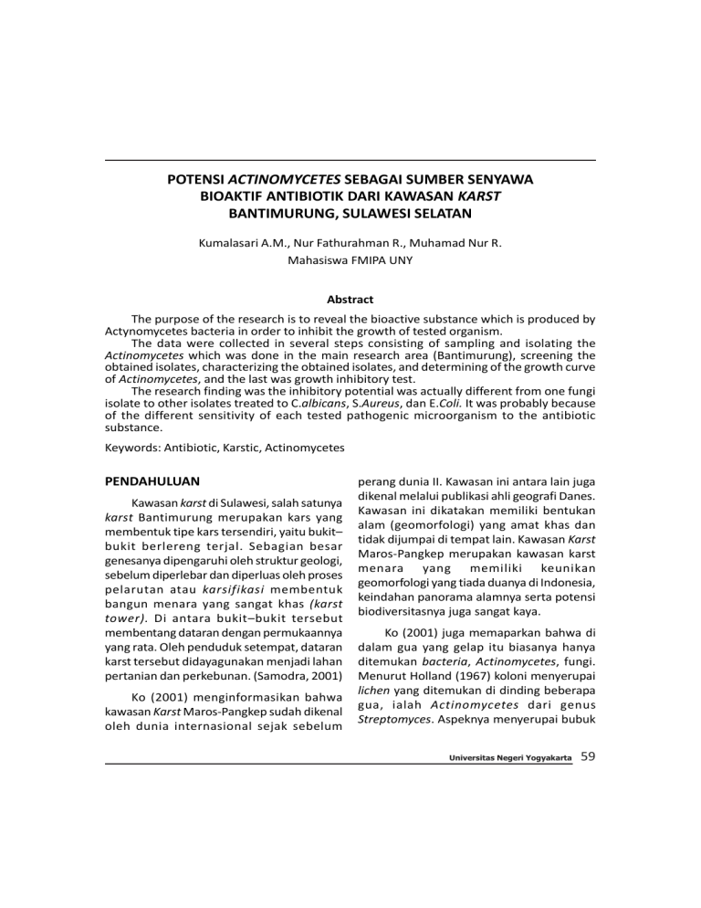 POTENSI ACTINOMYCETES SEBAGAI SUMBER SENYAWA BIOAKTIF ANTIBIOTIK DARI KAWASAN KARST BANTIMURUNG, SULAWESI SELATAN Kumalasari A.M., Nur Fathurahman R., Muhamad Nur R. Mahasiswa FMIPA UNY Abstract The purpose of the research is to reveal the bioactive substance which is produced by Actynomycetes bacteria in order to inhibit the growth of tested organism. The data were collected in several steps consisting of sampling and isolating the Actinomycetes which was done in the main research area (Bantimurung), screening the obtained isolates, characterizing the obtained isolates, and determining of the growth curve of Actinomycetes, and the last was growth inhibitory test. The research finding was the inhibitory potential was actually different from one fungi isolate to other isolates treated to C.albicans, S.Aureus, dan E.Coli. It was probably because of the different sensitivity of each tested pathogenic microorganism to the antibiotic substance. Keywords: Antibiotic, Karstic, Actinomycetes PENDAHULUAN Kawasan karst di Sulawesi, salah satunya karst Bantimurung merupakan kars yang membentuk tipe kars tersendiri, yaitu bukit– bukit berlereng terjal. Sebagian besar genesanya dipengaruhi oleh struktur geologi, sebelum diperlebar dan diperluas oleh proses pelarutan atau karsifikasi membentuk bangun menara yang sangat khas (karst tower). Di antara bukit–bukit tersebut membentang dataran dengan permukaannya yang rata. Oleh penduduk setempat, dataran karst tersebut didayagunakan menjadi lahan pertanian dan perkebunan. (Samodra, 2001) Ko (2001) menginformasikan bahwa kawasan Karst Maros-Pangkep sudah dikenal oleh dunia internasional sejak sebelum perang dunia II. Kawasan ini antara lain juga dikenal melalui publikasi ahli geografi Danes. Kawasan ini dikatakan memiliki bentukan alam (geomorfologi) yang amat khas dan tidak dijumpai di tempat lain. Kawasan Karst Maros-Pangkep merupakan kawasan karst menara yang memiliki keunikan geomorfologi yang tiada duanya di Indonesia, keindahan panorama alamnya serta potensi biodiversitasnya juga sangat kaya. Ko (2001) juga memaparkan bahwa di dalam gua yang gelap itu biasanya hanya ditemukan bacteria, Actinomycetes, fungi. Menurut Holland (1967) koloni menyerupai lichen yang ditemukan di dinding beberapa gua, ialah Actinomycetes dari genus Streptomyces. Aspeknya menyerupai bubuk Universitas Negeri Yogyakarta 59 PELIT A, Volume VII, Nomor 1, A pril 2012 PELITA April dan menimbulkan bau khas tanah. Sumber mikroba penghasil antibiotik antara lain, berasal dari tanah, air laut, lumpur, kompos, isi rumen, limbah domestik, bahan makanan busuk dan lain-lain. Tanah merupakan habitat alami bagi mikroba dan produk-produk antimikrobanya (Dancer 2004). Namun kebanyakan mikroba penghasil antibiotik diperoleh dari mikroba tanah terutama Streptomyces dan jamur. Tanah juga merupakan tempat interaksi biologis yang paling dinamis dan mempunyai lima komponen utama yaitu mineral, air, udara, zat organik dan organisme hidup dalam tanah antara lain bakteri, Actinomycetes, fungi, algae, dan protozoa (Setiadi, 1989). Penyakit infeksi merupakan salah satu masalah kesehatan yang paling utama di negara-negara berkembang termasuk Indonesia. Berdasarkan Survey Kesehatan Rumah Tangga tahun 2007, penyebab utama kematian antara lain: 28,1 % disebabkan oleh penyakit infeksi dan parasit, 18,9 % disebabkan oleh penyakit vaskuler, dan 15,7 % disebabkan oleh penyakit pernafasan (Depkes, 1997). Kenyataan ini menunjukkan bahwa penyakit yang disebabkan karena infeksi di Indonesia masih tinggi. Untuk mengatasi masalah ini obat anti infeksi yang berpotensi dan dapat diterima oleh kalangan sosial rendah dan menengah harus segera ditemukan. Hal inilah yang mendorong dan mendasari pencarian sumber obat-obatan alami yang murah dan memiliki potensi aktivitas antimikroba (Kumala & Siswanto, 2007). 60 Universitas Negeri Yogyakarta Antibiotik merupakan substansi yang dihasilkan oleh mikroba. Dalam konsentrasi rendah, mikroba mampu menghambat pertumbuhan atau membunuh mikroba lain. Peranan mikroba belakangan ini sangatlah menarik untuk diteliti karena mikroba dapat menghasilkan berbagai macam senyawa bioaktif metabolit sekunder yang bermanfaat, salah satunya adalah antimikroba. Antimikroba ini selanjutnya sering dikenal sebagai antibiotik (Lestari, 2001). Setiap antibiotik mempunyai aktivitas penghambatan hanya terhadap grup mikroba spesifik yang disebut spektrum penghambat. Sampai saat ini telah ditemukan lebih dari 3000 antibiotik, namun hanya sedikit saja yang diproduksi secara komersial (Gale 1960). Beberapa antibiotik telah dapat diproduksi dengan kombinasi sintesis mikroba dan modifikasi kimia, antara lain golongan penisilin, sefalosporin, dihidrostreptomisin, klindamisin, tetrasiklin dan rifamisin. Bahkan ada yang telah dibuat secara kimia penuh misalnya kloramfenikol dan pirolnitrin (Suwandi, 1989). Mikroba penghasil antibiotik meliputi golongan bakteri, Actinomycetes, fungi, dan beberapa mikroba lainnya. Kira-kira 70% antibiotik dihasilkan oleh Actinomycetes, 20% fungi, dan 10% oleh bakteri. Genus Streptomyces merupakan kelompok penghasil antibiotik yang paling besar jumlahnya. Dewasa ini, fungi patogen telah menyebabkan banyak masalah kesehatan dalam kehidupan manusia. Gangguan tersebut diakibatkan karena fungi patogen tersebut menghasilkan toksin yang berbahaya (Oskay, 2009). Menurut Jewetz Potensi Actinomycetes sebagai Sumber Senyawa Bioaktif Antibiotik dari Kawasan Karst Bantimurung, Sulawesi Selatan (1993) Upaya mengatasi gangguan mikroorganisme patogen dapat dilakukan dengan menggunakan senyawa bioaktif khususnya antifungi dan antibakteri, termasuk antibiotik. Antibiotik merupakan substansi kimia yang didapatkan dari berbagai jenis mikroorganisme, di mana pada konsentrasi rendah mampu menghambat pertumbuhan mikroorganisme Menurut informasi dari Madigan (1997) Actinomycetes merupakan kelompok bakteri berfilamen, gram positif dengan GC tinggi berkisar 63-78%. Menurut Suwandi (1989) sekitar 70% dari s