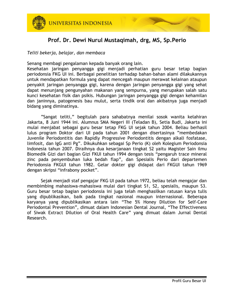 Prof. Dr. Dewi Nurul Mustaqimah, drg, MS, Sp.Perio Teliti bekerja, belajar, dan membaca Senang membagi pengalaman kepada banyak orang lain. Kesehatan jaringan penyangga gigi menjadi perhatian guru besar tetap bagian periodonsia FKG UI ini. Berbagai penelitian terhadap bahan-bahan alami dilakukannya untuk mendapatkan formula yang dapat mencegah maupun merawat kelainan ataupun penyakit jaringan penyangga gigi, karena dengan jaringan penyangga gigi yang sehat dapat menunjang pengunyahan makanan yang sempurna, yang merupakan salah satu kunci kesehatan fisik dan psikis. Hubungan jaringan penyangga gigi dengan kehamilan dan janinnya, patogenesis bau mulut, serta tindik oral dan akibatnya juga menjadi bidang yang diminatinya. ”Sangat teliti,” begitulah para sahabatnya menilai sosok wanita kelahiran Jakarta, 8 Juni 1944 ini. Alumnus SMA Negeri III (Teladan B), Setia Budi, Jakarta ini mulai menjabat sebagai guru besar tetap FKG UI sejak tahun 2004. Beliau berhasil lulus program Doktor dari UI pada tahun 2001 dengan disertasinya ”membedakan Juvenile Periodontitis dan Rapidly Progressive Periodontitis dengan alkali fosfatase, limfosit, dan IgG anti Pg”. Dikukuhkan sebagai Sp Perio (K) oleh Kolegium Periodonsia Indonesia tahun 2007. Diraihnya dua kesarjanaan tingkat S2 yaitu Magister Sain ilmu Biomedik Gizi dari bagian Gizi FKUI tahun 1994 dengan tesis “pengaruh trace mineral zinc pada penyembuhan luka bedah flap”, dan Spesialis Perio dari departemen Periodonsia FKGUI tahun 1982. Gelar dokter gigi didapat dari FKGUI tahun 1969 dengan skripsi “infrabony pocket”. Sejak menjadi staf pengajar FKG UI pada tahun 1972, beliau telah mengajar dan membimbing mahasiswa-mahasiswa mulai dari tingkat S1, S2, spesialis, maupun S3. Guru besar tetap bagian periodonsia ini juga telah menghasilkan ratusan karya tulis yang dipublikasikan, baik pada tingkat nasional maupun internasional. Beberapa karyanya yang dipublikasikan antara lain “The 5% Honey Dilution for Self-Care Periodontal Prevention”, dimuat dalam Indonesian Dental Journal, “The Effectiveness of Siwak Extract Dilution of Oral Health Care” yang dimuat dalam Jurnal Dental Research. Profil Guru Besar UI