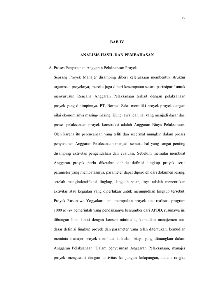 36 BAB IV ANALISIS HASIL DAN PEMBAHASAN A. Proses Penyusunan Anggaran Pelaksanaan Proyek Seorang Proyek Manajer disamping diberi keleluasaan membentuk struktur organisasi proyeknya, mereka juga diberi kesempatan secara partisipatif untuk menyususun Rencana Anggaran Pelaksanaan terkait dengan pelaksanaan proyek yang dipimpinnya. PT. Borneo Sakti memiliki proyek-proyek dengan nilai ekonomisnya masing-masing. Kunci awal dan hal yang menjadi dasar dari proses pelaksanaan proyek konstruksi adalah Anggaran Biaya Pelaksanaan. Oleh karena itu perencanaan yang teliti dan secermat mungkin dalam proses penyusunan Anggaran Pelaksanaan menjadi sesuatu hal yang sangat penting disamping aktivitas pengendalian dan evaluasi. Sebelum memulai membuat Anggaran proyek perlu diketahui dahulu definisi lingkup proyek serta parameter yang membatasinya, parameter dapat diperoleh dari dokumen lelang, setelah mengindentifikasi lingkup, langkah selanjutnya adalah menentukan aktivitas atau kegiatan yang diperlukan untuk memujudkan lingkup tersebut, Proyek Rusunawa Yogyakarta ini, merupakan proyek atas realisasi program 1000 tower pemerintah yang pendanaanya bersumber dari APBD, rusunawa ini dibangun lima lantai dengan konsep minimalis, kemudian manajemen atas dasar definisi lingkup proyek dan parameter yang telah ditentukan, kemudian meminta manajer proyek membuat kalkulasi biaya yang dituangkan dalam Anggaran Pelaksanaan. Dalam penyusunan Anggaran Pelaksanaan, manajer proyek mengawali dengan aktivitas kunjungan kelapangan, dalam rangka 37 mensesuaikan metodologi pelaksanaan yang ditetapkan serta dalam rangka mendapatkan situasi dan harga rill dilapangan, dalam prosesnya semua perubahan-perubahan terkait dengan keadaan rill dilapangan diperhitungkan untuk mendukung pembuatan Anggaran Pelaksanaan yang tepat sesuai dengan keadaan aktual dilapangan. Aktivitas kunjungan ke lapangan bermanfaat juga bagi Manajer Proyek dalam rangka mencari dan menghitung kemungkinan ada pekerjaan tambah atau pekerjaan kurang terkait dengan pelaksanaan proyek. Anggaran Pelaksanaan Proyek Rusunawa Yogyakarta : Tabel 4. 1 Anggaran Pelaksanaan Proyek Rusunawa Yogyakarta PT. Borneo Sakti 38 Dalam Anggaran Pelaksanaan proyek RUSUNAWA Yogyakarta, biaya diproyeksi untuk kebutuhan selama enam bulan kedepan sesuai dengan jangka waktu pelaksanaan, sebagai sumber pemasukan adalah nilai proyek itu sendiri yaitu sebesar Rp. 9.584.638.870,- nilai pemasukan bersih setelah dikurangkan unsur-unsur biaya pajak yang terkandung didalamnya. Sedangkan struktur biaya dalam Anggaran Pelaksanaan terdiri dari lima bagian yaitu : pekerjaan persiapan, biaya konstruksi, biaya gaji, biaya lapangan, dan akomodasi. Dalam Anggaran Pelaksanaan profit proyek yang ditargetkan adalah sebesar Rp. 1.481. 054.428 atau sebesar 14.99 % terhadap laba kotor. B. Proses Pelaksanaan Anggaran Proyek Pada proses pelaksanaan proyek Rusunawa Jogyakarta, dominan aktivitas yang dilakukan adalah aktivitas pengendalian atas tahapan-tahapan yang telah ditentukan dan item-item pekerjaan yang ditetapkan. Adapun tahapan-tahapan yang memerlukan pengendalian adalah : 1. Kegiatan persiapan pengendalian 2. Pengendalian desain – engineering terinci 3. Pengendalian pengadaan 4. Pengendalian konstruksi dan subkontrak Dalam kegiatan persiapan Proyek Pembangunan Rusunawa Jogyakarta ini, PT. Borneo Sakti mengalokasikan anggaran Rp. 81.189.928. Pekerjaan yang meliputi pekerjaan persiapan terdiri dari : Pekerjaan pengukuran dan pasangan bowplank, Pekerjaan pembersihan lokasi, Pekerjaan pembuatan direksi kit, Papan nama proyek, Pagar pengaman proyek, Air kerja, Listrik kerja, 39 Pekerjaan jalan masuk ke site, dan aktivitas pengetesan ke labotarium. Pada aktivitas pelaksanaan anggaran persiapan, dana teralokasi cukup besar pada Pekerjaan Jalan masuk ke site. Setiap item pekerjaan sedemikian rupa dikendalikan agar biaya yang keluar tidak melebihi anggaran yang telah ditetapkan. Pelaksana dalam kegiatannya selalu berpegang pada acuan gambar dan acuan metode yang telah ditentukan, akan tetapi terkadang karena situasi dan kondisi dilapangan, acuan gambar dan metode yang telah ditetapkan tidak dapat di laksanakan, pada situasi ini, pelaksana perlu mendesain ulang gambar dan metode yang ada, ke pada pemilik pekerjaan. Komunikasi dengan pemilik pekerjaan terkait dengan perubahan-perubahan yang terjadi dilapangan penting dilakukan pelaksana agar perubahan-perubahan yang terjadi dilapangan dapat segera diputuskan dan dilaksanakan pekerjaannya. Perubahan dalam desain, memungkinkan terjadi pekerjaan kurang atau pekerjaan tambah. Pekerjaan kurang adalah pekerjaan yang dapat mengakibatkan pengurangan nilai kontrak. Pekerjaan tambah adalah pekerjaan yang dapat mengakibatkan penambahan nilai kontrak. Setiap perubahan nilai kontrak ditetapkan dengan addendum. Pada proses pengadaan, aggaran dikeluarkan sesuai dengan kebutuhan waktu pengadaanya. Disamping aktivitas pengadaaan, pengawasan dan pengendalian atas pekerjaan subkontraktor realisasi anggarannya didasarkan pada bobot prestasi pekerjaan yang telah diselesaikan. Semua aktivitas pelaksanaan dan pengendalian setiap tahapan di informasikan ke bagian Cost control. Cost control dalam pelaksanaan Proyek Pembangunan Rusunawa Yogyakarta mempunyai peran penting dalam menghasilkan laporan progress pembangunan 40 yang telah dilaksanakan dan realisasi biaya yang telah dikeluarkan. Proses pelaksanaan proyek Pembangunan Rusunawa Yogyakarta ini berjalan baik apabila progress pembangunan prestasinya sesuai dengan realisasi biaya yang telah dikeluarkan dan sebaliknya berjalan tidak baik apabila realisasi biaya yang telah dikeluarkan lebih besar dibanding prestasi progress kerja yang di capai.. C. Ukuran Kinerja Manajemen Proyek dan Solusinya Dalam mengukur Kinerja Manajemen Proyek banyak aspek yang harus diperhatikan selain aspek laporan keuangan, aspek-aspek lain yang perlu diperhatikan adalah prestasi proyek. Berikut hasil analisa kinerja Manajemen Proyek PT. Borneo Sakti atas pelaksan