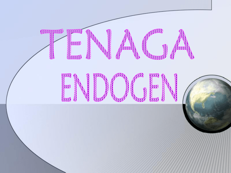 Pengertian dan sifat tenaga endogen : Tenaga yang berasal dari dalam bumi yang menyebabkan perubahan pada kulit bumi. Sifat dari tenaga endogen ialah membuat bumi menjadi tidak rata. Akibat dan pembagian dari tenaga endogen : Akibat dari tenaga endogen : 1. sebagian dari luas permukaan bumi berubah menjadi gunung. bukit/pegunungan 2. permukaan bumi yang turun menjadi lembah/jurang Tenaga endogen dibagi menjadi 3 : 1. Tektonisme 2. Vulkanisme 3. Seisme/gempa Arti dari tektonisme : Tektonisme adalah pergeseran dan perubahan letak kerak bumi dalam skala besar,meliputi: lipatan, patahan, dan tektonisme lempeng. • Tektonisme lempeng : menerangkan peristiwa perubahan bumi ke arah mendatar/vertikal. Gerak relatif lempeng-lepeng bumi adalah divergen ( saling menjauh ), konvergen ( saling medekat ) dan geseran. • Tumpukan antara lempeng samudra dan lempeng benua akan menyebabkan lempeng samudra menggeser ke bawah dan terbentuk palung laut ( island arcs ) • Pada tahun 1968 ditetapkan bahwa litosfer memiliki 6 lempeng utama : • Lempeng Afrika • Lempeng Amerika • Lempeng Pasifik • Lempeng Eurasia • Lempeng India( lempeng Australia ) • Lempeng Antartika Arti dari vulkanisme Vulkanisme ialah Peristiwa naiknya magma dari bagian dalam bumi sehingga sebagian magma muncul ke permukaan bumi, dan sebagian lagi menyusup ke dalam lapisan kerak bumi. Magma naik karena energi dorong yang berasal dari gas-gas yang terkandung dalam magma. Semakin dalam asal magma letusan gunung makin kuat. Erupsi (ekstrusi magma) adalah peristiwa naiknya magma dari dalam bumi. Intrusi magama adalah naiknya magma di dalam lapisan litosfer,tetapi tidak mencapai permukaan bumi. Manfaat vulkanisme : • Sebagai sumber mineral • Menyuburkan daerah pertanian • Obyek wisata • Gempa bumi adalah getaran kerak bumi yang disebabkan oleh kekuatan-kekuatan dari dalam bumi • Ilmu yang mempelajari tentang ilmu gempa bumi dinamakan seismologi • Hiposentrum yaitu sumber gempa didalam lapisan bumi • Episentrum yaitu garis dipermukaan bumi yang tepat tegak lurus di atas hiposentrum • Homoseista yaitu garis yang menghubungkan tempat-tempat dipermukaan bumi yang dilalui gempa pada waktu yang sama • Isoseista yaitu garis dipermukaan bumi yang menghubungkan tempat-tempat dengan intensitas yang sama • Makroseisma yaitu daerah disekitar episentrum yang mengalami kerusakan terhebat akibat gempa • Pleistoseista yaitu garis pada peta gempa yang mengelilingi makroseisma 1. Bedasarkan penyebab: - Gempa tektonik yaitu gempa yang disebabkan oleh pergeseran - Gempa vulkanik yaitu gempa yang diakibatkan oleh aktivitas vulkanisme - Gempa guguran (gempa runtuhan) yaitu disebabkan oleh runtuhannya bagian gua - Gempa tumbukan yaitu gempa yang disebabkan oleh meteor 2. Berdasarkan bentuk episentrum: - Gempa sentral yaitu gempa yang episentrumnya titik - Gempa linier yaitu gempa yang episentrumnya garis 3. Berdasarkan kedalaman hiposentrum: - Gempa dalam yaitu lebih dari 300 km - Gempa menengah yaitu antara 100-300 km - Gempa dangkal yaitu kurang dari 100 km 4. Berdasarkan jarak episentrum: - Gempa lokal yaitu episentrumnya kurang dari 10000 km - Gempa jauh yaitu episentrumnya sekitar 10000 km - Gempa sangat jauh yaitu episentrumnya lebih dari 10000 km • Selain klasifikasi gempa dikenal juga gempa laut, yaitu gempa yang episentrumnya terdapat di bawah permukaan laut • Gempa tersebut menjadikan terjadinya tsunami • Seismograf adalah alat pencatat gempa • Seismogram adalah rekaman atau hasil catatan seismograf Disusun oleh : ☺ Dwi Nurul Ariska ☺ Meutia Familya ☺ Fitri Lia Susanti ☺ M.Septanto Purbadi
