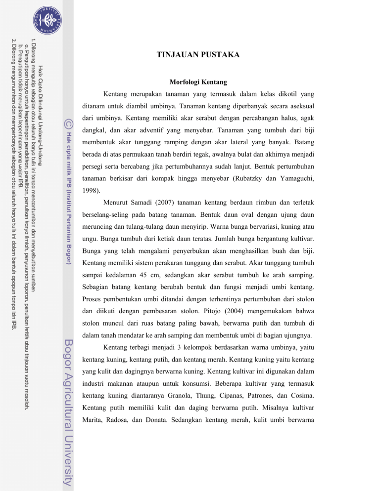 TINJAUAN PUSTAKA Morfologi Kentang Kentang merupakan tanaman yang termasuk dalam kelas dikotil yang ditanam untuk diambil umbinya. Tanaman kentang diperbanyak secara aseksual dari umbinya. Kentang memiliki akar serabut dengan percabangan halus, agak dangkal, dan akar adventif yang menyebar. Tanaman yang tumbuh dari biji membentuk akar tunggang ramping dengan akar lateral yang banyak. Batang berada di atas permukaan tanah berdiri tegak, awalnya bulat dan akhirnya menjadi persegi serta bercabang jika pertumbuhannya sudah lanjut. Bentuk pertumbuhan tanaman berkisar dari kompak hingga menyebar (Rubatzky dan Yamaguchi, 1998). Menurut Samadi (2007) tanaman kentang berdaun rimbun dan terletak berselang-seling pada batang tanaman. Bentuk daun oval dengan ujung daun meruncing dan tulang-tulang daun menyirip. Warna bunga bervariasi, kuning atau ungu. Bunga tumbuh dari ketiak daun teratas. Jumlah bunga bergantung kultivar. Bunga yang telah mengalami penyerbukan akan menghasilkan buah dan biji. Kentang memiliki sistem perakaran tunggang dan serabut. Akar tunggang tumbuh sampai kedalaman 45 cm, sedangkan akar serabut tumbuh ke arah samping. Sebagian batang kentang berubah bentuk dan fungsi menjadi umbi kentang. Proses pembentukan umbi ditandai dengan terhentinya pertumbuhan dari stolon dan diikuti dengan pembesaran stolon. Pitojo (2004) mengemukakan bahwa stolon muncul dari ruas batang paling bawah, berwarna putih dan tumbuh di dalam tanah mendatar ke arah samping dan membentuk umbi di bagian ujungnya. Kentang terbagi menjadi 3 kelompok berdasarkan warna umbinya, yaitu kentang kuning, kentang putih, dan kentang merah. Kentang kuning yaitu kentang yang kulit dan dagingnya berwarna kuning. Kentang kultivar ini digunakan dalam industri makanan ataupun untuk konsumsi. Beberapa kultivar yang termasuk kentang kuning diantaranya Granola, Thung, Cipanas, Patrones, dan Cosima. Kentang putih memiliki kulit dan daging berwarna putih. Misalnya kultivar Marita, Radosa, dan Donata. Sedangkan kentang merah, kulit umbi berwarna 5 merah dan daging umbi berwarna kuning kemerahan. Misalnya kultivar Desiree, Red Pontiac, dan Arka (Novary, 1999). Syarat Tumbuh Kentang Menurut Martodireso dan Suryanto (2001) tanah yang cocok untuk tumbuh dan berkembangnya tanaman kentang adalah tanah yang berdrainase baik, tekstur sedang, gembur, dan banyak mengandung bahan organik. Ketersediaan air tidak boleh kurang dari 50% kapasitas lapang. Kedalaman air tanah 15 cm dan derajat keasaman (pH) tanah yang dikehendaki adalah 5 - 6.5. Tanah yang terlalu salin (banyak garam terlarut) dan tanah sodik (banyak kandungan Na) mengganggu pertumbuhan umbi. Tanah salin membuat akar sulit mengambil air tanah. Sedangkan tanah banyak kandungan Na menghalangi suplai air untuk tanaman. Penanaman disesuaikan dengan jenis tanaman sebelumnya. Penanaman kentang secara terus-menerus pada lahan yang sama perlu dihindari sebab dapat menularkan sumber penyakit tular tanah seperti nematoda sista kentang. Rotasi tanaman penting dilakukan untuk mengendalikan hama dan penyakit (Ashari, 1995). Menurut Astawan (2004) untuk daerah tropis, lingkungan yang cocok untuk budidaya tanaman kentang adalah dataran tinggi dengan ketinggian 1 000-1 300 meter di atas permukaan laut, dengan curah hujan 1 500 mm per tahun. Lingkungan yang baik untuk pertumbuhan tanaman kentang adalah pada suhu 18-21oC, serta kelembaban udara 80-90 %. Data curah hujan Pangalengan tahun 2007-2009 dapat dilihat pada Lampiran 2. Sistem Sertifikasi Benih Kentang Sertifikasi benih adalah pemberian sertifikat terhadap benih tanaman setelah melalui proses pemeriksaan, pengujian, dan telah memenuhi standar mutu benih untuk diedarkan. Menurut UU No. 12 tentang Sistem Budidaya Tanaman dan UU No. 44 tentang Perbenihan Tanaman, benih yang akan diedarkan kepada pihak lain harus melalui sertifikasi dan memenuhi standar mutu yang telah ditetapkan dan diatur lebih lanjut oleh Peraturan Menteri Pertanian (Haluoleo, 2009). 6 Menurut Wattimena (2000) perbanyakan stek mikro dan stek mini dilakukan oleh Balitsa (Balai Penelitian Tanaman Sayuran) Lembang, umbi G0, G1, dan G2 oleh BBI (Balai Benih Induk) Pangalengan, Umbi G3 oleh BBU (Balai Benih Umum), dan G4 oleh penangkar benih PD. Mamin (Perusahaan Daerah Makanan dan Minuman) di Pangalengan bertindak sebagai BBU. Produksi G0 dan G1 dilakukan di dalam rumah ketat serangga sedangkan G2, G3, dan G4 dilakukan di kebun produksi. Evaluasi untuk sertifikasi hanya dilakukan untuk umbi G2, G3, dan G4. Sistem penangkar lain juga dapat memproduksi bibit apabila dapat menghasilkan bibit yang bersertifikat dan telah terakreditasi kerena memenuhi persyaratan. Pemeriksaan dilakukan terhadap benih yang akan diperbanyak di lahan dengan dua kali pemeriksaan tanaman (umur 30-40 HST dan 40-50 HST) dan pemeriksaan umbi setelah disortir. Pemeriksaan di lapang terutama mengenai kemurnian kultivar, penyakit virus kentang, layu bakteri (Ralstonia solanacearum), dan hawar daun (Phytopthora infestans). Pemeriksaan umbi dilakukan terhadap penyakit busuk coklat, busuk lunak, busuk kering, hawar daun, nematoda bintil akar, kemurnian kultivar, dan kerusakan mekanis. Bibit kentang yang telah lulus pemeriksaan akan diberikan sertifikat dan label oleh BPSBTPH. Benih kentang berlabel putih adalah benih kentang G2 yang merupakan benih dasar yang telah lulus pemeriksaan. Benih kentang berlabel ungu adalah benih kentang G3 yang merupakan benih pokok yang telah lulus pemeriksaan. Sedangkan benih kentang berlabel biru adalah benih kentang G4 yang merupakan benih sebar yang telah lulus pemeriksaan (Wattimena, 2000). Menurut Wirawan dan Wahyuni (2002) bibit bermutu dan bersertifikat mempunyai ciri-ciri bibit bersih dan terbebas dari hama dan penyakit serta kotoran seperti biji-biji dan kerikil, benih murni tidak tercampur dengan varietas lain, warna benih tidak kusam, bibit sehat, tidak keriput, ukuran normal dan seragam, kulit tidak terkelupas, dan memenuhi standar toleransi sertifikasi benih. Menurut Samadi