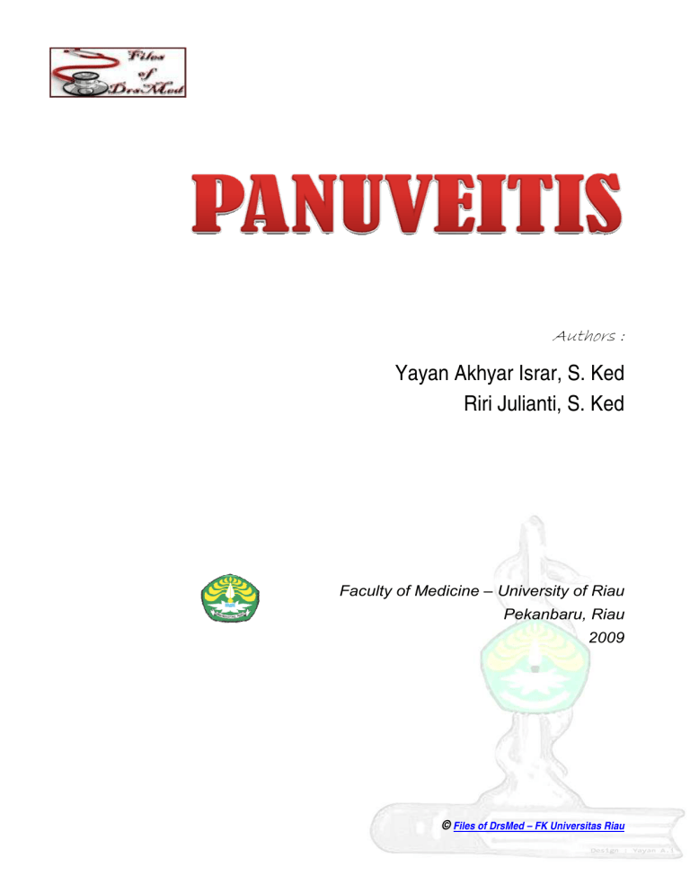 Authors : Yayan Akhyar Israr, S. Ked Riri Julianti, S. Ked Faculty of Medicine – University of Riau Pekanbaru, Riau 2009 © Files of DrsMed – FK Universitas Riau TINJAUAN PUSTAKA 1. PENDAHULUAN Uveitis adalah peradangan pada jaringan uvea akibat infeksi, trauma, neoplasia, atau proses autoimun.1 Insiden uveitis di Amerika Serikat dan di seluruh dunia diperkirakan sebesar 15 kasus/100.000 penduduk dengan perbandingan yang sama antara laki-laki dan perempuan.2,3 Uveitis merupakan salah satu penyebab kebutaan.1 Morbiditas akibat uveitis terjadi karena terbentuknya sinekia posterior sehingga menimbulkan peningkatan tekanan intra okuler dan gangguan pada nervus optikus. Selain itu, dapat timbul katarak akibat penggunaan steroid.2 Oleh karena itu, diperlukan penanganan uveitis yang meliputi anamnesis yang komprehensif, pemeriksaan fisik dan oftalmologis yang menyeluruh, pemeriksaan penunjang dan penanganan yang tepat.1 2. ANATOMI UVEA Uvea terdiri dari tiga bagian, iris, badan siliaris, dan koroid. Bagian ini adalah lapisan vaskular tengah mata dan dilindungi oleh kornea dan sklera, bagian ini mensuplai darah keretina 4. Uvea dibagi menjadi 3 bagian : Iris dibagian anterior , badan silier di tengah dan koroid diposterior 5 Gambar 1. Anatomi uvea (Dikutip dari kepustakaan 7) 1 © Files of DrsMed – FK Universitas Riau Gambar 2. Histologi dari uvea (Dikutip dari kepustakaan 8) Iris terdiri dari 3 lapisan yaitu : a) Lapisan anterior iris terdiri dari fibroblast, melanosit, dan kolagen b) Lapisan tengah iris (stroma) merupakan bagian paling besar dari iris terdiri dari sel berpigmen dan non pigmen, matrik kolagen, mukopolisakarida, pembuluh darah, saraf, otot spingter pupil c) Bagian posterior : otot dilatator pupil dan sel berpigmen 6 (a) (b) 10 Gambar 3. Histologi (a) Histologi iris secara umum (b) Histologi iris 1) Pigmented epithelium, 2) Iris dilator, 3) Pupillary sphincter, 4) Stroma of the iris, 5) Vessels, 6) Mesothelium of the anterior face of the iris, 7) Crypts of Fuchs, 8) Anterior chamber of the eye 10 2 © Files of DrsMed – FK Universitas Riau Badan Silier terletak anta iris pada bagian anterior dan oraserata pada bagian posterior. Bagian anterior sekitar 25 mm dari dari pars plica ( corona siliaris) yang terdiri dari 70- -80 bagian badan yang memproduksi aquos humor. Pada corpus siliaris terdapat otot soliarui yang yang terdiri dari 3 bagian porsi longitudinal , obliq dan sirkular yang mengatur akomodasi dengan mengatur ketegangan dari zonular dan outflow cairan aquos dengan mengatur tegangan antara trabekula dan skleral spur 6. Gambar. 4 Makroskopik dari badan silier (1) dan zonula lensa (2) ( Dikutip dari kepustakaan nomor 10) Koroid merupakan bagian posterior dari uvea yang terletak antara retina dan sklera. Terdapat tiga lapisan vaskuler koroid, yaitu vaskuler besar, sedang, dan kecil. Pada bagian interna koroid dibatasi oleh membran Bruch, sedangkan di bagian luar terdapat suprakoroidal 6 . (Gambar 5) 3 © Files of DrsMed – FK Universitas Riau Pigment Epitelium Bruch’s membrane Smaller choroidal Vessels Larger choroidal Vessels Suprachoroid Gambar 5. Lapisan koroid (Dikutip dari kepustakaan 6 ) 3. UVEITIS a. Definisi Uveitis merupakan peradangan pada jaringan uvea (iris, badan silisr dan koroid) akibat infeksi, trauma, neoplasia atau proses autoimmun1 b. Epidemiologi Penderita umumnya berada pada usia 20-50 tahun. Setelah usia 70 tahun, angka kejadian uveitis mulai berkurang. Pada penderita berusia tua umumnya uveitis diakibatkan oleh toksoplasmosis, herpes zoster, dan afakia. Bentuk uveitis pada laki-laki umumnya oftalmia simpatika akibat tingginya angka trauma tembus dan uveitis non-granulomatosa anterior akut. Sedangkan pada wanita umumnya berupa uveitis anterior kronik idiopatik dan toksoplasmosis. 11 c. Klasifikasi Klasifikasi uveitis dibedakan menjadi empat kelompok utama, yaitu klasifikasi secara anatomis, klinis, etiologis, dan patologis. 12 1) Klasifikasi anatomis (Gambar 6) 12 a) b) Uveitis anterior - Iritis : inflamasi yang dominan pada iris - Iridosiklitis : inflamasi pada iris dan pars plicata Uveitis intermediet : inflamasi dominan pada posterior dan retina perifer 4 © Files of DrsMed – FK Universitas Riau c) Uveitis posterior : inflamasi bagian uvea di belakang batas basis vitreus d) Panuveitis : inflamasi pada seluruh uvea Gambar 6. Klasifikasi uveitis secara anatomis (Dikutip dari kepustakaan 4) 2) Klasifikasi klinis 12 a) Uveitis akut : Onset simtomatik terjadi tiba-tiba dan berlangsung selama < 6 minggu b) Uveitis kronik : Uveitis yang berlangsung selama berbulan-bulan atau bertahun-tahun, seringkali onset tidak jelas dan bersifat asimtomatik 3) Klasifikasi etiologis 12 a) Uveitis eksogen : Trauma, invasi mikroorganisme atau agen lain dari luar tubuh b) Uveitis endogen : mikroorganisme atau agen lain dari dalam tubuh - Berhubungan dengan penyakit sistemik, contoh: ankylosing spondylitis - Infeksi Yaitu infeksi bakteri (tuberkulosis), jamur (kandidiasis), virus (herpes zoster), protozoa (toksoplasmosis), atau roundworm (toksokariasis) - Uveitis spesifik idiopatik Yaitu uveitis yang tidak berhubungan dengan penyakit sistemik, tetapi memiliki karakteristik khusus yang membedakannya dari bentuk lain (sindrom uveitis Fuch) - Uveitis non-spesifik idiopatik 5 © Files of DrsMed – FK Universitas Riau Yaitu uveitis yang tidak termasuk ke dalam kelompok di atas. 4) Klasifikasi patologis 12 a) Uveitis non-granulomatosa : infiltrasi dominan limfosit pada koroid b) Uveitis granulomatosa : koroid dominan sel epiteloid dan sel-sel raksasa multinukleus (Gambar 7) Gambar 7. Klasifikasi patologis uveitis: (a) non-granulomatosa; (b) granulomatosa (Dikutip dari kepustakaan 13) Sunber : General ophthamology , vaughan’s asbury’s 6 © Files of DrsMed – FK Universitas Riau d. Etiologi 1) Etiologi uveitis anterior antara lain 4 Causes of Anterior Uveitis. Autoimmune Juvenile idiopathic arthritis Ankylosing spondylitis Reiter's syndrome Ulcerative colitis Lens-in