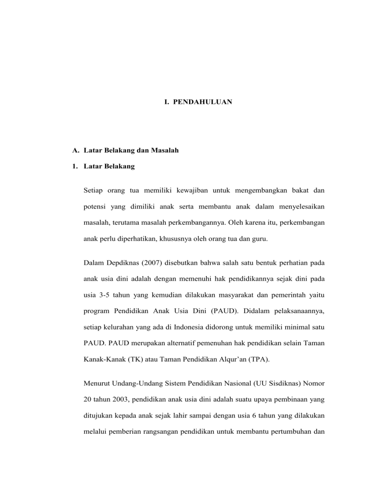 I. PENDAHULUAN A. Latar Belakang dan Masalah 1. Latar Belakang Setiap orang tua memiliki kewajiban untuk mengembangkan bakat dan potensi yang dimiliki anak serta membantu anak dalam menyelesaikan masalah, terutama masalah perkembangannya. Oleh karena itu, perkembangan anak perlu diperhatikan, khususnya oleh orang tua dan guru. Dalam Depdiknas (2007) disebutkan bahwa salah satu bentuk perhatian pada anak usia dini adalah dengan memenuhi hak pendidikannya sejak dini pada usia 3-5 tahun yang kemudian dilakukan masyarakat dan pemerintah yaitu program Pendidikan Anak Usia Dini (PAUD). Didalam pelaksanaannya, setiap kelurahan yang ada di Indonesia didorong untuk memiliki minimal satu PAUD. PAUD merupakan alternatif pemenuhan hak pendidikan selain Taman Kanak-Kanak (TK) atau Taman Pendidikan Alqur’an (TPA). Menurut Undang-Undang Sistem Pendidikan Nasional (UU Sisdiknas) Nomor 20 tahun 2003, pendidikan anak usia dini adalah suatu upaya pembinaan yang ditujukan kepada anak sejak lahir sampai dengan usia 6 tahun yang dilakukan melalui pemberian rangsangan pendidikan untuk membantu pertumbuhan dan 2 perkembangan jasmani dan rohani agar anak memiliki kesiapan dalam memasuki pendidikan lebih lanjut. Pendidikan anak usia dini dianggap penting karena ketika anak lahir telah dibekali oleh Tuhan dengan berbagai potensi genetis, tetapi lingkungan memberi peran sangat besar dalam pembentukan sikap kepribadian dan pengembangan kemampuan anak. Selain itu jaringan otak manusia yang paling menentukan terjadi ketika anak masih berusia dini, dan usia 4 tahun pertama merupakan usia yang paling rawan. Yang perlu diperhatikan dari anak adalah seberapa jauh anak merasa diperhatikan, diberi kebebasan atau kesempatan untuk mengekspresikan ide-idenya, dihargai hasil karya atau prestasinya, didengar isi hatinya, tidak ada paksaan atau tekanan, ancaman terhadap dirinya dan mendapatkan layanan pendidikan sesuai tingkat usia dan perkembangan kejiwaannya. Hal ini juga didukung oleh Prastisti (2008: 56) yang menyatakan bahwa usia ini juga disebut sebagai masa emas atau golden age. Masa-masa tersebut merupakan masa kritis dimana seorang anak membutuhkan rangsanganrangsangan yang tepat untuk mencapai kematangan yang sempurna. Arti kritis adalah sangat memengaruhi keberhasilan pada masa berikutnya. Apabila masa kritis ini tidak memperoleh rangsangan yang tepat dalam bentuk latihan atau proses belajar maka diperkirakan anak akan mengalami kesulitan pada masamasa perkembangan berikutnya. Rangsangan ini dapat diperoleh dari lingkungan. Seperti menurut Hurlock (1980:111) lingkungan yang merangsang dimana anak memperoleh kesempatan untuk menggunakan kemampuannya semaksimal mungkin. 3 Setiap perkembangan anak merupakan suatu perkembangan yang kompleks, dapat terbentuk hanya dari diri anak saja tetapi juga lingkungan tempat tinggal anak, lingkungan yang pertama dan paling berpengaruh adalah lingkungan keluarga, dimana orang tua sangat berperan di dalamnya. Dapat kita lihat saat ini banyak orang tua yang kerap meletakkan harapan-harapan yang terlalu tinggi pada anak mereka. Padahal seharusnya harapan itu disesuaikan dengan kemampuan anak itu sendiri. Bila kemampuan anak tidak sampai pada yang diharapkan orang tua, akibatnya anak akan sering mendapat kritikan, rasa takut, kekecewaan. Hal ini mengakibatkan anak kehilangan rasa kepercayaan pada kemampuan dirinya sendiri. Berdasarkan PP 17 Tahun 2010 tentang Pengelolaan dan Penyelenggaraan Pendidikan, fungsi dan tujuan PAUD diatur dalam Pasal 61, yang berbunyi: (1) Pendidikan anak usia dini berfungsi membina, menumbuhkan, dan mengembangkan seluruh potensi anak usia dini secara optimal sehingga terbentuk perilaku dan kemampuan dasar sesuai dengan tahap perkembangannya agar memiliki kesiapan untuk memasuki pendidikan selanjutnya. (2) Pendidikan anak usia dini bertujuan: a. membangun landasan bagi berkembangnya potensi peserta didik agar menjadi manusia beriman dan bertakwa kepada Tuhan Yang Maha Esa, berakhlak mulia, berkepribadian luhur, sehat, berilmu, cakap, kritis, kreatif, inovatif, mandiri, percaya diri, dan menjadi warga negara yang demokratis dan bertanggung jawab; dan b. mengembangkan potensi kecerdasan spiritual, intelektual, emosional, kinestetis, dan sosial peserta didik pada masa emas pertumbuhannya dalam lingkungan bermain yang edukatif dan menyenangkan. Berdasarkan tujuan itu, PAUD ikut berperan dalam mengembangkan potensi yang dalam diri anak, supaya anak dapat menjadi manusia yang memiliki iman dan takwa kepada Tuhan Yang Maha Esa, berakhlak mulia, kepribadian 4 luhur, sehat, berilmu, cakap, kritis, kreatif, inovatif, mandiri, percaya diri serta dapat bertanggung jawab. Selain untuk memenuhi tujuan PAUD, proses pembentukan percaya diri merupakan salah satu tugas perkembangan masa anak-anak awal. Hal ini didukung oleh pendapat Lie (2003) yang mengatakan bahwa percaya diri adalah modal dasar seorang anak dalam memenuhi berbagai kebutuhan sendiri. Ketika baru dilahirkan, seorang anak sangat bergantung pada orang dewasa dalam memenuhi kebutuhan hidupnya. Dalam proses selanjutnya anak berhasil bertahan hidup dan makin meningkatkan berbagai kemampuan untuk mengurangi ketergantungan pada orang dewasa dalam memenuhi kebutuhan sendiri. Untuk anak-anak, rasa percaya diri membuat mereka mampu mengatasi tekanan dan penolakan dari teman-teman sebayanya. Menurut Lie (2003: 4) ada beberapa ciri-ciri perilaku anak yang mencerminkan percaya diri diantaranya: 1. 2. 3. 4. 5. 6. 7. Yakin pada diri sendiri Tidak terlalu bergantung kepada orang lain Tidak ragu-ragu Merasa diri berharga Tidak menyombongkan diri Memiliki keberanian untuk bertindak Mempunyai cara pandang yang positif terhadap diri sendiri dan orang lain Dengan demikian anak yang percaya diri akan mempunyai kemampuan untuk menghadapi situasi sulit dan berani minta bantuan jika mereka memerlukannya karena mereka memiliki keyakinan pada diri sendiri, tidak terlalu tergantung kepada orang lain dan memiliki keberanian untuk bertindak. 