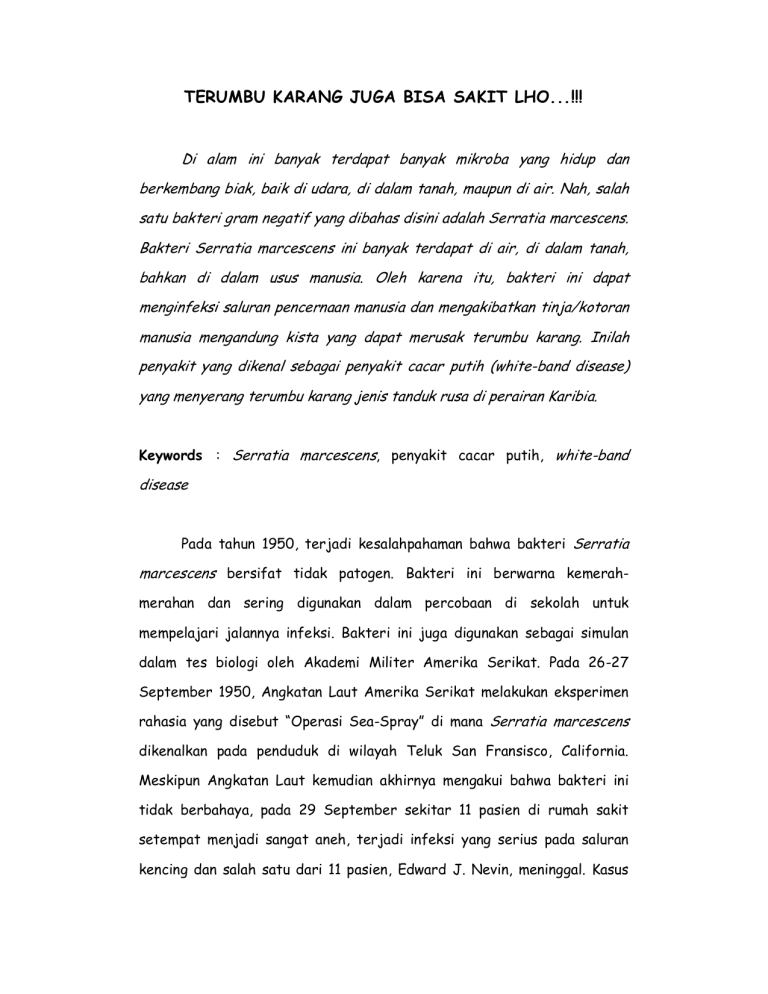 TERUMBU KARANG JUGA BISA SAKIT LHO...!!! Di alam ini banyak terdapat banyak mikroba yang hidup dan berkembang biak, baik di udara, di dalam tanah, maupun di air. Nah, salah satu bakteri gram negatif yang dibahas disini adalah Serratia marcescens. Bakteri Serratia marcescens ini banyak terdapat di air, di dalam tanah, bahkan di dalam usus manusia. Oleh karena itu, bakteri ini dapat menginfeksi saluran pencernaan manusia dan mengakibatkan tinja/kotoran manusia mengandung kista yang dapat merusak terumbu karang. Inilah penyakit yang dikenal sebagai penyakit cacar putih (white-band disease) yang menyerang terumbu karang jenis tanduk rusa di perairan Karibia. Keywords : Serratia marcescens, penyakit cacar putih, white-band disease Pada tahun 1950, terjadi kesalahpahaman bahwa bakteri Serratia marcescens bersifat tidak patogen. Bakteri ini berwarna kemerahmerahan dan sering digunakan dalam percobaan di sekolah untuk mempelajari jalannya infeksi. Bakteri ini juga digunakan sebagai simulan dalam tes biologi oleh Akademi Militer Amerika Serikat. Pada 26-27 September 1950, Angkatan Laut Amerika Serikat melakukan eksperimen rahasia yang disebut “Operasi Sea-Spray” di mana Serratia marcescens dikenalkan pada penduduk di wilayah Teluk San Fransisco, California. Meskipun Angkatan Laut kemudian akhirnya mengakui bahwa bakteri ini tidak berbahaya, pada 29 September sekitar 11 pasien di rumah sakit setempat menjadi sangat aneh, terjadi infeksi yang serius pada saluran kencing dan salah satu dari 11 pasien, Edward J. Nevin, meninggal. Kasus pneumonia di San Fransisco juga meningkat setelah Serratia marcescens dikenalkan. Sejak 1950, Serratia marcescens meningkatkan kasus infeksi pada manusia, dengan banyak kuman yang resistan terhadap segala antibiotik. Indikasi pertama adalah influenza yang vaksinnya diproduksi oleh Perusahaan Chiron pada 2004, termasuk kontaminasi Serratia marcescens. Klasifikasi: Kingdom : Bakteri Phylum : Proteobakteri Class : Gamma Proteobakteri Marga : Enterobacteriales Famili : Enterobacteriaceae Genus : Serratia Spesies : Serratia marcescens Nama Binomial: Serratia marcecescens Serratia marcescens adalah suatu jenis bakteri gram negatif dari famili Enterobacteriaceae. Bakteri ini berbentuk basil (bulat lonjong) dan beberapa galur membentuk kapsul, termasuk organisme yang bergerak dengan cepat (motil) karena mempunyai flagela peritrik, dapat tumbuh dalam kisaran suhu 5o-40oC dan dalam kisaran pH antara 5-9. Serratia marcescens dapat digambarkan secara detail karena ia adalah spesies yang umumnya ditemukan dalam spesimen ilmu pengobatan. Koloni Serratia marcescens pada media agar biasa tidak terbedakan pada hari pertama atau hari kedua dan kemudian mungkin berkembang menjadi cembung. Pada suhu kamar, bakteri patogen ini menghasilkan zat warna (pigmen) merah. Bakteri ini jenis fakultatif anaerobik yang tidak terlalu membutuhkan oksigen. Patogenesis: Pada orang dewasa, Serratia marcescens terlibat dalam infeksi pada saluran kencing, saluran pernapasan (pneumonia), infeksi mata, meningitis, dan infeksi pada kulit yang terluka. Sedangkan pada anak-anak, Serratia marcescens menginfeksi saluran pencernaan. Karena Serratia marcescens juga menginfeksi saluran pencernaan manusia, maka kotoran manusia dari hasil pencernaan yang terinfeksi tersebut dapat mematikan terumbu karang jenis tanduk rusa (Acropora palmate). Penyakit cacar putih (white-band disease) menyerang Acropora palmate di perairan Karibia. Penyakit cacar putih menyerang daging dari kulit karang yang tipis dan menguliti jaringan hidup dari cabang-cabangnya sehingga meninggalkan kerangka batu kapur mati. Masalah ini semakin parah selama berbulan-bulan musim panas, saat suhu meninggi yang mempercepat pertumbuhan bakteri dan mengurangi ketahanan dari sistem kekebalan karang tanduk rusa. Aktivitas Biokimia: Organisme Serratia menfermentasikan mannitol, salisin, dan sukrosa dengan produknya berupa asam dan kadang-kadang terdapat buih/gelembung. Serratia marcescens dibedakan dari bakteri gram negatif lainnya karena ia melakukan hidrolisis kasein. Hidrolisis kasein yang dilakukan Serratia marcescens untuk menghasilkan metalloprotease ekstraselular yang berfungsi dalam interaksi sel ke matriks ekstraselular. Serratia marcescens juga menunjukkan adanya triptofan dan degradasi sitrat. Salah satu produk akhir dari degradasi triptofan adalah asam piruvat. Sitrat dan asetat dapat digunakan sebagai sumber karbon satusatunya. Banyak galur menghasilkan pigmen merah muda, merah/magenta. Glukosa difermentasikan dengan atau tanpa produksi gas dengan volume kecilÍž selobiose, inositol, dan gliserol difermentasi tanpa menghasilkan gas. Kandungan G + C DNA berkisar dari 53 samapi 59 mol %. Habitat Serratia marcescens banyak ditemukan di alam terutama di air dan tanah, tetapi beberapa terdapat dalam usus manusia. Penularannya melalui kontak langsung, tetesan dan dalam beberapa kasus ditemukan tumbuh pada saluran kencing, pada larutan garam, dan dalam larutan lain yang semula diduga steril. Dalam hal pengobatan, antibiotik yang digunakan untuk infeksi pada manusia Gentamicin, adalah dan Cephalosporins, Amikacin. Namun, sebagian bakteri ada yang resistan dengan beberapa antibiotik karena banyaknya faktor R di dalam plasmid. Gambar di atas adalah salah satu antibiotik yang digunakan untuk mengobati infeksi saluran pernapasan bawah (pnemonia). Antibiotik itu adalah PROCEPIM® yang tiap vialnya mengandung Cefepime HCl yang telah dicampur dengan L- arginine steril setara dengan cefepime 1 g. Cefepime merupakan antibiotik sefalosporin generasi ke empat yang mempunyai spektrum luas, efektif terhadap bakteri gram-positif dan gram-negatif termasuk terhadap strain yang resisten terhadap aminoglikosida atau sefalosporin generasi ketiga seperti ceftazidime. Cefepime memiliki kestabilan yang tinggi terhadap hidrolisis betalaktamase dan menunjukkan penetrasi yang cepat ke dalam dinding sel bakteri gram-negatif. Cara pemberian PROCEPIM® (cefepime) adalah dapat 
