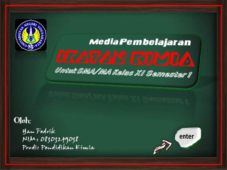 MATERI PEMBELAJARAN IKATAN KIMIA KELAS XI GEOMETRI MOLEKUL MATERI PEMBELAJARAN IKATAN KIMIA KELAS XI INDIKATOR SK & KD TUJUAN PEMBELAJARAN GEOMETRI MOLEKUL MATERI PEMBELAJARAN IKATAN KIMIA KELAS XI Bentuk Molekul GEOMETRI MOLEKUL Teori Domain Elektron Teori Hibridisasi MATERI PEMBELAJARAN IKATAN KIMIA KELAS XI GEOMETRI MOLEKUL Gaya London Gaya Tarik Dipol-Dipol Ikatan Hidrogen MATERI PEMBELAJARAN IKATAN KIMIA KELAS XI GEOMETRI MOLEKUL Molekul Polar & Nonpolar Pengaruh Geometri Molekul Terhadap Kepolaran Molekul Beberapa Bentuk Molekul Sederhana LINEAR SEGITIGA PLANAR TETRAHEDRON OKTAHEDRON BIPIRAMIDA TRIGONAL Molekul Linear Molekul linear memiliki geometri garis lurus (linear): Molekul linear 2 atom mempunyai satu ikatan kovalen Molekul linear 3 atom mempunyai dua ikatan kovalen dengan sudut ikatan sebesar 180o 180o Molekul Segitiga Planar Memiliki geometri segitiga sama sisi dengan 4 atom. Ketiga atom yang terletak pada ketiga sudut segitiga sama sisi tersebut terikat secara kovalen ke 1 atom pusat. Ikatan-ikatan kovalennya membentuk sudut ikatan sebesar 120o. 120o Molekul Tetrahedron Memiliki geometri seperti piramida sisi segitiga dengan 5 atom. Keempat atom yang terletak pada keempat puncak piramida terikat secara kovalen ke 1 atom pusat. Ikatan-ikatan kovalennya membentuk sudut ikatan sebesar 109,5o 109o Molekul Oktahedron Memiliki geometri seperti dua piramida empat sisi dengan 7 atom yang mempunyai alas segiempat yang sama. Keenam atom terikat secara kovalen ke 1 atom pusat. Ikatan-ikatan kovalennya membentuk sudut ikatan sebesar 90o 90o Molekul Bipiramida Trigonal Memiliki geometri seperti dua piramida tiga sisi yang mempunyai alas segitiga yang sama dengan 6 atom. Kelima atom terikat secara kovalen ke 1 atom pusat. Ada 3 ikatan di ekuator yang membentuk sudut ekuatorial sebesar 120o, dan 2 ikatan di arah aksial yang membentuk sudut aksial sebesar 90o dengan ekuator. Teori domain elektron adalah suatu cara meramalkan geometri molekul berdasarkan tolak-menolak elektronelektron pada kulit luar atom pusat. Teori ini merupakan penyempurnaan dari teori VSEPR Jumlah domain elektron ditentukan dari Setiap eletron ikatan (tunggal, rangkap, atau rangkap tiga) Setiap pasangan elektron bebas Merupakan satu domain Domain elektron dibedakan menjadi Domain elektron ikatan (DEI) Domain elektron bebas (DEB) memiliki Pasangan elektron ikatan Pasangan elektron bebas Jumlah domain dapat menggambarkan bentuk geometri suatu senyawa. Teori domain elektron dapat digunakan untuk meramalkan geometri molekul suatu senyawa dengan menggunakan rumus: AXnEm Dimana: A = atom pusat X = semua atom yang terikat ke atom pusat E = domain elektron bebas (DEB) n = jumlah DEI m = jumlah DEB Dari rumus tersebut digunakan Tabel 1 (klik tombol) untuk menentukan nama dari bentuk molekul. Tabel 1 Domain elektron di sekitar atom pusat DEI (n) DEB (m) AXnEm Bentuk Molekul 2 2 0 AX2 Linear 3 0 AX3 Segitiga sama sisi trigonal 2 1 AX2E Bengkok 4 0 AX4 Tetrahedron 3 1 AX3E Piramida Trigonal 2 2 AX2E2 Planar bentuk V atau non-linear 5 0 AX5 Bipiramida Trigonal 4 1 AX4E Jungkat-jungkit (seesaw) 3 2 AX3E2 Planar bentuk T 2 3 AX2E3 Linear 6 0 AX6 Oktahedron 5 1 AX5E Piramida Segiempat 4 2 AX4E2 Planar Segiempat 3 4 5 6 Berikut gambar strukturnya: Linear Bipiramida Trigonal Linear Trigonal Planar Bengkok Tetrahedron Planar bentuk V Planar bentuk T Planar Segiempat Piramida Trigonal Oktahedron Jungkat-jungkit (seesaw) Piramida Segiempat Back to Tabel Sumber: http://wanibesak.wordpress.com Contoh 1 : Menentukan geometri molekul BeF2 Atom pusat Be mengikat 2 atom F Konfigurasi Be dgn n.a = 4 (2,2) ev = 2 Konfigurasi F dgn n.a = 9 (2,7) ev = 7 Rumus Lewis BeF2 F B F DEI = 2 DEB = 0 Be Diperoleh = AX2 E0 atau AX2 Berdasarkan Tabel 1, maka geometri molekul BeF2 adalah linear. Jumlah domain elektron di sekitar atom pusat = 2 F Dari rumus AXnEm F Contoh 2 : Menentukan geometri molekul NH3 Atom pusat N mengikat 3 atom H Konfigurasi N dgn n.a = 7 (2,5) ev = 5 Konfigurasi H dgn n.a = 1 (1) ev = 1 Rumus Lewis NH3 Dari rumus AXnEm Diperoleh = AX3 E1 atau AX2E Berdasarkan Tabel 1, maka geometri molekul NH3 adalah piramida trigonal. Jumlah domain elektron di sekitar atom pusat = 4 H N H H DEB = 1 N H DEI = 3 H H Hibridisasi adalah peleburan orbital-orbital dari tingkat energi yang berbeda menjadi orbital-orbital yang setingkat. Orbital-orbital baru yang terbentuk dari proses hibridisasi disebut orbital hibrida. Dalam hibridisasi yang bercampur adalah jumlah orbital bukan jumlah elektron. Jumlah orbital hibrida (hasil hibridisasi) sama dengan jumlah orbital yang terlibat pada hibridisasi itu. Proses hibridisasi berlangsung dalam tahap-tahap berikut. 1. Elektron mengalami promosi atau perpindahan ke orbital yang tingkat energinya lebih tinggi, kecuali molekul yang mempunyai pasangan elektron bebas, seperti H2O dan NH3. 2. Orbital-orbital bercampur atau berhibridisasi membentuk orbital hibrida yang ekuivalen Geometri molekul dari orbital hibrida dapat dilihat pada Tabel 2. Orbital Hibrida Geometri Molekul Contoh sp Linear BeF2 , HgCl2 sp2 Trigonal Planar BF3 , SO3 sp3 Tetrahedral NH3 , H2O, NH4+ sp3d Trigonal Bipiramida PF5 , SF4 , BrF3 Oktahedral ClF5 , PF6 Bujursangkar XeF4 sp3d2 CONTOH: Proses hibridisasi pembentukan molekul CH4 (metana) Konfigurasi elektron atom C dgn n.a = 6 adalah: 1s2, 2s2, 2p2 Konfigurasi elektron terluar atom C sebagai berikut. 2s2 2px1 2py1 2pz0 Satu e- dari orbital 2s mengalami promosi ke orbital 2pz menghasilkan konfigurasi e- baru 2s2 2px1 2py1 2pz0 2s2 2px1 2py1 2pz1 Konf. e- baru 2s2 2px1 2py1 2pz1 2s2 Keempat orbital 2s, 2px , 2py , dan orbital 2pz masing-masing berisi sebuah elektron (orbital setengah penuh) dapat menerima 4 e- dari 4 atom H dan membentuk CH4 2px1 2py1 2pz1 Orbital sp3 H H H H Keempat orbital ini berubah bentuk menjadi orbital hibrida sp3 yang ekuivalen berbentuk tetrahedral. Jadi bentuk molekul CH4 adalah tetrahedral. Molekul Non-polar Molekul yang tidak memperlihatkan adanya kutub positif dan kutub 