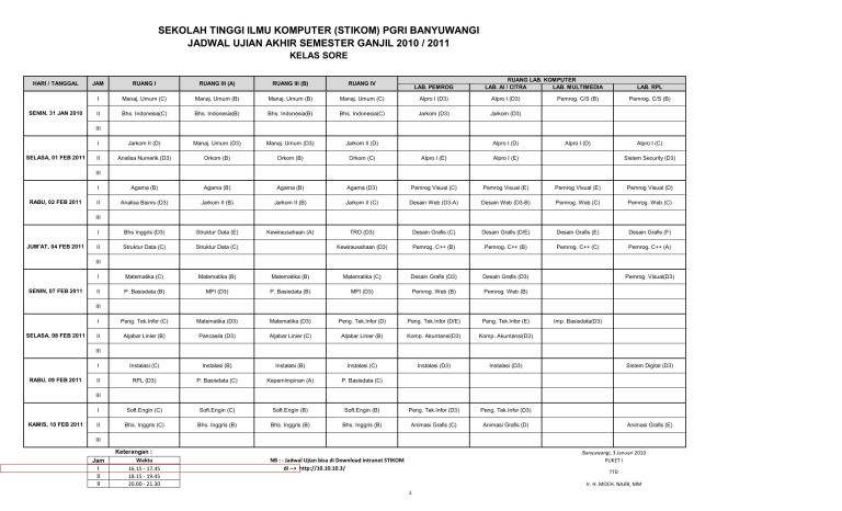 SEKOLAH TINGGI ILMU KOMPUTER (STIKOM) PGRI BANYUWANGI JADWAL UJIAN AKHIR SEMESTER GANJIL 2010 / 2011 KELAS SORE HARI / TANGGAL SENIN, 31 JAN 2010 RUANG LAB. KOMPUTER LAB. AI / CITRA LAB. MULTIMEDIA JAM RUANG I RUANG III (A) RUANG III (B) RUANG IV I Manaj. Umum (C) Manaj. Umum (B) Manaj. Umum (B) Manaj. Umum (C) Alpro I (D3) Alpro I (D3) II Bhs. Indonesia(C) Bhs. Indonesia(B) Bhs. Indonesia(B) Bhs. Indonesia(C) Jarkom (D3) Jarkom (D3) I Jarkom II (D) Manaj. Umum (D3) Manaj. Umum (D3) Jarkom II (D) II Analisa Numerik (D3) Orkom (B) Orkom (B) Orkom (C) Alpro I (E) Alpro I (E) I Agama (B) Agama (B) Agama (B) Agama (D3) Pemrog Visual (C) Pemrog Visual (E) Pemrog Visual (E) Pemrog Visual (D) II Analisa Bisnis (D3) Jarkom II (B) Jarkom II (B) Jarkom II (C) Desain Web (D3-A) Desain Web (D3-B) Pemrog. Web (C) Pemrog. Web (C) I Bhs Inggris (D3) Struktur Data (E) Kewirausahaan (A) TRO (D3) Desain Grafis (C) Desain Grafis (D/E) Desain Grafis (E) Desain Grafis (F) II Struktur Data (C) Struktur Data (C) Kewirausahaan (D3) Pemrog. C++ (B) Pemrog. C++ (B) Pemrog. C++ (C) Pemrog. C++ (A) I Matematika (C) Matematika (B) Matematika (B) Matematika (C) Desain Grafis (D3) Desain Grafis (D3) II P. Basisdata (B) MPI (D3) P. Basisdata (B) MPI (D3) Pemrog. Web (B) Pemrog. Web (B) I Peng. Tek.Infor (C) Matematika (D3) Matematika (D3) Peng. Tek.Infor (D) Peng. Tek.Infor (D/E) Peng. Tek.Infor (E) II Aljabar Linier (B) Pancasila (D3) Aljabar Linier (C) Aljabar Linier (B) Komp. Akuntansi(D3) Komp. Akuntansi(D3) I Instalasi (C) Instalasi (B) Instalasi (B) Instalasi (C) Instalasi (D3) Instalasi (D3) II RPL (D3) P. Basisdata (C) Kepemimpinan (A) P. Basisdata (C) I Soft.Engin (C) Soft.Engin (C) Soft.Engin (B) Soft.Engin (B) Peng. Tek.Infor (D3) Peng. Tek.Infor (D3) II Bhs. Inggris (C) Bhs. Inggris (B) Bhs. Inggris (B) Bhs. Inggris (B) Animasi Grafis (C) Animasi Grafis (D) LAB. PEMROG LAB. RPL Pemrog. C/S (B) Pemrog. C/S (B) Alpro I (D) Alpro I (C) III SELASA, 01 FEB 2011 Alpro I (D) Sistem Security (D3) III RABU, 02 FEB 2011 III JUM'AT, 04 FEB 2011 III SENIN, 07 FEB 2011 Pemrog. Visual(D3) III SELASA, 08 FEB 2011 Imp. Basisdata(D3) III RABU, 09 FEB 2011 Sistem Digital (D3) III KAMIS, 10 FEB 2011 Animasi Grafis (E) III Jam I II II Keterangan : Waktu 16.15 - 17.45 18.15 - 19.45 20.00 - 21.30 Banyuwangi, 3 Januari 2010 PUKET I NB : - Jadwal Ujian bisa di Download intranet STIKOM di --> http://10.10.10.3/ TTD Ir. H. MOCH. NAJIB, MM 1