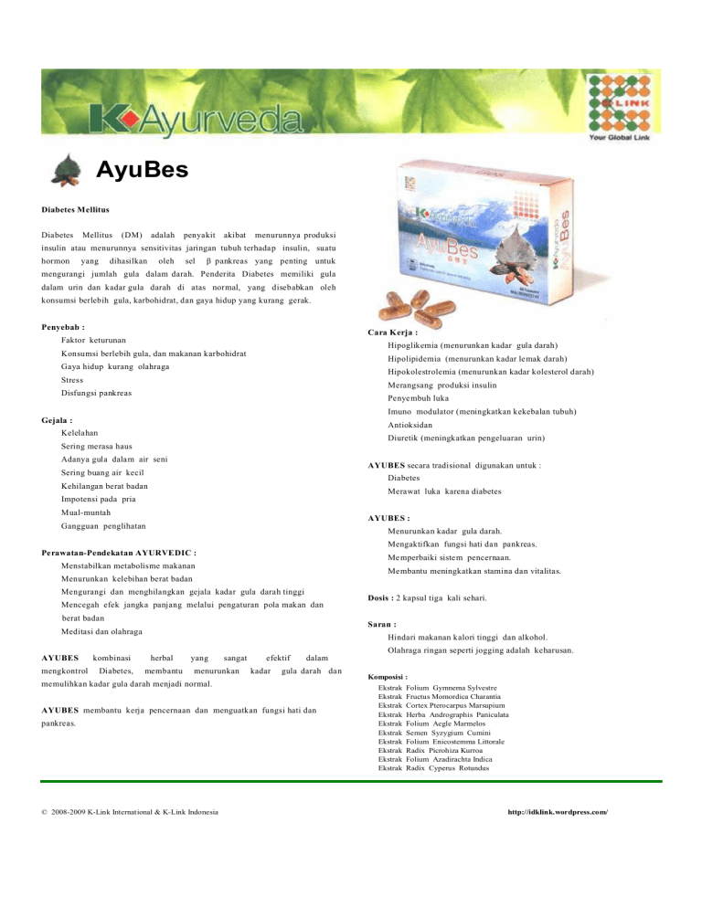 AyuBes Diabetes Mellitus Diabetes Mellitus (DM) adalah penyakit akibat menurunnya produksi insulin atau menurunnya sensitivitas jaringan tubuh terhadap insulin, suatu hormon yang dihasilkan oleh sel pankreas yang penting untuk mengurangi jumlah gula dalam darah. Penderita Diabetes memiliki gula dalam urin dan kadar gula darah di atas normal, yang disebabkan oleh konsumsi berlebih gula, karbohidrat, dan gaya hidup yang kurang gerak. Penyebab : Cara Kerja : Faktor keturunan Hipoglikemia (menurunkan kadar gula darah) Konsumsi berlebih gula, dan makanan karbohidrat Hipolipidemia (menurunkan kadar lemak darah) Gaya hidup kurang olahraga Hipokolestrolemia (menurunkan kadar kolesterol darah) Stress Merangsang produksi insulin Disfungsi pankreas Penyembuh luka Imuno modulator (meningkatkan kekebalan tubuh) Gejala : Antioksidan Kelelahan Diuretik (meningkatkan pengeluaran urin) Sering merasa haus Adanya gula dalam air seni AYUBES secara tradisional digunakan untuk : Sering buang air kecil Diabetes Kehilangan berat badan Merawat luka karena diabetes Impotensi pada pria Mual-muntah AYUBES : Gangguan penglihatan Menurunkan kadar gula darah. Mengaktifkan fungsi hati dan pankreas. Perawatan-Pendekatan AYURVEDIC : Me mperbaiki sistem pencernaan. Menstabilkan metabolisme makanan Membantu meningkatkan stamina dan vitalitas. Menurunkan kelebihan berat badan Mengurangi dan menghilangkan gejala kadar gula darah tinggi Mencegah efek jangka panjang melalui pengaturan pola makan dan berat badan Dosis : 2 kapsul tiga kali sehari. Saran : Meditasi dan olahraga Hindari makanan kalori tinggi dan alkohol. Olahraga ringan seperti jogging adalah keharusan. AYUBES mengkontrol kombinasi Diabetes, herbal membantu yang sangat menurunkan efektif kadar dalam gula darah dan memulihkan kadar gula darah menjadi normal. AYUBES membantu kerja pencernaan dan menguatkan fungsi hati dan pankreas. © 2008-2009 K-Link International & K-Link Indonesia Komposisi : Ekstrak Ekstrak Ekstrak Ekstrak Ekstrak Ekstrak Ekstrak Ekstrak Ekstrak Ekstrak Folium Gymnema Sylvestre Fructus Momordica Charantia Cortex Pterocarpus Marsupium Herba Andrographis Paniculata Folium Aegle Marmelos Semen Syzygium Cumini Folium Enicostemma Littorale Radix Picrohiza Kurroa Folium Azadirachta Indica Radix Cyperus Rotundus http://idklink.wordpress.com/