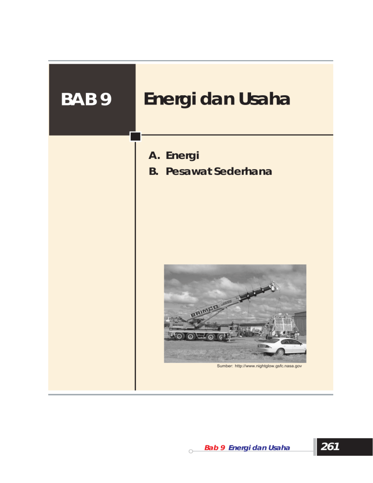 BAB 9 Energi dan Usaha A. Energi B. Pesawat Sederhana Sumber: http://www.nightglow.gsfc.nasa.gov 261 Bab 9 Energi dan Usaha 261 262 IPA SMP Kelas VIII energi potensial menjadi misalnya berubah bentuk energi kinetik dapat daya katrol pesawat sederhana dipermudah dengan usaha bidang miring dapat berupa roda dan poros searah dengan gaya perpindahan pengungkit Hukum kekekalan energi berlaku jika ada dapat menghasilkan cepatnya ditentukan oleh energi Peta Konsep Energi dan Usaha sekrup baji Peta Konsep BAB 9 Energi dan Usaha Bagaimana cara kamu menggunakan energi setiap hari? Setiap aktivitas yang kamu lakukan akan memerlukan pengeluaran energi yang tersimpan dalam tubuhmu. Beberapa kegiatan, misalnya olah raga naik turun tangga memerlukan lebih banyak energi dibanding yang lain. Dalam Bab ini kamu akan mempelajari beberapa bentuk energi, usaha atau kerja, serta peralatan yang memudahkan kerja. Lakukan Kegiatan Penyelidikan di bawah ini, untuk menyelidiki keterkaitan aktivitas dengan penggunaan energi. Amatilah pula bagaimana kamu bergantung pada sumber energi yang ada dalam dirimu. Kegiatan Penyelidikan Pikirkan energi yang terlibat saat kamu mencoba kegiatan berikut ini. 1. Berdiri dan angkat kedua lenganmu setinggi pinggang, dan buka telapak tanganmu. Mintalah temanmu meletakkan beberapa buku pada tanganmu. 2. Angkatlah buku-buku tersebut hingga setinggi bahu, kemudian turunkan lagi tanganmu. Sekarang cobalah menahan buku tersebut. 3. Mintalah teman sekelasmu menambahkan 2 buku lagi. Ulangi kegiatan mengangkat buku tersebut. 4. Sambil tetap membawa buku, berjalanlah beberapa langkah di dalam kelas. 5. Ulangilah kegiatan nomor empat, namun dengan menaiki undak-undakan yang ada di sekolahmu. Kegiatan manakah yang memerlukan banyak energi? Paparkan pemikiranmu, mengapa kegiatan tersebut lebih banyak memerlukan energi didalam Jurnal IPAmu. Sumber: Dok. Penulis. 263 Bab 9 Energi dan Usaha 263 A Energi Apakah energi Itu? Kata-kata IPA energi energi kinetik energi potensial energi mekanik hukum kekekalan energi usaha daya Kamu tentunya telah mengetahui berbagai contoh energi yang dimanfaatkan saat ini. Hampir semua yang kamu lihat atau kerjakan melibatkan energi. Energi itu sesuatu yang agak misterius. Kamu tidak dapat menciumnya. Dalam banyak kejadian kamu tidak dapat melihatnya. Sebagai contoh, cahaya adalah salah satu bentuk energi, dan tanpa cahaya kamu tidak mampu melihat apapun. Kamu tidak dapat melihat listrik, tetapi kamu dapat melihat akibatnya saat menyalakan lampu, dan kamu dapat merasakan akibatnya pada panas yang dihasilkan oleh kumparan pemanggang kue. Kamu tidak dapat melihat energi dalam makanan pada Gambar 9.1, tetapi kamu dapat melihat dan merasakan akibatnya ketika otot-ototmu menggunakan energi tersebut untuk bergerak. Energi – Penyebab Perubahan Jika sebuah bola kasti terbang di udara dan memecahkan jendela, bola tersebut jelas mengubah jendela! Ketika sebuah benda mempunyai kemampuan mengubah lingkungannya, dikatakan benda itu memiliki energi. Bola kasti mempunyai energi dan melakukan usaha terhadap jendela menyebabkan Gambar 9.1 Makanan yang bergizi dan seimbang memberikan “bahan bakar” bagi tubuh. Energi yang tersimpan dalam makanan diubah dalam bentuk yang dapat digunakan tubuh. Sumber: http://www.sinarharapan.co.id. 264 IPA SMP Kelas VIII jendela bergerak. Singkatnya, penggunaan energi melibatkan perubahan. Secara tradisional, energi didefinisikan sebagai kemampuan untuk melakukan usaha, yakni menyebabkan sesuatu berpindah. Tetapi ketika usaha ditunjukkan, selalu ada perubahan. Hubungan ini memberikan definisi umum yang berguna. Energi adalah kemampuan untuk menyebabkan perubahan. Perubahan bentuk energi Jika kamu meminta teman-temanmu untuk memberikan contoh-contoh energi, kamu mungkin akan mendapatkan jawaban yang berbeda-beda. Beberapa diantaranya mungkin menunjuk energi dalam api. Teman lain mungkin memberikan energi yang dibutuhkan untuk lomba lari. Energi terjadi pada berbagai bentuk yang berbeda. Api memiliki energi panas dan energi cahaya. Lemak yang tersimpan dalam tubuhmu mengandung energi kimia. Sebagai penyebab berubahnya benda-benda, energi itu sendiri seringkali mengalami perubahan dari satu bentuk ke bentuk lain. Perubahan bentuk energi terjadi di sekitarmu setiap hari. Ketika mobil terletak di tempat panas sepanjang hari, energi gelombang cahaya berubah menjadi energi panas yang menghangatkan bagian dalam mobil itu. Dalam api unggun seperti Gambar 9.2, energi kimia di dalam kayu berubah menjadi energi cahaya dan energi panas. Selama perubahan bentuk, misalnya saat cahaya berubah menjadi panas, banyaknya energi tetap sama. Tak ada energi yang hilang atau bertambah. Hanya bentuk energi yang berubah, bukan banyaknya energi. Pemanfaatan perubahan bentuk energi, lebih lanjut dapat kamu pelajari pada bagian berikutnya. 265 Sumber: Dok. Penulis. Gambar 9.2 Dalam api unggun, energi kimia dalam kayu diubah, atau berubah bentuk, menjadi energi panas dan cahaya. Bab 9 Energi dan Usaha 265 Energi kinetik dan potensial Telah kamu ketahui bahwa energi dapat berada dalam berbagai bentuk, misalnya cahaya, panas, dan gerak. Sekarang bayangkan sebuah batu yang diam di puncak tebing. Apabila batu tersebut didorong dan bergerak, maka batu tersebut akan jatuh, dan bergerak makin lama makin cepat. Batu yang bergerak tersebut memiliki energi kinetik. Pada saat batu diam di puncak bukit, batu tersebut memiliki energi potensial. Energi Kinetik: pada Benda Bergerak Biasanya, ketika kamu berpikir tentang energi, kamu berpikir tentang gerak. Energi kinetik adalah energi dalam bentuk gerak. Roda sepeda yang berputar, anak-anak yang berlari dalam Gambar 9.3, dan plastik yang melayang semuanya memiliki energi kinetik. Berapa besarnya? Energi ini bergantung pada massa dan kecepatan benda yang bergerak. Sumber: Dok. Penulis. Gambar 9.3 Anak-anak yang sedang berlari ini menggunakan banyak energi. Kegiatan macam apakah yang hanya membutuhkan sedikit energi? Semakin besar massa benda 