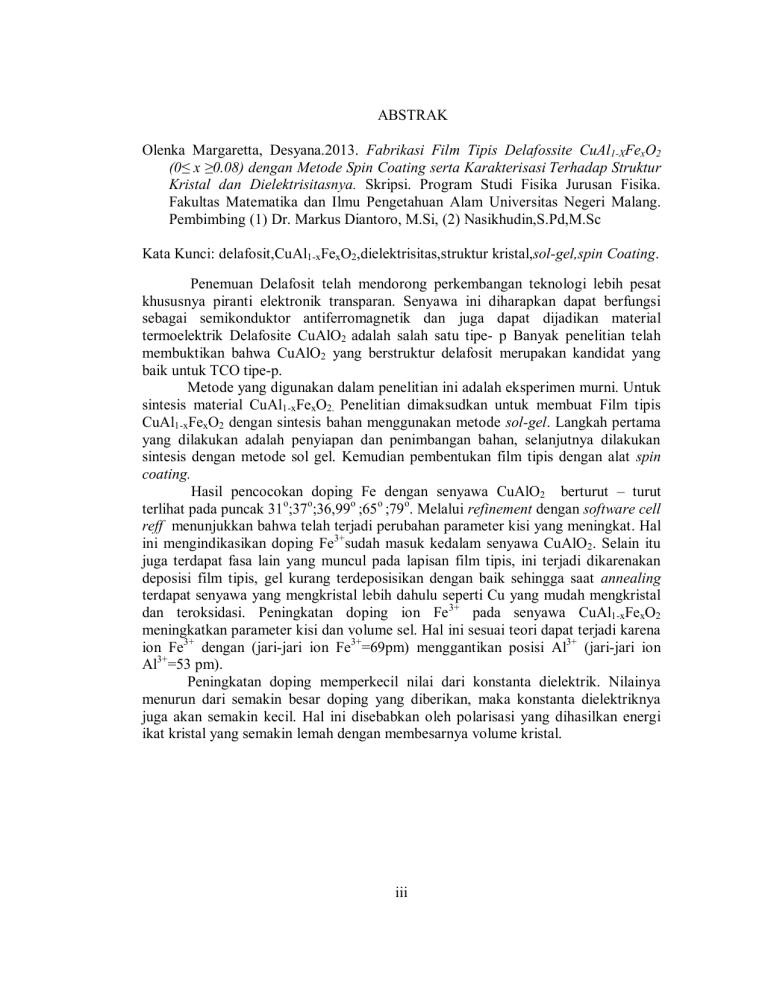 ABSTRAK Olenka Margaretta, Desyana.2013. Fabrikasi Film Tipis Delafossite CuAl1-XFexO2 (0≤ x ≥0.08) dengan Metode Spin Coating serta Karakterisasi Terhadap Struktur Kristal dan Dielektrisitasnya. Skripsi. Program Studi Fisika Jurusan Fisika. Fakultas Matematika dan Ilmu Pengetahuan Alam Universitas Negeri Malang. Pembimbing (1) Dr. Markus Diantoro, M.Si, (2) Nasikhudin,S.Pd,M.Sc Kata Kunci: delafosit,CuAl1-xFexO2,dielektrisitas,struktur kristal,sol-gel,spin Coating. Penemuan Delafosit telah mendorong perkembangan teknologi lebih pesat khususnya piranti elektronik transparan. Senyawa ini diharapkan dapat berfungsi sebagai semikonduktor antiferromagnetik dan juga dapat dijadikan material termoelektrik Delafosite CuAlO2 adalah salah satu tipe- p Banyak penelitian telah membuktikan bahwa CuAlO2 yang berstruktur delafosit merupakan kandidat yang baik untuk TCO tipe-p. Metode yang digunakan dalam penelitian ini adalah eksperimen murni. Untuk sintesis material CuAl1-xFexO2. Penelitian dimaksudkan untuk membuat Film tipis CuAl1-xFexO2 dengan sintesis bahan menggunakan metode sol-gel. Langkah pertama yang dilakukan adalah penyiapan dan penimbangan bahan, selanjutnya dilakukan sintesis dengan metode sol gel. Kemudian pembentukan film tipis dengan alat spin coating. Hasil pencocokan doping Fe dengan senyawa CuAlO2 berturut – turut terlihat pada puncak 31o;37o;36,99o ;65o ;79o. Melalui refinement dengan software cell reff menunjukkan bahwa telah terjadi perubahan parameter kisi yang meningkat. Hal ini mengindikasikan doping Fe3+sudah masuk kedalam senyawa CuAlO2. Selain itu juga terdapat fasa lain yang muncul pada lapisan film tipis, ini terjadi dikarenakan deposisi film tipis, gel kurang terdeposisikan dengan baik sehingga saat annealing terdapat senyawa yang mengkristal lebih dahulu seperti Cu yang mudah mengkristal dan teroksidasi. Peningkatan doping ion Fe 3+ pada senyawa CuAl1-xFexO2 meningkatkan parameter kisi dan volume sel. Hal ini sesuai teori dapat terjadi karena ion Fe3+ dengan (jari-jari ion Fe3+=69pm) menggantikan posisi Al3+ (jari-jari ion Al3+=53 pm). Peningkatan doping memperkecil nilai dari konstanta dielektrik. Nilainya menurun dari semakin besar doping yang diberikan, maka konstanta dielektriknya juga akan semakin kecil. Hal ini disebabkan oleh polarisasi yang dihasilkan energi ikat kristal yang semakin lemah dengan membesarnya volume kristal. iii