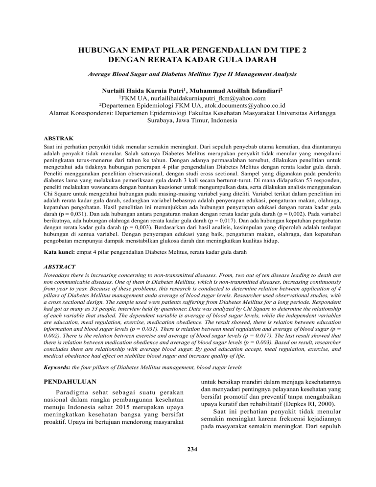 HUBUNGAN EMPAT PILAR PENGENDALIAN DM TIPE 2 DENGAN RERATA KADAR GULA DARAH Average Blood Sugar and Diabetus Mellitus Type II Management Analysis Nurlaili Haida Kurnia Putri1, Muhammad Atoillah Isfandiari2 1FKM UA, nurlailihaidakurniaputri_fkm@yahoo.com 2Departemen Epidemiologi FKM UA, atok.documents@yahoo.co.id Alamat Korespondensi: Departemen Epidemiologi Fakultas Kesehatan Masyarakat Universitas Airlangga Surabaya, Jawa Timur, Indonesia ABSTRAK Saat ini perhatian penyakit tidak menular semakin meningkat. Dari sepuluh penyebab utama kematian, dua diantaranya adalah penyakit tidak menular. Salah satunya Diabetes Melitus merupakan penyakit tidak menular yang mengalami peningkatan terus-menerus dari tahun ke tahun. Dengan adanya permasalahan tersebut, dilakukan penelitian untuk mengetahui ada tidaknya hubungan penerapan 4 pilar pengendalian Diabetes Melitus dengan rerata kadar gula darah. Peneliti menggunakan penelitian observasional, dengan studi cross sectional. Sampel yang digunakan pada penderita diabetes lama yang melakukan pemeriksaan gula darah 3 kali secara berturut-turut. Di mana didapatkan 53 responden, peneliti melakukan wawancara dengan bantuan kuesioner untuk mengumpulkan data, serta dilakukan analisis menggunakan Chi Square untuk mengetahui hubungan pada masing-masing variabel yang diteliti. Variabel terikat dalam penelitian ini adalah rerata kadar gula darah, sedangkan variabel bebasnya adalah penyerapan edukasi, pengaturan makan, olahraga, kepatuhan pengobatan. Hasil penelitian ini menunjukkan ada hubungan penyerapan edukasi dengan rerata kadar gula darah (p = 0,031). Dan ada hubungan antara pengaturan makan dengan rerata kadar gula darah (p = 0,002). Pada variabel berikutnya, ada hubungan olahraga dengan rerata kadar gula darah (p = 0,017). Dan ada hubungan kepatuhan pengobatan dengan rerata kadar gula darah (p = 0,003). Berdasarkan dari hasil analisis, kesimpulan yang diperoleh adalah terdapat hubungan di semua variabel. Dengan penyerapan edukasi yang baik, pengaturan makan, olahraga, dan kepatuhan pengobatan mempunyai dampak menstabilkan glukosa darah dan meningkatkan kualitas hidup. Kata kunci: empat 4 pilar pengendalian Diabetes Melitus, rerata kadar gula darah ABSTRACT Nowadays there is increasing concerning to non-transmitted diseases. From, two out of ten disease leading to death are non communicable diseases. One of them is Diabetes Mellitus, which is non-transmitted diseases, increasing continuously from year to year. Because of these problems, this research is conducted to determine relation between application of 4 pillars of Diabetes Mellitus management anda average of blood sugar levels. Researcher used observational studies, with a cross sectional design. The sample used were patients suffering from Diabetes Mellitus for a long periode. Respondent had got as many as 53 people, interview held by questioner. Data was analyzed by Chi Square to determine the relationship of each variable that studied. The dependent variable is average of blood sugar levels, while the independent variables are education, meal regulation, exercise, medication obedience. The result showed, there is relation between education information and blood sugar levels (p = 0.031). There is relation between meal regulation and average of blood sugar (p = 0.002). There is the relation between exercise and average of blood sugar levels (p = 0.017). The last result showed that there is relation between medication obedience and average of blood sugar levels (p = 0.003). Based on result, researcher concludes there are relationship with average blood sugar. By good education accept, meal regulation, exercise, and medical obedience had effect on stabilize blood sugar and increase quality of life. Keywords: the four pillars of Diabetes Mellitus management, blood sugar levels PENDAHULUAN untuk bersikap mandiri dalam menjaga kesehatannya dan menyadari pentingnya pelayanan kesehatan yang bersifat promotif dan preventif tanpa mengabaikan upaya kuratif dan rehabilitatif (Depkes RI, 2000). Saat ini perhatian penyakit tidak menular semakin meningkat karena frekuensi kejadiannya pada masyarakat semakin meningkat. Dari sepuluh Paradigma sehat sebagai suatu gerakan nasional dalam rangka pembangunan kesehatan menuju Indonesia sehat 2015 merupakan upaya meningkatkan kesehatan bangsa yang bersifat proaktif. Upaya ini bertujuan mendorong masyarakat 234 Nurlaili, dkk., Hubungan Empat Pilar Pengendalian DM… penyebab utama kematian, dua diantaranya adalah penyakit tidak menular. Keadaan ini terjadi di dunia, baik di negara maju maupun di negara dengan ekonomi rendah dan menengah. Organisasi kesehatan dunia (WHO) mempergunakan istilah penyakit kronis (chronic diseases) untuk penyakitpenyakit tidak menular. Penyakit tidak menular disebut juga sebagai new communicable diseases karena penyakit ini dianggap dapat menular, yakni melalui gaya hidup (Bustan, 2007). Salah satunya adalah penyakit diabetes melitus (DM) merupakan sebuah penyakit, di mana kondisi kadar glukosa di dalam darah melebihi batas normal. Hal ini disebabkan karena tubuh tidak dapat melepaskan atau menggunakan insulin secara adekuat. Insulin adalah hormon yang dilepaskan oleh pankreas dan merupakan zat utama yang bertanggung jawab untuk mempertahankan kadar gula darah dalam tubuh agar tetap dalam kondisi seimbang. Insulin berfungsi sebagai alat yang membantu gula berpindah ke dalam sel sehingga bisa menghasilkan energi atau disimpan sebagai cadangan energi (Mahdiana, 2010). Penyakit Diabetes Melitus (DM) merupakan penyakit tidak menular yang mengalami peningkatan terus menerus dari tahun ke tahun. Diabetes adalah penyakit metabolik yang ditandai dengan kadar gula darah yang tinggi (hiperglikemia) yang diakibatkan oleh gangguan sekresi insulin, dan resistensi insulin atau keduanya. Hiperglikemia yang berlangsung lama (kronik) pada Diabetes Melitus akan menyebabkan kerusakan gangguan fungsi, kegagalan berbagai organ, terutama mata, organ, ginjal, saraf, j
