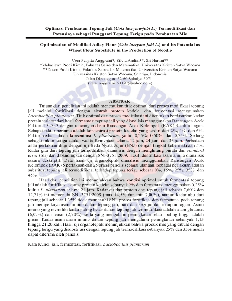 Optimasi Pembuatan Tepung Jali (Coix lacryma-jobi L.) Termodifikasi dan Potensinya sebagai Pengganti Tepung Terigu pada Pembuatan Mie Optimization of Modified Adlay Flour (Coix lacryma-jobi L.) and Its Potential as Wheat Flour Substitute in the Production of Noodle Vera Puspita Anggraini*, Silvia Andini**, Sri Hartini** *Mahasiswa Prodi Kimia, Fakultas Sains dan Matematika, Universitas Kristen Satya Wacana **Dosen Prodi Kimia, Fakultas Sains dan Matematika, Universitas Kristen Satya Wacana Universitas Kristen Satya Wacana, Salatiga, Indonesia Jalan Diponegoro 52-60 Salatiga 50711 (vera_anggraini_91192@yahoo.com) ABSTRAK Tujuan dari penelitian ini adalah menentukan titik optimal dari proses modifikasi tepung jali melalui fortifikasi dengan ekstrak protein kedelai dan fermentasi menggunakan Lactobacillus plantarum. Titik optimal dari proses modifikasi ini ditentukan berdasarkan kadar protein terlarut dari hasil fermentasi tepung jali yang dianalisis menggunakan Rancangan Acak Faktorial 3×3×3 dengan rancangan dasar Rancangan Acak Kelompok (RAK) 3 kali ulangan. Sebagai faktor pertama adalah konsentrasi protein kedelai yang terdiri dari 2%, 4%, dan 6%. Faktor kedua adalah konsentrasi L. plantarum, yaitu: 0,25%; 0,50%; dan 0,75%. Sedang sebagai faktor ketiga adalah waktu fermentasi selama 12 jam, 24 jam, dan 36 jam. Perbedaan antar perlakuan diuji dengan uji Beda Nyata Jujur (BNJ) dengan tingkat kebermaknaan 5%. Kadar gizi dari tepung jali termodifikasi dianalisis dengan menghitung purata dan standard error (SE) dan dibandingkan dengan SNI-3751:2009. Hasil identifikasi asam amino dianalisis secara deskriptif. Data hasil uji organoleptik dianalisis menggunakan Rancangan Acak Kelompok (RAK) 5 perlakuan dan 25 orang panelis sebagai ulangan. Sebagai perlakuan adalah substitusi tepung jali termodifikasi terhadap tepung terigu sebesar 0%, 15%, 25%, 35%, dan 45%. Hasil dari penelitian ini menunjukkan bahwa kondisi optimal untuk fermentasi tepung jali adalah fortifikasi ekstrak protein kedelai sebanyak 2% dan fermentasi menggunakan 0,25% kultur L. plantarum selama 24 jam. Kadar air dan protein dari tepung jali sebesar 7,60% dan 12,71% ini memenuhi SNI-3751:2009 (max 14,5% dan min 7,00%), namun kadar abu dari tepung jali sebesar 1,35% tidak memenuhi SNI. proses fortifikasi dan fermentasi pada tepung jali memperkaya asam amino dalam tepung jali, baik dari segi jumlah maupun ragam. Asam amino yang memiliki kadar paling besar dalam tepung jali termodifikasi adalah asam glutamat (6,07%) dan leusin (2,70%), serta yang mengalami peningkatan relatif paling tinggi adalah glisin. Kadar asam-asam amino dalam tepung jali mengalami peningkatan sebanyak 1,15 hingga 21,20 kali. Hasil uji organoleptik menunjukkan bahwa produk mie yang dibuat dengan tepung terigu yang disubstitusi dengan tepung jali termodifikasi sebanyak 25% dan 35% masih dapat diterima oleh panelis. Kata Kunci: jali, fermentasi, fortifikasi, Lactobacillus plantarum
