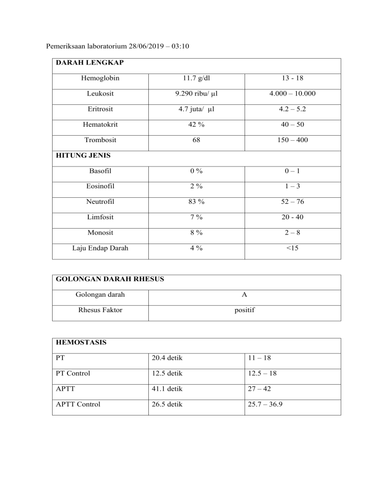 Pemeriksaan laboratorium 28/06/2019 – 03:10 DARAH LENGKAP Hemoglobin 11.7 g/dl 13 - 18 Leukosit 9.290 ribu/ µl 4.000 – 10.000 Eritrosit 4.7 juta/ µl 4.2 – 5.2 Hematokrit 42 % 40 – 50 Trombosit 68 150 – 400 Basofil 0% 0–1 Eosinofil 2% 1–3 Neutrofil 83 % 52 – 76 Limfosit 7% 20 - 40 Monosit 8% 2–8 Laju Endap Darah 4% <15 HITUNG JENIS GOLONGAN DARAH RHESUS Golongan darah A Rhesus Faktor positif HEMOSTASIS PT 20.4 detik 11 – 18 PT Control 12.5 detik 12.5 – 18 APTT 41.1 detik 27 – 42 APTT Control 26.5 detik 25.7 – 36.9 KIMIA KLINIK Glukosa Darah Sewaktu 107 70 – 200 AST (SGOT) 129 U/L < 35 ALT (SGPT) 133 U/L < 41 Ureum 22 mg/dl 15 – 40 Kreatinin 0.8 mg/dl 0.9 – 1.3 Natrium (Na) 135 mmol/L 135 – 147 Kalium (K) 3.0 mmol/L 3.5 – 5.0 Clorida (Cl) 105 mmol/L 94 - 111 ELEKTROLIT