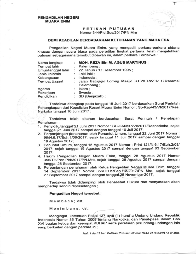 '1. Menyatakan Terdakwa MOH- REZA Bin M. AGUS MARTINUS terbukti secara