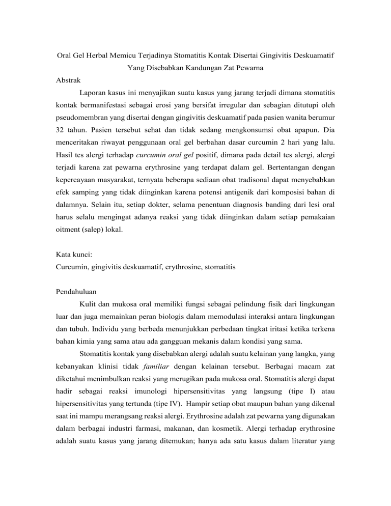 Oral Gel Herbal Memicu Terjadinya Stomatitis Kontak Disertai Gingivitis Deskuamatif Yang Disebabkan Kandungan Zat Pewarna Abstrak Laporan kasus ini menyajikan suatu kasus yang jarang terjadi dimana stomatitis kontak bermanifestasi sebagai erosi yang bersifat irregular dan sebagian ditutupi oleh pseudomembran yang disertai dengan gingivitis deskuamatif pada pasien wanita berumur 32 tahun. Pasien tersebut sehat dan tidak sedang mengkonsumsi obat apapun. Dia menceritakan riwayat penggunaan oral gel berbahan dasar curcumin 2 hari yang lalu. Hasil tes alergi terhadap curcumin oral gel positif, dimana pada detail tes alergi, alergi terjadi karena zat pewarna erythrosine yang terdapat dalam gel. Bertentangan dengan kepercayaan masyarakat, ternyata beberapa sediaan obat tradisonal dapat menyebabkan efek samping yang tidak diinginkan karena potensi antigenik dari komposisi bahan di dalamnya. Selain itu, setiap dokter, selama penentuan diagnosis banding dari lesi oral harus selalu mengingat adanya reaksi yang tidak diinginkan dalam setiap pemakaian oitment (salep) lokal. Kata kunci: Curcumin, gingivitis deskuamatif, erythrosine, stomatitis Pendahuluan Kulit dan mukosa oral memiliki fungsi sebagai pelindung fisik dari lingkungan luar dan juga memainkan peran biologis dalam memodulasi interaksi antara lingkungan dan tubuh. Individu yang berbeda menunjukkan perbedaan tingkat iritasi ketika terkena bahan kimia yang sama atau ada gangguan mekanis dalam kondisi yang sama. Stomatitis kontak yang disebabkan alergi adalah suatu kelainan yang langka, yang kebanyakan klinisi tidak familiar dengan kelainan tersebut. Berbagai macam zat diketahui menimbulkan reaksi yang merugikan pada mukosa oral. Stomatitis alergi dapat hadir sebagai reaksi imunologi hipersensitivitas yang langsung (tipe I) atau hipersensitivitas yang tertunda (tipe IV). Hampir setiap obat maupun bahan yang dikenal saat ini mampu merangsang reaksi alergi. Erythrosine adalah zat pewarna yang digunakan dalam berbagai industri farmasi, makanan, dan kosmetik. Alergi terhadap erythrosine adalah suatu kasus yang jarang ditemukan; hanya ada satu kasus dalam literatur yang telah didokumentasikan sampai saat ini. Penulis dalam studi kasus tersebut berspekulasi bahwa penggunaan erythrosine dalam bahan gigi tiruan bertanggung jawab dalam terjadinya denture stomatitis. Laporan Kasus Seorang pasien wanita 32 tahun dilaporkan ke Departemen of Periodontology, Bhojia Gigi College dan Rumah Sakit, Baddi Himachal Pradesh dengan keluhan utama nyeri, ulser, dan pembengkakan di bibir. Kemudian, pasien tersebut mengeluh sakit dan sensitivitas pada gusi terhadap apa pun yang dia makan. Pasien sehat dan tidak sedang mengonsumsi obat-obatan apapun. Tidak ditemukan adanya alergi obat, dan riwayat medis menunjukkan tidak adanya penyakit sistemik. Pasien tersebut dilaporkan pernah mengalami riwayat trauma 1 bulan yang lalu dimana ia menderita luka di bibirnya dan dilakukan penjahitan pada mukosa labial atas dan bawah oleh dokter pribadinya dan pemberian obat untuk kasus tersebut telah dihentikan setelah 1 minggu dari kecelakaan tersebut. Jahitan dibuka dengan aplikasi lignocaine gel dan setelah pembukaan jahitan, pasien tersebut diresepkan oral gel berbahan dasar curcumin untuk aplikasi lokal dirumah. Setelah penggunaan curcumin gel; setelah 1 hari, dia merasakan ruam kemerahan di seluruh mukosa yang kemudian berkembang menjadi ulser multiple dalam kurun waktu 1-3 hari. Pada pemeriksaan, erosi bersifat irregular dimana sebagian permukaan ditutupi oleh pseudomembran yang terjadi pada kedua bibir dan mukosa mulut disertai dengan pembengkakan pada bibir. Erosi muncul dengan batas jelas, berwarna keputihan, dan berdaerah kasar. Ulserasi sebagian besar ditutupi oleh eksudat kuning-putih dan disertai dengan halo eritematosa (batas kemerahan). Terlihat adanya tanda dari gingivitis deskuamatif, seperti eritematosa gingiva dan diskrit erosi yang melibatkan kedua lengkung rahang. Kemunculan lesi tidak disertai dengan gejala sistemik, dan tidak ada bagian tubuh lain yang terlibat. Lesi mulai berkembang setelah dua sampai tiga kali aplikasi dari oitment curcumin. Kondisi pasien cukup terganggu dikarenakan pasien tersebut tidak bisa makan dan menelan. Pasien tersebut juga mengalami kesulitan saat berbicara terlalu banyak [Gambar 1-3]. Pasien diminta untuk menghentikan aplikasi topikal oral gel berbahan dasar curcumin, dan lesi dibersihkan dengan povidone-iodine dan larutan saline pada setiap kunjungan. Pasien diberi resep antihistamin sistemik (pheniramine maleat), antiinflamasi nonsteroid (parasetamol), dan topikal steroid (betametason valerate). Lesi mereda dalam 1 minggu setelah perawatan [Gambar 4-6]. Pasien diminta datang kembali untuk tes alergi setelah 15 hari. Tes alergi patch dilakukan pada lengan pasien menggunakan Finn chambers (Systopic Laboratories), sebagai kontrol (a), curcumin (b), curcumin oral gel (c) dan lignocaine oral gel (d). Setelah 4 hari, patch kemudian dibuang, dan tes alergi untuk c ditemukan positif [Gambar 7 dan 8]. Setelah ditemukan alergi, komposisi oitment yang berbahan dasar curcumin diteliti satu persatu dan patch test diulang kembali pada lengan pasien dengan bahan tersebut satu persatu (ROHA Dyechem Pvt. Ltd, Curcumin, Titanium Dioksida, Brilliant Blue FCF, Erythrosine) selama 1 bulan. Enam chamber (ruang) dari strip diberi nomor dari 1 sampai 6. Curcumin gel oral (1), curcumin (2), erythrosin (3), Brilliant Blue FCF (4), titanium dioksida (5) dan kontrol (6), masing-masing dari 1 hingga 6. Curcumin (2), erythrosin (3), Brilliant Blue FCF (4), titanium dioksida (5) dicampur dengan air steril untuk test patch. Setelah 4 hari, patch dibuang, dan hasilnya ditemukan alergi pada oral gel berbahan dasar curcumin dan alergi bahan erythrosin (3) juga ditemukan positif. Oleh karena itu, dapat disimpulkan alergi terjadi karena zat pewarna yang ditambahkan ke dalam oitment [Gambar 9-11]. Diskusi Diagnosis banding dari ulkus oral multiple adalah ulkus aphthous