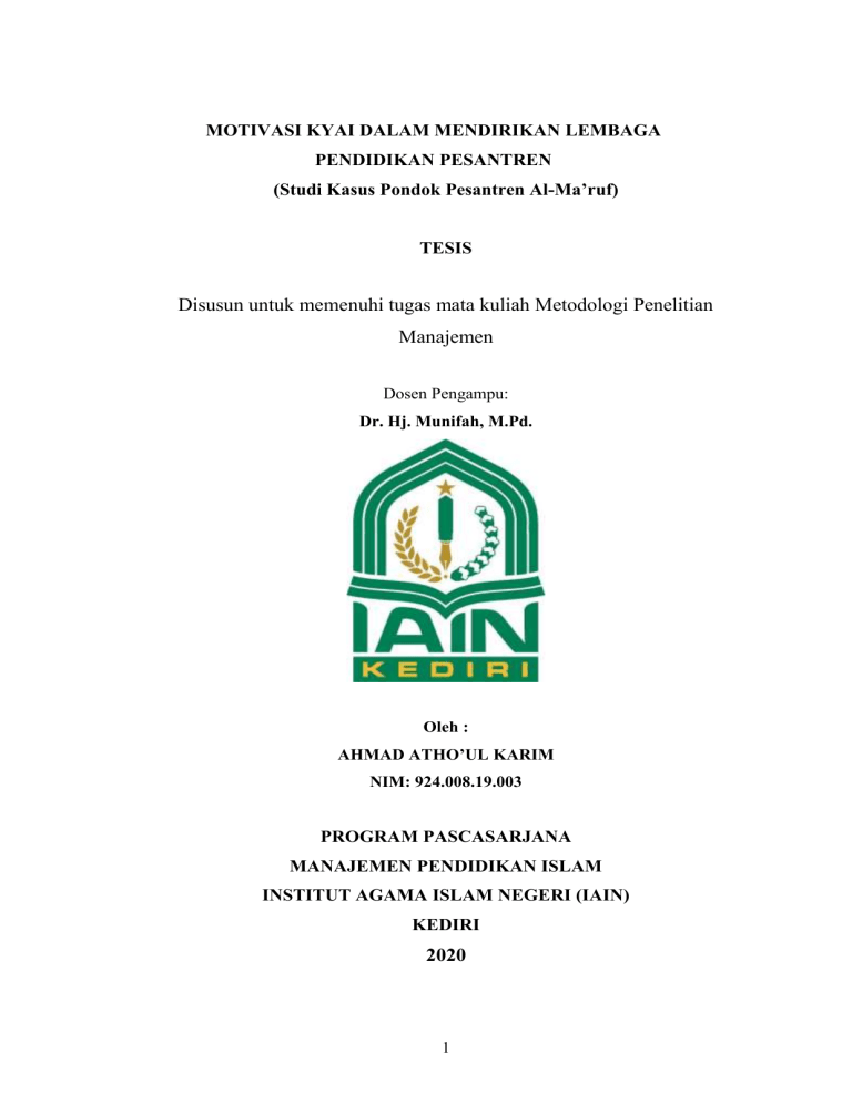 MOTIVASI KYAI DALAM MENDIRIKAN LEMBAGA PENDIDIKAN PESANTREN (Studi Kasus Pondok Pesantren Al-Ma’ruf) TESIS Disusun untuk memenuhi tugas mata kuliah Metodologi Penelitian Manajemen Dosen Pengampu: Dr. Hj. Munifah, M.Pd. Oleh : AHMAD ATHO’UL KARIM NIM: 924.008.19.003 PROGRAM PASCASARJANA MANAJEMEN PENDIDIKAN ISLAM INSTITUT AGAMA ISLAM NEGERI (IAIN) KEDIRI 2020 1 BAB I PENDAHULUAN A. KONTEKS PENELITIAN Secara historis, pesantren juga mengandung makna kemurnian Indonesia, bukan hanya bermakna keagamaan. Karena awal mula suatu lembaga pesantren sesungguhnya telah ada sejak zaman Hindu-Budha, dan Islam datang sebagai penerus, pelestari, serta perombak sistem pendidikan yang lebih dahulu berkembang di Indonesia, seperti sistem pendidikan Hindu atau Budha. Menurut catatan sejarah Islam di Indonesia, pesantren telah berdiri pada abad ke-13 yang mana saat itu masih sebatas tempat mengaji dan belajar di bangunan kecil seperti gubuk. Setelah beberapa abad, pendidikan Islam semakin berkembang dengan adanya beberapa tempat pengajian. Dari ini, kemudian berdirilah tempat-tempat menginap atau asrama bagi para santri, yang mana disebutlah Pesantren. Sejarah berdirinya Indonesia tidak lepas dari keikutsertaan Pesantren dan para tokohnya yang menata dan mewarnai pola kemasyarakatan yang mana berbasis agama dan budaya. Pesantren di Indonesia tidak seperti Pesantren di Turki dan Mesir, seperti ungkapan Ayzumardi Azra dalam pengantarnya di buku Bilik-Bilik Pesantren karya Nur Cholis Majid, dimana sistem pendidikan klasik yang ada di Turki pada era Musthafa kemal Ataturk dan Mesir pada era Gamal Abdul Nashir yang membekukan sistem Madrasah dan Kuttab, kemudian mengganti kebentuk sistem pendidikan umum. Situasi-situasi sosiologis dan politis yang mengitari pesantren di Indonesia, serta perbedaan-perbedaan tersebut pada gilirannya membuat pesantren mampu bertahan sampe saat ini. Ada dua kelompok pesantren yaitu pesantren salaf (tradisional) dan khalaf (modern). Secara garis besar, ciri-ciri dua kelompok tersebut tidak ada perbedaan, namun secara kenyataan terdapat perbedaan-perbedaan terlebih jika dilihat dari apa yang diajarkan. Pesantren salaf (tradisional) merupakan suatu kelompok pesantren 2 yang masih menggunakan sistem pendidikan klasikal, seperti sorogan, wetonan/bandongan, kajian dari permintaan masyarakat atau permintaan santri kepada kyainya untuk diajarkan kitab-kitab tertentu, dan lain sebagainya, serta mempertahankan kitab-kitab klasik Islam (kitab kuning). Namun disisi lain, santri-santri dari pesantren salaf dinilai lambat dalam merespon arus modernisasi. Kebanyakan cenderung tekstual serta terlihat klasik dan kurang mampu dalam aspek literasi, karena terlalu rapat menutup diri dari perkembangan zaman. Sehingga masyarakat muslim Indonesia mempertanyakan reputasi pesantren, karena mayoritas pesantren terkesan elitis, jauh dari realita sosial, bahkan ada yang mengatakan bahwa lulusan pesantren kalah Islami dengan kelompok hijrah. Ditambah lagi, problem sosialisai dan aktualisasi ini dengan problem keilmuan, diantaranya terjadinya kesenjangan, keterasingan dan differensiasi pembedaan antara keilmuan pesantren dengan dunia modern. Belum lagi pesantren yang dihadapkan kepada masalah-masalah globalisasi, yang dapat dipastikan telah menjadi tanggung jawab yang berat bagi pesantren. Dalam konteks dilematis ini, pilihan terbaik bagi santri di pesantren adalah mendialogkannya dengan paradigma dan pandangan dunia yang telah diwariskan oleh generasi pencerahan Islam. Bahwasanya pesantren perlu memosisikan warisan masa lalu sebagai teman dialog bagi modernitas dengan segala produk yang ditawarkannya, maka dari itu pesantren harus membaca khazanah lama dan baru dalam frame yang terpisah. Dengan menghadirkan warisan lama pesantren dan dihadapkan dengan masa kekinian. Bisa jadi warisan lama tersebut terkesan basi, namun tidak menutup kemungkinan masih ada potensi untuk dikembangkan pada masa sekarang atau bahkan masa depan. Sebenarnya sekarang ini telah berlangsung proses dialektika antara tradisi dan modernitas, terutama dilingkungan pesantren yang masih kuat mengusung tradisi. Oleh karena itu, pesantren tersebut pada masa yang akan datang bukan tidak mungkin menjelma menjadi sebuah institusi yang dapat diandalkan baik itu di bidang ilmu agama ataupun ilmu pengetahuan. Oleh karena itu, penting bagi pesantren sebagai sebuah lembaga 3 Tafaqquh Fiddin untuk melestarikan dan memodifikasi paradigma: “Mempertahankan warisan lama yang masih relevan dan mengambil hal terbaru yang lebih baik” kalau perlu malah mengkreasi hal baru tersebut menjadi lebih baik. Secara geologis, pemilihan tempat di Kediri dikarenakan Kediri merupakan salah satu Kota dan Kabupaten yang memiliki banyak pondok pesantren salafi dan juga di kenal akrab dikalangan masyarakat akan pondok pesantren salafinya. Oleh karena itu menjadi sala satu acuan orang tua untuk menempatkan anaknya di Pondok Pesantren. Dari fenomena-fenomena tersebut baik secara historis maupun geografis, maka dari itu inisiatif penulis untuk memilih judul “Motivasi Kyai dalam Medirikan Lembaga Pendidikan Pesantren (Studi Kasus Pondok Pesantren di Kediri)”. B. FOKUS PENELITIAN Penelitina ini di fokuskan pada motivasi Kyai dalam mendirikan lembaga pendidikan Pesantren yang meliputi: 1. Bagaimana Peran Lembaga Pendidikan Pesantren dalam Pandangan Masyarakat? 2. Bagaimana Motivasi Kyai dalam mendirikan Lembaga Pendidikan Pesantren di era sekarang? C. TUJUAN PENELITIAN 1. Untuk mendeskripsikan lembaga pendidikan pesantren dalam pandangan masyarakat. 2. Untuk mendeskripsikan motivasi Kyai dalam mendirikan Lembaga Pendidikan Pesantren di era sekarang. D. KEGUNAAN PENELITIAN 1. Bagi masyarakat sebagai wawasan dalam mendirikan lembaga pendidikan pesantren. 2. Bagi peneliti dapat dijadikan input referensi dan dikembangkan untuk 4 penelitian yang berkaitan dengan penelitian ini. E. PENELITIAN TERDAHULU 1. Dengan hasil: Tipologi Kyai di Lirboyo antara lain Kyai pasif, Kyai adapti
