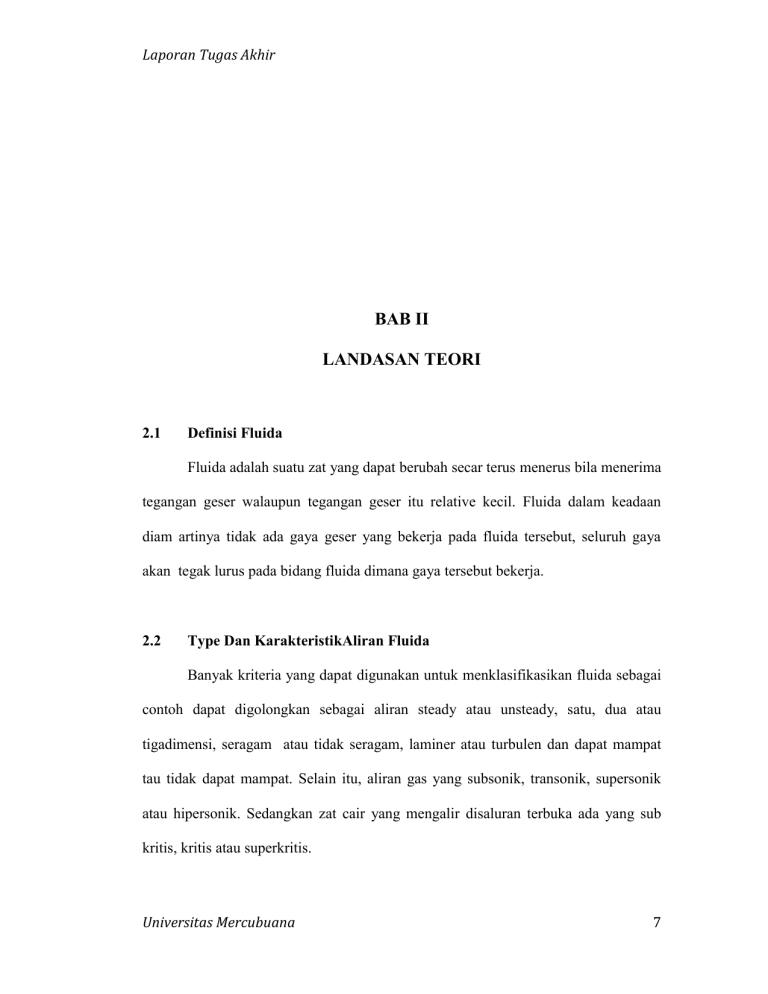 Laporan Tugas Akhir BAB II LANDASAN TEORI 2.1 Definisi Fluida Fluida adalah suatu zat yang dapat berubah secar terus menerus bila menerima tegangan geser walaupun tegangan geser itu relative kecil. Fluida dalam keadaan diam artinya tidak ada gaya geser yang bekerja pada fluida tersebut, seluruh gaya akan tegak lurus pada bidang fluida dimana gaya tersebut bekerja. 2.2 Type Dan KarakteristikAliran Fluida Banyak kriteria yang dapat digunakan untuk menklasifikasikan fluida sebagai contoh dapat digolongkan sebagai aliran steady atau unsteady, satu, dua atau tigadimensi, seragam atau tidak seragam, laminer atau turbulen dan dapat mampat tau tidak dapat mampat. Selain itu, aliran gas yang subsonik, transonik, supersonik atau hipersonik. Sedangkan zat cair yang mengalir disaluran terbuka ada yang sub kritis, kritis atau superkritis. Universitas Mercubuana 7 Laporan Tugas Akhir 2.2.1 Karakteristik Aliran Fluida Secara garis besar karkteristik aliran fluida dapat dibedakan atau dikelompokan sebagai berikut: a. Steady Flow (Tunak) : Adalah dimana kecepatannya tidak terpengaruh oleh perubahan waktu, sehingga kecepatannya konstan pada titik (dimanapun juga). 𝜕𝑢 𝜕𝑡 =0 b. Uniform Flow (seragam) : Terjadi apabila kecepatan besar dan arah dari titik kecepatan tidak berubah dari titik kecepatan tidak berubah dari titik ketitik dalam fluida. 𝜕𝑢 𝜕𝑎 c. =0 Non Steady Flow: Terjadi apabila ada suatu perubahan kecepatan terhadap perubahan waktu (ada percepatan). 𝜕𝑢 𝜕𝑡 d. ≠0 Non Uniform Flow: U dan A (kecepatan dan penampang) berubah sepanjang lintasan. 𝜕𝑢 𝜕𝑎 ≠0 Universitas Mercubuana 8 Laporan Tugas Akhir Dari keempat type aliran tersebut dapat terjadi 4 jenis kemungkinan aliran 1. Steady Uniform Flow Aliran tidak berubah terhadap letak dan waktu kecepatan dan potongan bidangaliran dimana-mana akan sama. Contoh: Kecepatan aliran dalam pipa yang mempunyai diameter yang uniform 2. Steady-Non Uniform Flow Aliran mungkin akan berubah terhadap letaknya akan tetapi tidak bervariasi terhadap waktu. Kecepatan dan potongan bidang dari alirannya mungkin akan berubah dari satu potongan kepotongan lain. Tetapi setiap potongan tidak akan bervariasi terhadap waktu. 3. Non Steady - Uniform Flow Pada suatu kecepatan disetiap titik akan sama tetapi kecepatan akan bervariasi terhadap perubahan waktu. Contoh: Aliran yang mempunyai kecepatan, mengalir pada pipa yang berdiameter konstan seperti yang terjadi pada saat pompa mulai dihidupkan. 4. Non Steady Non Uniform Flow Potongan bidang aliran dan kecepatannya berubah dari titik ketitik, juga berubah dari waktu kewaktu. Contoh : Aliran yang bergelombang, mengalir melalui suatu saluran. e. Compressible Flow : ( kerapatan ) berubah-ubah. f. Incompressible Flow : Konstan sepanjang lintasan Universitas Mercubuana 9 Laporan Tugas Akhir 2.2.2 Type Aliran Fluida Dapat dibedakan dalam beberapa type antara lain : a. One dimensional flow Adalah aliran dimana parameter-parameternya mempunyai gradien dalam satu arah, sama dengan arah aliran (x). b. Two dimensional flow Parameternya mempunyai gradien dalam 2 (dua) arah, arah aliran (x) dan arah (tegak lurus) aliran y. c. Three dimensional flow Parameternya mempunyai gradien dalam 3 (tiga) arah, arah aliran (x), arah (y) dan (z) aliran. d. Laminar Flow Tidak terjadi percampuran partikel antar lapisan. e. Turbulent Flow Terjadi percampuran partikel antar lapisan. f. Subsonic flow Alirannya Kecepatan suara. g. Transonic flow Alirannya = Kecepatan Suara h. Supersonic flow Alirannya Kecepatan suara. i. Hypersonic flow Alirannya Kecepatan suara. Universitas Mercubuana 10 Laporan Tugas Akhir j. Critical flow Alirannya = Permukaan gelombang elementer. k. Sub critical flow Alirannya < Permukaan gelombang elementer. l. Super critical flow Alirannya > Permukaan gelombang elementer. 2.2.3 Faktor Yang Mempengaruhi Aliran Fluida Ada beberapa factor yang mempengaruhi aliran fluida, yaitu : a. Laju Aliran Volume Laju aliran volume disebut juga debit aliran (Q) yaitu jumlah volume aliran per satuan waktu. Debit aliran dapat dituliskan pada persamaan sebagai berikut : Q = A V ……………………………........….. (2.1) Dimana : V = Kecepatan aliran [m/s] A = Luas penampang pipa [m] Q = Debit aliran [m²/s] Universitas Mercubuana 11 Laporan Tugas Akhir Selain persamaan di atas dapat juga menggunakan persamaaan sebagai berikut : 𝑸= Dimana : 𝒗 𝒕 …………………………………….. (2.2) v = Volume aliran [m³] Q = Debit aliran [m²/s] t = waktu aliran [s] b. Kecepatan fluida (V) Didefinisikan besarnya debit aliran yang mengalir persatuan luas. 𝒖= Dimana : 𝑸 𝒂 …………...…......................……… (2.3) u = kecepatan atau laju aliran ( m/sec) Q = debit aliran ( m³/ sec ) A = Luas penampang ( m² ) 2.3 Klasifikasi Fluida Fluida merupakan suatu zat yang tidak mampu menahan gaya geser yang bekerja sehingga akan mengalami deformasi. Fluida dapat diklasifikasikan menjadi beberapa bagian tetapi secara garis besar fluida dapat diklasifikasikan menjadi dua bagian, yaitu : 2.3.1 Fluida Newtonian Fluida Newtonian adalah suatu jenis fluida yang memiliki kurva shear stress dan gradient kecepatan yang linier, seperti air, udara, ethanol, benzene, dll. Fluida Newtonian akan terus mengalir dan viskositas fluida tidak berubah sekalipun terdapat gaya yang bekerja pada fluida. Viskositas fluida akan berubah jika terjadi perubahan Universitas Mercubuana 12 Laporan Tugas Akhir temperature. Pada dasarnya fluida Newtonian adalah fluida yang mengikuti hukum Newton tentang aliran dengan persamaan : 𝝉=𝝁 Dimana : 𝝏𝒖 …………...…......................……… (2.4) 𝝏𝒚 τ = Tegangan geser pada fluida. μ= Viskositas dinamik fluida. ∂u ∂y 2.3.2 = Gradient kecepatan fluida. Fluida Non-Newtonian Fluida Non-Newtonian adalah fluida yang tidak tahan terhadap tegangan geser (shear stress), gradient kecepatan (shear rate), dan temperature seperti cat, minyak pelumas, darah