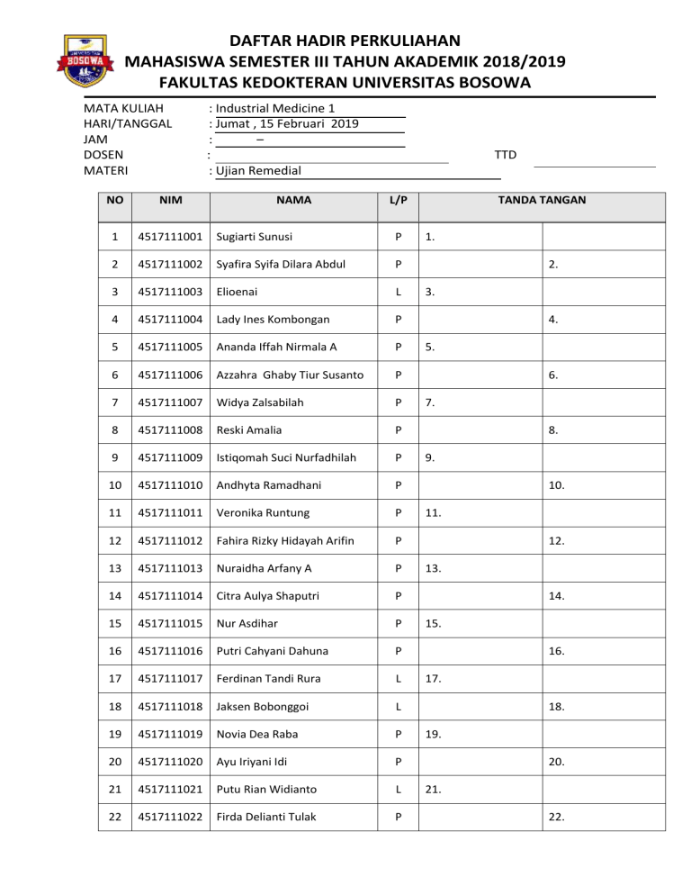 DAFTAR HADIR PERKULIAHAN MAHASISWA SEMESTER III TAHUN AKADEMIK 2018/2019 FAKULTAS KEDOKTERAN UNIVERSITAS BOSOWA MATA KULIAH HARI/TANGGAL JAM DOSEN MATERI : Industrial Medicine 1 : Jumat , 15 Februari 2019 : – : : Ujian Remedial NAMA TTD NO NIM L/P 1 4517111001 Sugiarti Sunusi P 2 4517111002 Syafira Syifa Dilara Abdul P 3 4517111003 Elioenai L 4 4517111004 Lady Ines Kombongan P 5 4517111005 Ananda Iffah Nirmala A P 6 4517111006 Azzahra Ghaby Tiur Susanto P 7 4517111007 Widya Zalsabilah P 8 4517111008 Reski Amalia P 9 4517111009 Istiqomah Suci Nurfadhilah P 10 4517111010 Andhyta Ramadhani P 11 4517111011 Veronika Runtung P 12 4517111012 Fahira Rizky Hidayah Arifin P 13 4517111013 Nuraidha Arfany A P 14 4517111014 Citra Aulya Shaputri P 15 4517111015 Nur Asdihar P 16 4517111016 Putri Cahyani Dahuna P 17 4517111017 Ferdinan Tandi Rura L 18 4517111018 Jaksen Bobonggoi L 19 4517111019 Novia Dea Raba P 20 4517111020 Ayu Iriyani Idi P 21 4517111021 Putu Rian Widianto L 22 4517111022 Firda Delianti Tulak P TANDA TANGAN 1. 2. 3. 4. 5. 6. 7. 8. 9. 10. 11. 12. 13. 14. 15. 16. 17. 18. 19. 20. 21. 22. 23 4517111023 Magfirah Tuzzahrah P 24 4517111024 Mohammad Alief Iqra L 25 4517111025 Yushak Elzhadai SM L 26 4517111026 Abdul Rahim L 27 4517111027 Henrika Liliani Rappan P 28 4517111028 Fitrah Mayani P 29 4517111029 Larasati Tiara Mundari P 30 4517111030 Karmila Dewi P 31 4517111031 Widiyanti P 32 4517111032 Kamal Muqtadir Risq L 33 4517111033 Irwan L 34 4517111034 Rini Septiani P 35 4517111035 Rabiah Alwahhab P 36 4517111036 Nelci Kayame P 37 4517111037 Mega Syahruddin P 38 4517111038 Silvia Rante Tonapa P 39 4517111039 Astuti Yunus P 40 4517111040 Andi Dian Ameliana P 41 4517111041 Destri Neli Aris P 42 4517111042 Nur Azizah Pratiwi P 43 4517111043 Anisa Lumalin P 44 4517111044 Jelita Arung Palobo P 45 4517111045 Andriano L 46 4517111046 Sahra Fadillah M P 47 4517111047 Zakiah Rahma Tahrim P 48 4517111048 Muh. Riza Arif Vitaria L 49 4517111049 Calvin Wijaya L 50 4517111050 Moch. Fauzal Muqsit L 23. 24. 25. 26. 27. 28. 29. 30. 31. 32. 33. 34. 35. 36. 37. 38. 39. 40. 41. 42. 43. 44. 45. 46. 47. 48. 49. 50.