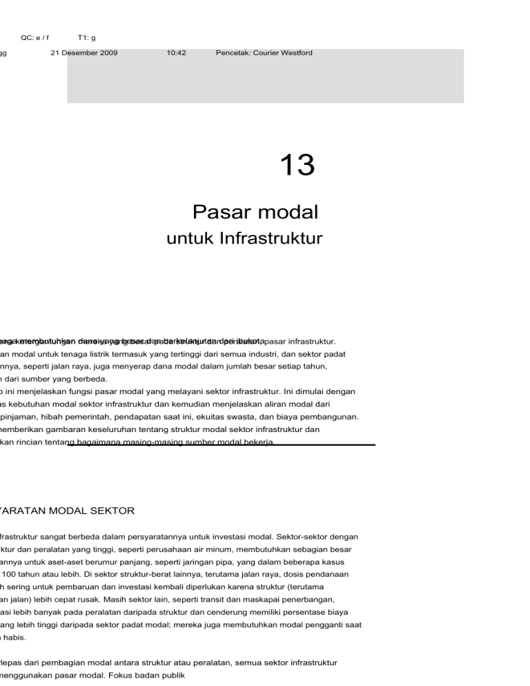 QC: e / f gg T1: g 21 Desember 2009 10:42 Pencetak: Courier Westford BAB 13 Pasar modal untuk Infrastruktur baga membutuhkan dana yang besar dan berkelanjutan ibukotapasar infrastruktur. ena ketergantungan mereka yang besar pada struktur dandari peralatan, an modal untuk tenaga listrik termasuk yang tertinggi dari semua industri, dan sektor padat nnya, seperti jalan raya, juga menyerap dana modal dalam jumlah besar setiap tahun, n dari sumber yang berbeda. b ini menjelaskan fungsi pasar modal yang melayani sektor infrastruktur. Ini dimulai dengan as kebutuhan modal sektor infrastruktur dan kemudian menjelaskan aliran modal dari pinjaman, hibah pemerintah, pendapatan saat ini, ekuitas swasta, dan biaya pembangunan. memberikan gambaran keseluruhan tentang struktur modal sektor infrastruktur dan kan rincian tentang bagaimana masing-masing sumber modal bekerja. YARATAN MODAL SEKTOR frastruktur sangat berbeda dalam persyaratannya untuk investasi modal. Sektor-sektor dengan uktur dan peralatan yang tinggi, seperti perusahaan air minum, membutuhkan sebagian besar annya untuk aset-aset berumur panjang, seperti jaringan pipa, yang dalam beberapa kasus 100 tahun atau lebih. Di sektor struktur-berat lainnya, terutama jalan raya, dosis pendanaan h sering untuk pembaruan dan investasi kembali diperlukan karena struktur (terutama an jalan) lebih cepat rusak. Masih sektor lain, seperti transit dan maskapai penerbangan, tasi lebih banyak pada peralatan daripada struktur dan cenderung memiliki persentase biaya yang lebih tinggi daripada sektor padat modal; mereka juga membutuhkan modal pengganti saat n habis. rlepas dari pembagian modal antara struktur atau peralatan, semua sektor infrastruktur menggunakan pasar modal. Fokus badan publik T1: g QC: e / f gg 21 Desember 2009 10:42 Pencetak: Courier Westford INFRASTRUKTUR PEMBIAYAAN obligasi bebas pajak; perusahaan infrastruktur swasta, seperti utilitas tenaga listrik, nakan obligasi korporasi, kas, dan ekuitas. Tentu saja, pemasok penyedia infrastruktur dari wasta menggunakan sumber dana modal yang sama dengan bisnis lain. lanja modal oleh badan publik biasanya disalurkan melalui proses perencanaan, aman, dan penganggaran yang komprehensif. Penganggaran modal adalah proses penting etiga tingkat pemerintahan, terutama di tingkat pemerintah daerah, di mana perusahaan ktur banyak ditemukan. Dalam proses anggaran di tingkat pemerintah daerah, mudah untuk mengapa "semua politik adalah lokal". oses penganggaran ibu kota daerah perlu dipahami karena proses tersebut menentukan n besar investasi di tingkat daerah, tempat sebagian besar belanja infrastruktur terjadi. Di okal, rencana terintegrasi disebut rencana komprehensif, rencana kebijakan, dan dengan in, seperti Visi 2020 untuk Metropolis, atau yang serupa. Tugas manajer infrastruktur adalah mahkan garis besar rencana ini ke dalam program infrastruktur khusus dan membuat ran dari dunia perencanaan ke dunia teknik dan keuangan. rencanaan modal dimulai dengan perencanaan terintegrasi dan bergerak melalui proses: embagi rencana untuk sektor infrastruktur atau zona kota Perencanaan ktor, seperti rencana jalan induk Memperoleh rencana peningkatan modal ng luas Mengisolasi proyek atau sistem untuk perencanaan lebih lanjut embagi proyek menjadi subproyek atau tahapan inkremental Perencanaan ci untuk subproyek emrograman subproyek selama tahun konstruksi Memperoleh rsetujuan untuk program peningkatan modal Menentukan metode untuk endanai anggaran modal enerbitkan rencana peningkatan modal dalam program modal dan anggaran entitas merintah negara bagian memiliki anggaran modal, tetapi di tingkat nasional, belum gkinkan untuk menyelenggarakan proses penganggaran modal yang koheren karena politik ggaran sangat kompleks dan kontroversial. Meski demikian, topik anggaran modal nasional kaji (Komisi Presiden untuk Kajian Anggaran Modal, 1999). Saat ini, keuangan federal sangat g ke pengeluaran defisit, yang sebagian besar telah dialokasikan untuk belanja modal untuk mulus. Meskipun bagian anggaran ini tidak dianggap sebagai anggaran modal semata, tah federal menyimpan catatan pemisahan antara pengeluaran yang sedang berlangsung geluaran modal. T1: g QC: e / f gg 21 Desember 2009 10:42 Pencetak: Courier Westford 267 dal untuk Infrastruktur N MODAL INFRASTRUKTUR mum pendanaan modal infrastruktur diilustrasikan oleh Bagan 13.1, yang menunjukkan na aset finansial menyediakan pendanaan untuk pasar modal, yang pada gilirannya akan pendanaan untuk sektor infrastruktur serta untuk kebutuhan modal lainnya bagi bisnis vidu. Dana investasi berasal dari aset keuangan yang dikelola oleh individu, bank, aan investasi, dan lembaga keuangan lainnya. Mereka mengalir sebagai sumber modal entuk pinjaman hipotek, obligasi, pembelian saham, pinjaman, biaya, hibah, dan kepemilikan swasta. Investasi modal masuk ke sektor infrastruktur, yang menghasilkan layanan yang aat bagi individu, bisnis, dan pemerintah dan oleh karena itu menguntungkan aset keuangan membuat ekonomi lebih produktif. Modal sumber euangan aktiva ungan dan estasi Pinjaman hipotek Infrastruktur investasi Konstruksi bangunan Hak Tanggungan- terkait Energi sekuritas AN 13.1 Arus Modal untuk Infrastruktur Pasar obligasi Jalan dan jembatan Komunikasi Penerbitan saham Air / air limbah Pinjaman Hibah Biaya Ekuitas pribadi Produktivitas infrastruktur Penerbangan dan kereta api Transit Penanganan limbah T1: g QC: e / f gg 21 Desember 2009 10:42 Pencetak: Courier Westford INFRASTRUKTUR PEMBIAYAAN ntu saja, pandangan seperti Tampilan 13.1 tampaknya menunjukkan bahwa penawaran ersifat tetap. Namun, aset keuangan yang ditunjukkan pada angka tersebut sangat uasi, dan modal untuk diinvestasikan dalam sistem infrastruktur AS tidak harus datang dari AS. Bagaimanapun, neraca rumah tangga yang dikelola oleh Federal Reserve Bank (2009b) ukkan real estat rumah tangga pada $ 17,9 triliun dan semua kekayaan bersih pada $ 50,4 ada akhir kuartal pertama tahun 2009. Angka kekayaan bersih termasuk perusahaan